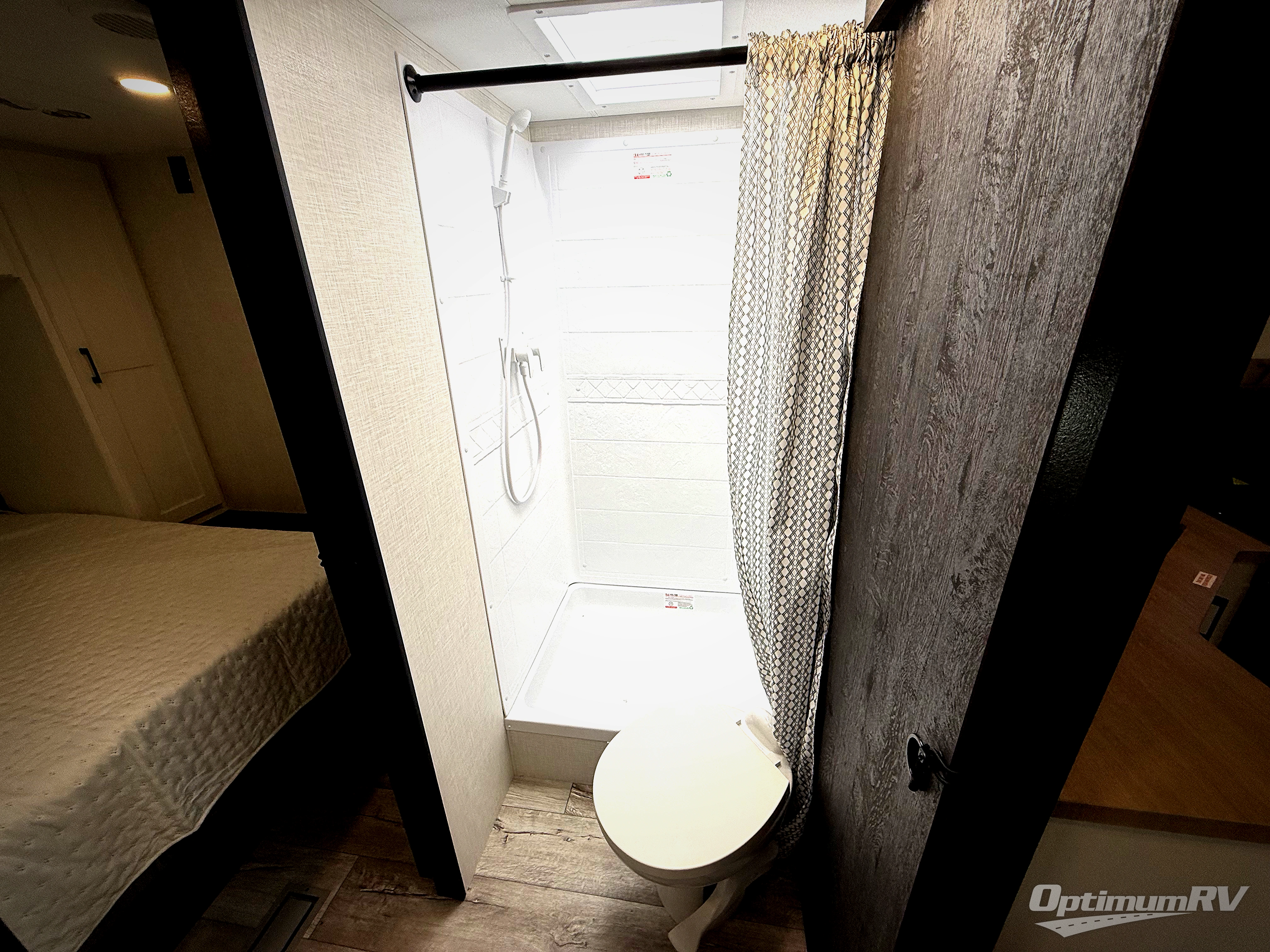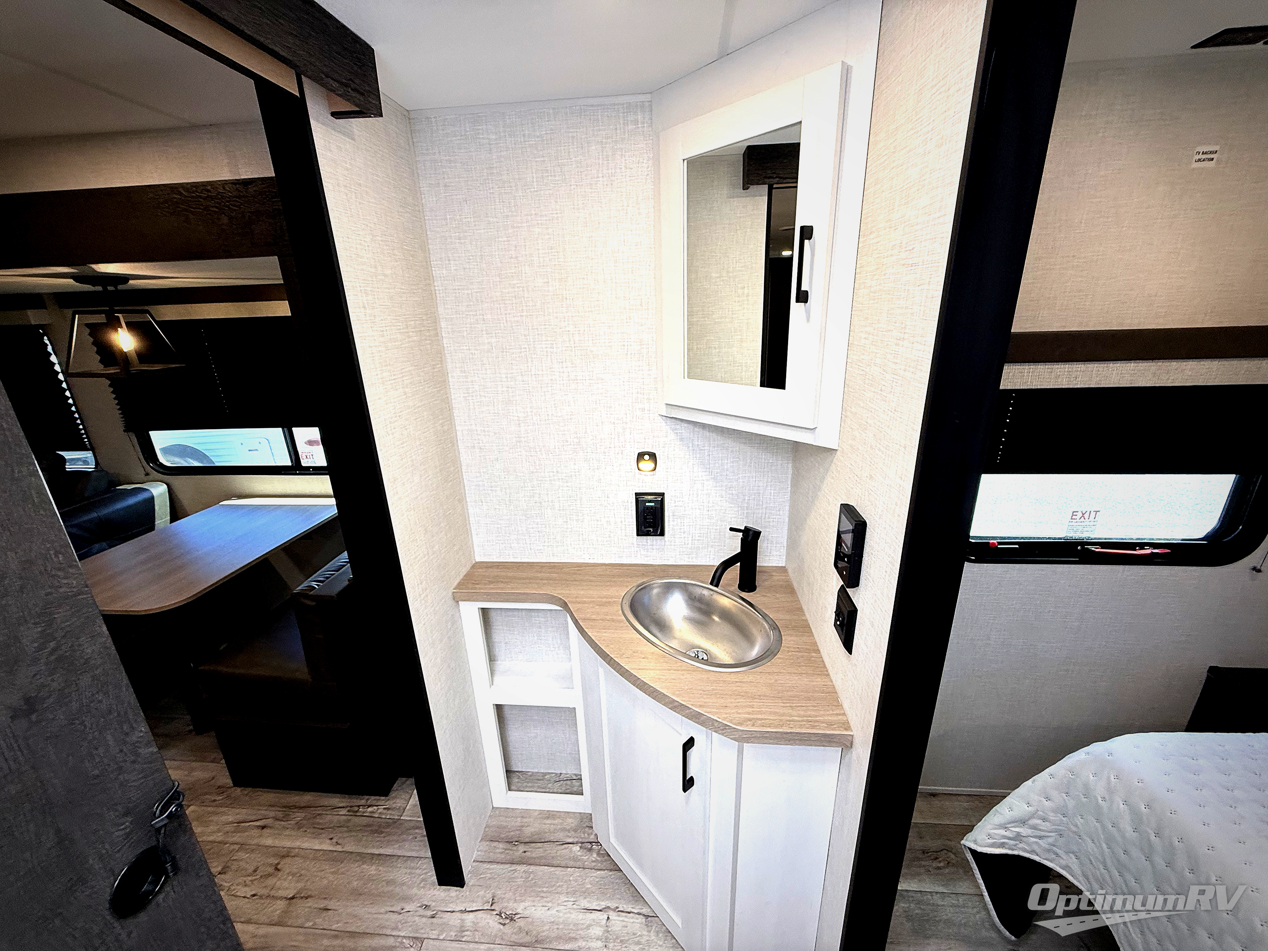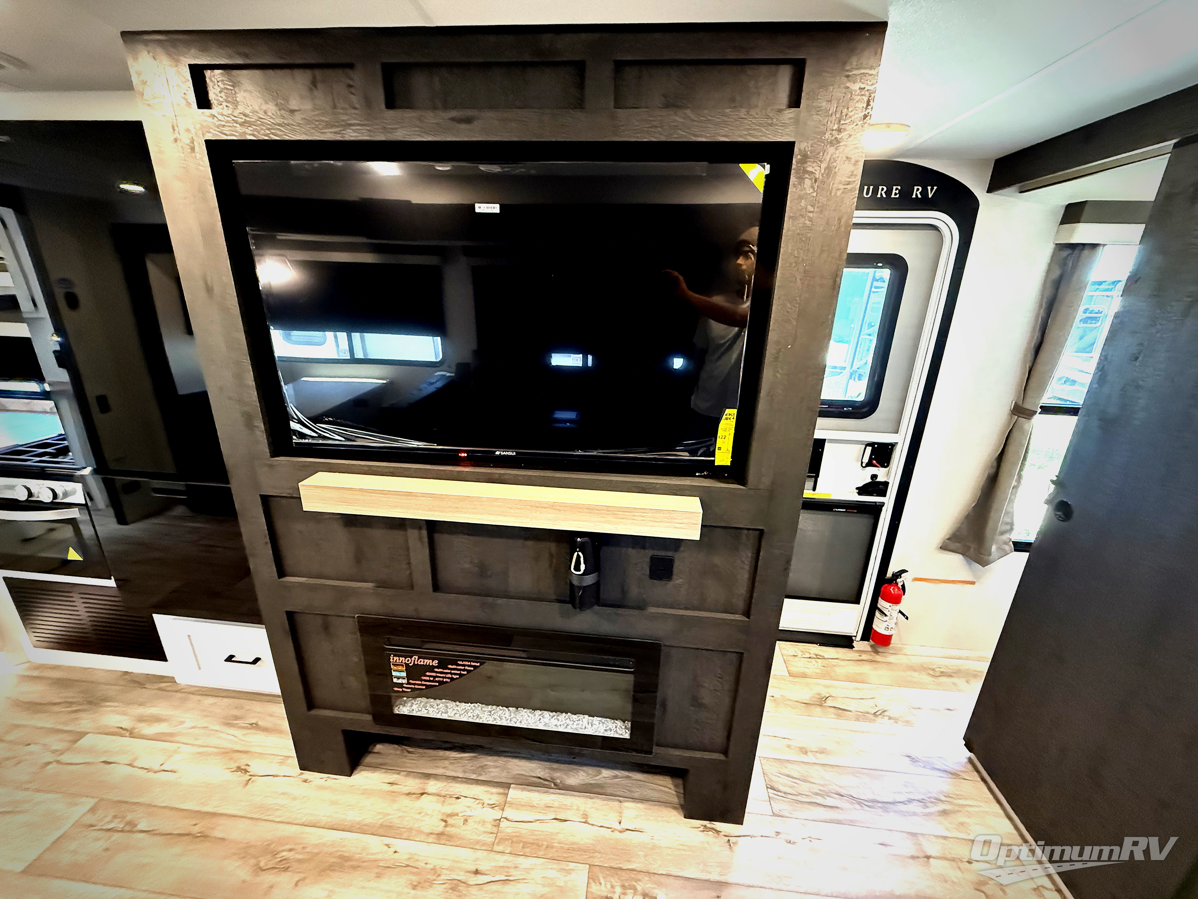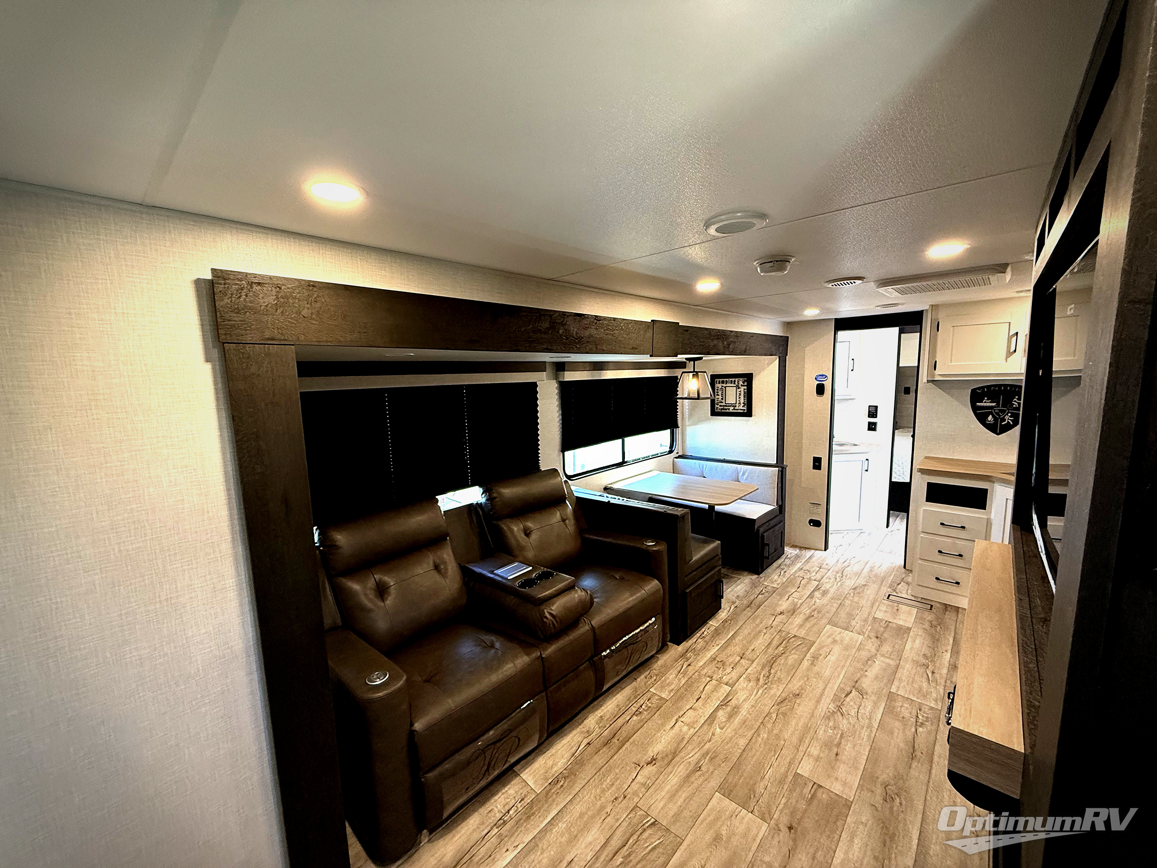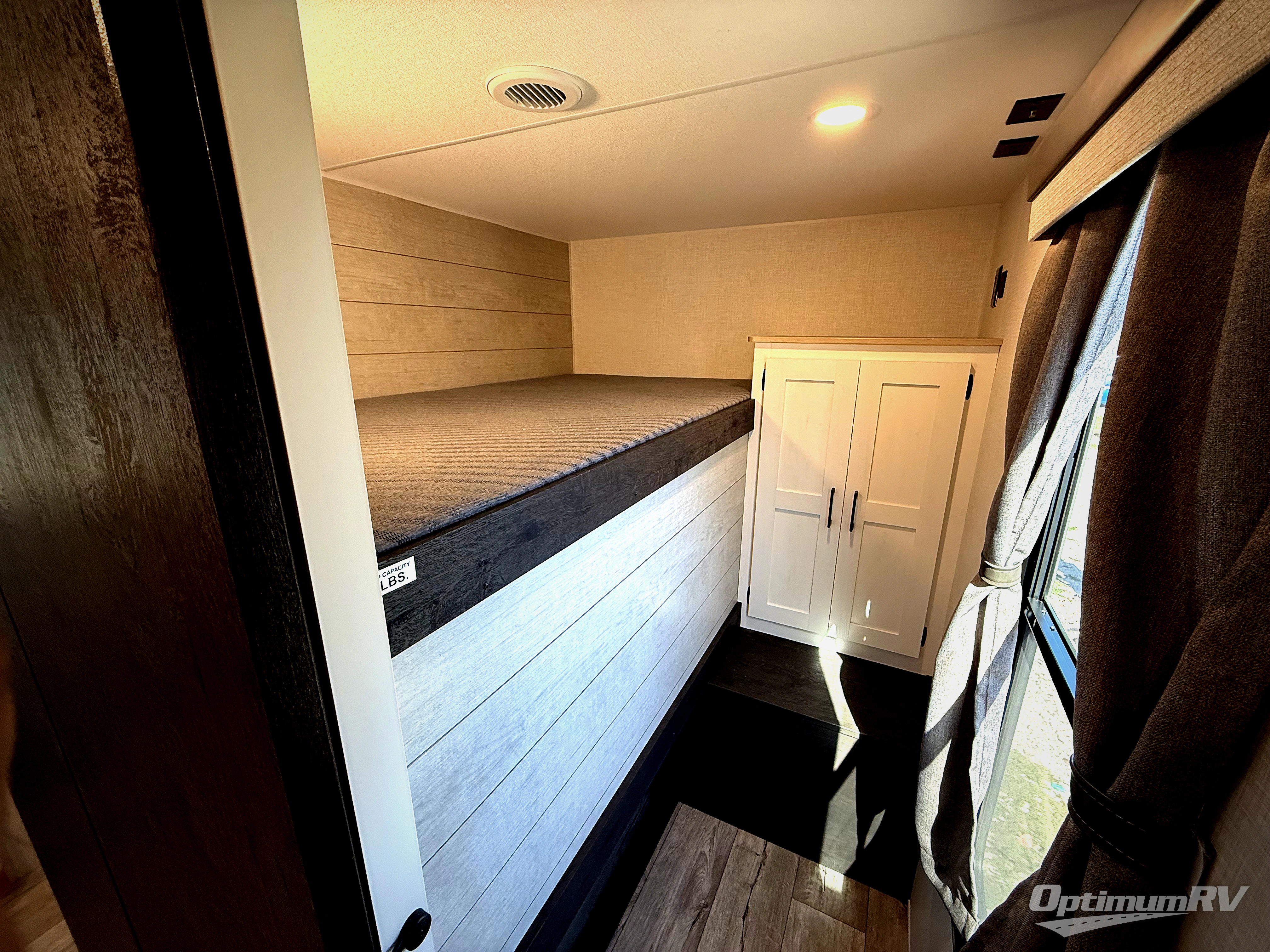 This travel trailer’s bunk beds are perfect for kids, providing ample sleeping space for the whole family. The wardrobes offer plenty of storage for your clothing and essentials.The sofa is a comfortable spot to relax, and the fireplace adds a cozy touch to the interior. The entertainment center is equipped with a 50” TV, perfect for family movie nights or enjoying your favorite shows on the go. The walk-in pantry provides ample storage for your food and snacks, while the 10 cu refrigerator keeps your food and drinks fresh. The sit n’ slide table is a fun and functional spot for meals and adds additional sleeping space. For convenience and comfort the walk-through bath provides easy access and convenience, while the overhead cabinets offer additional storage for your essentials. The front bedroom features a spacious queen bed and overhead cabinet. Head outside and unwind under the shade of the two exterior awnings and store everything you need in the pass-through storage offering ample space for your outdoor gear and equipment.