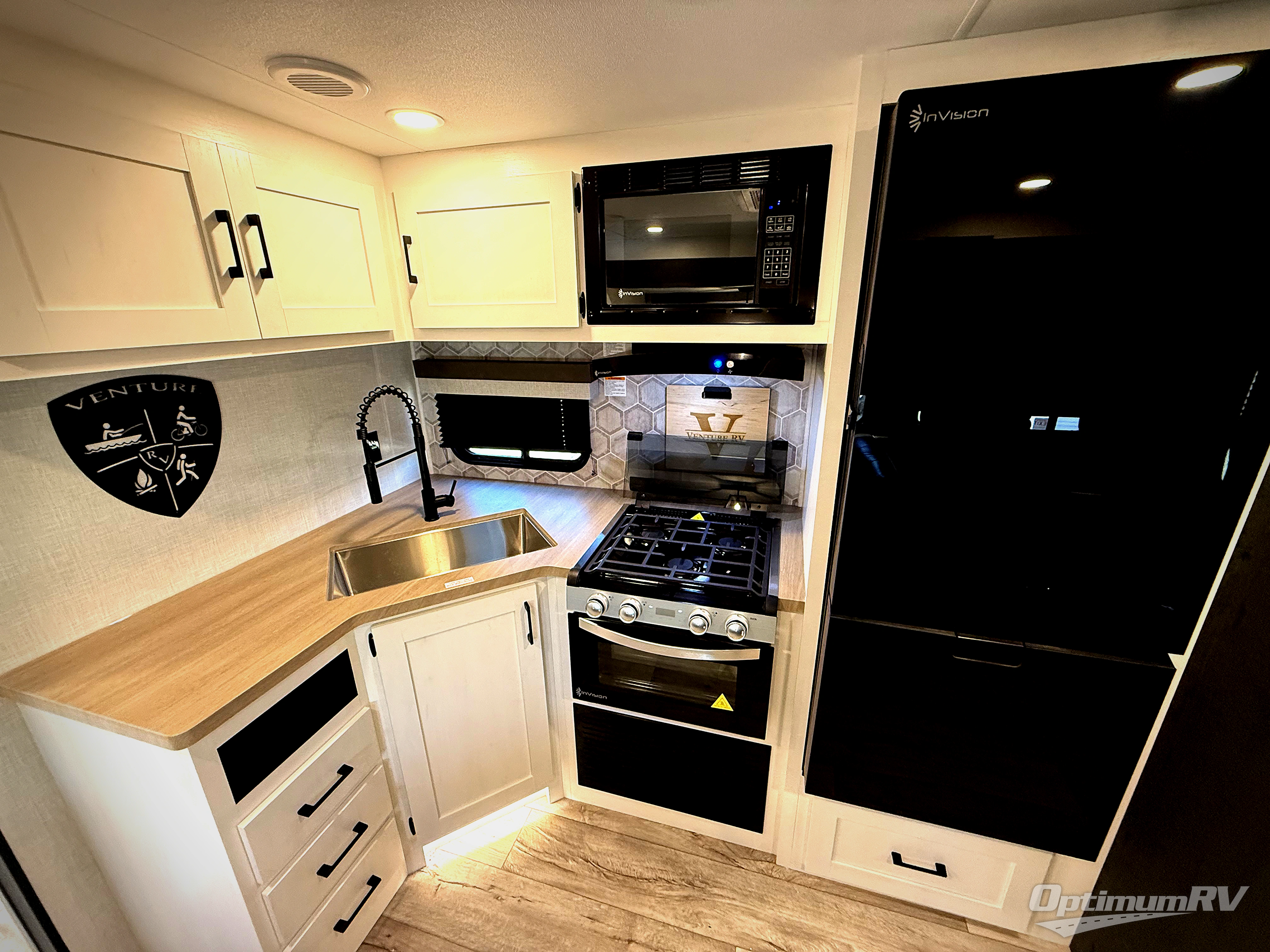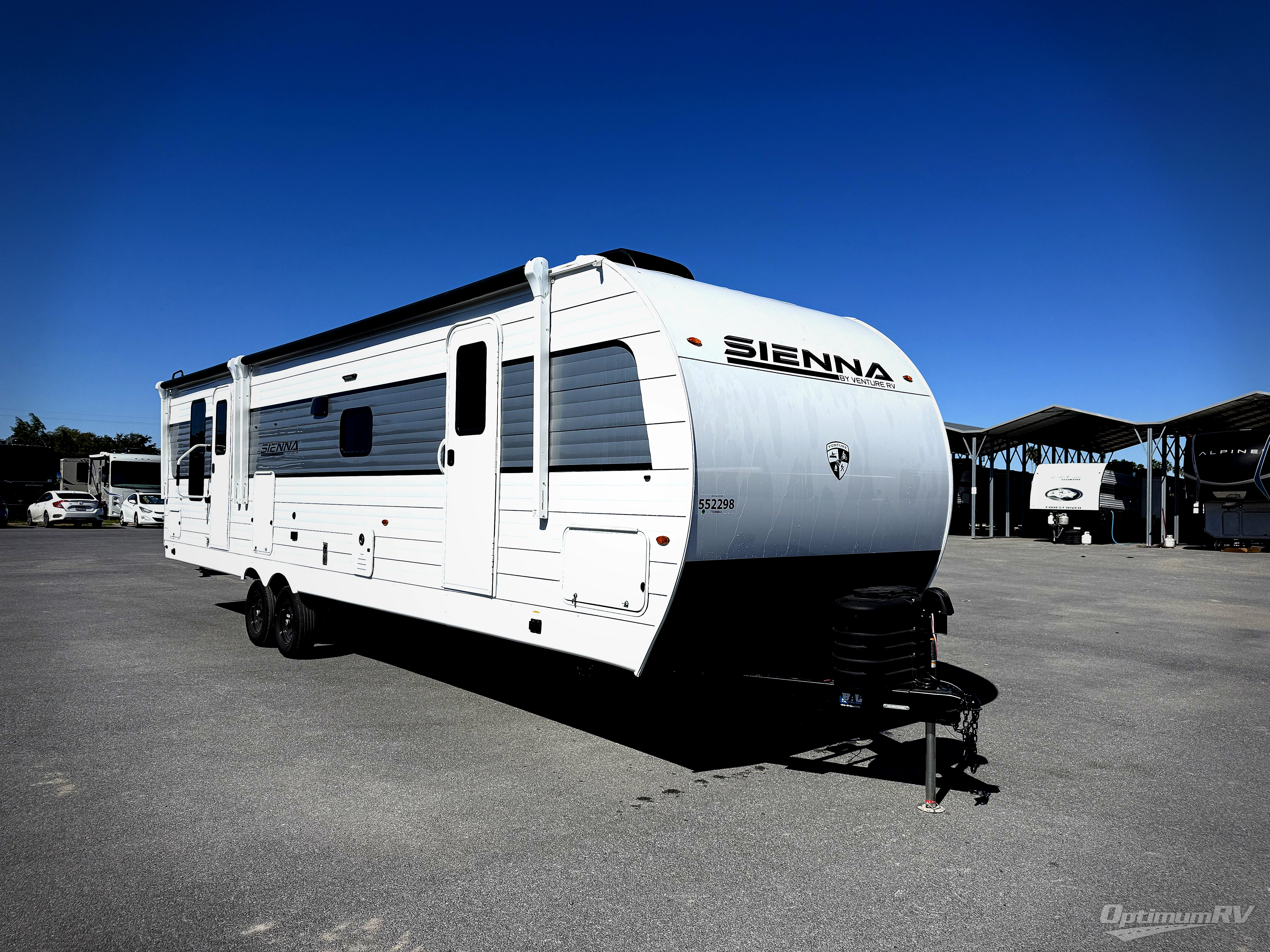 With any Sienna travel trailer by Venture RV, you will enjoy a lightweight unit, convenient amenities, and a durable construction that includes a BAL NXG-bolted frame. There is also a heated and enclosed one-piece underbelly, residential fiberglass insulation, and a reflective PVC roof membrane within the Weather-Shield Package to help extend your camping season. Outside, the BAL 5.0 power stabilizer jacks and power tongue jack will have you set up in no-time, and the Venture RV bottle opener/dog tie down will make it easy to bring your furry friends along. Head inside to enjoy the modern farmhouse design, along with Beauflor throughout with no carpet, custom backsplash, large underbed storage, and a bath skylight to name a few comforts!