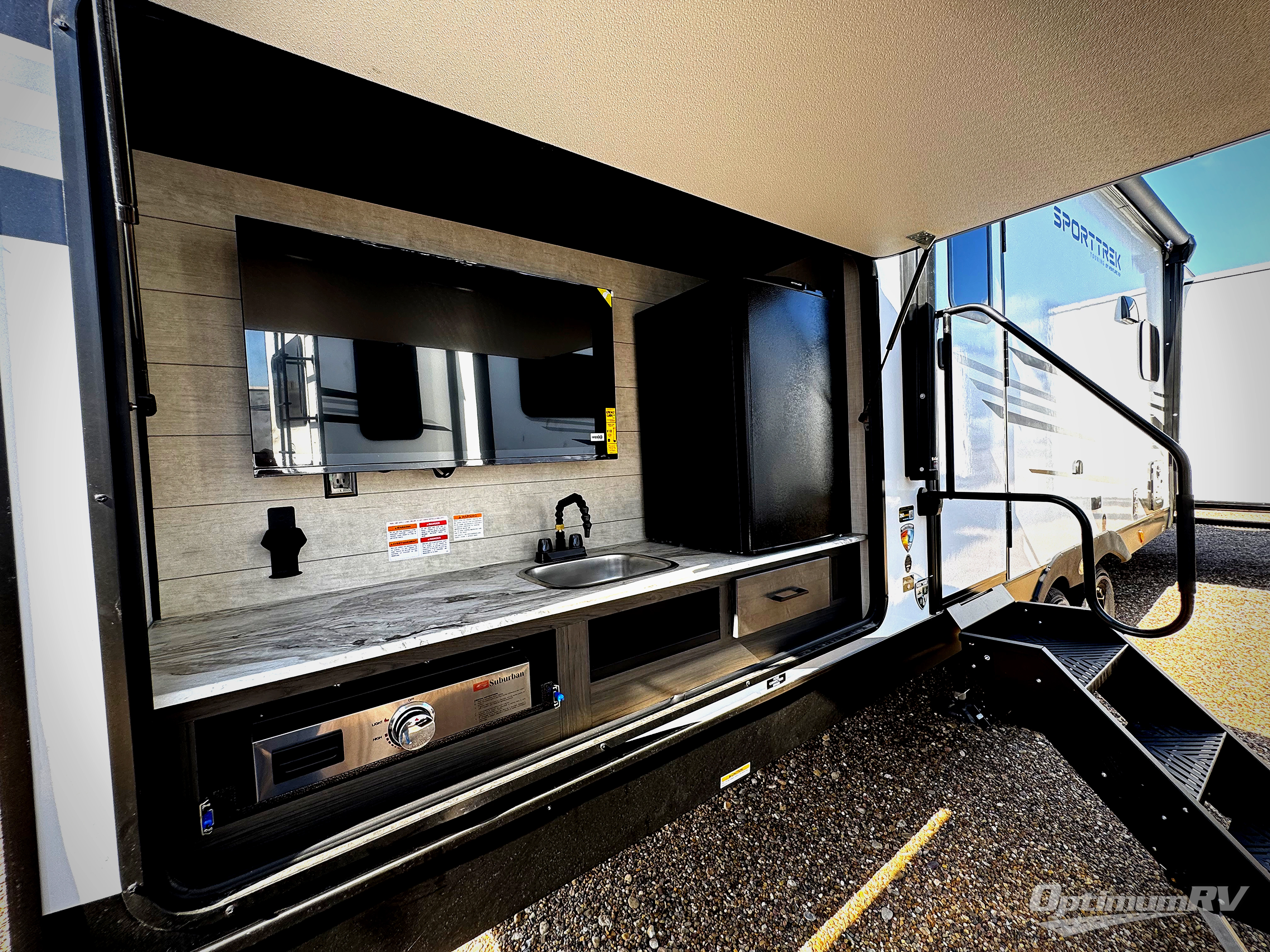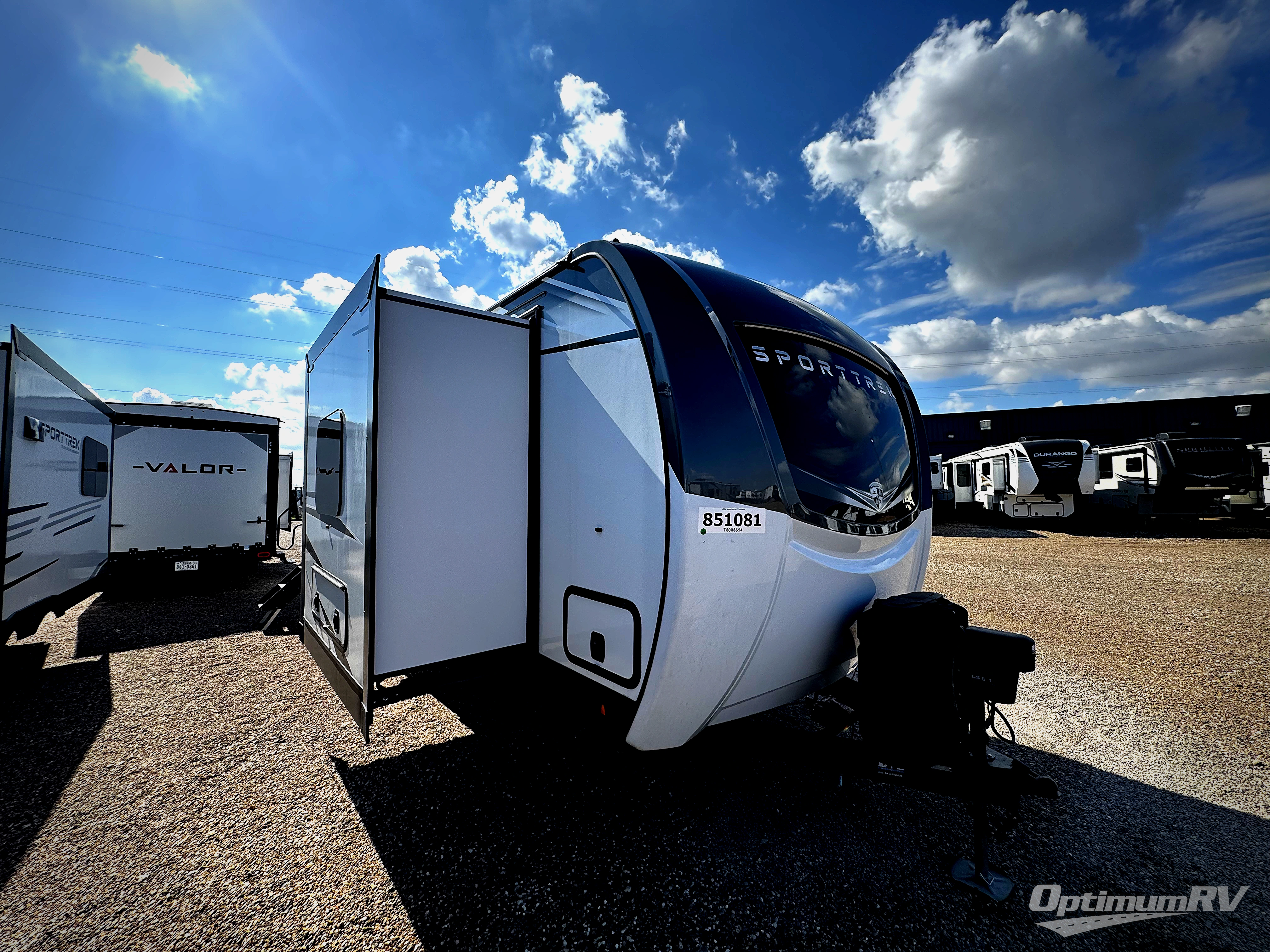 An elegant design and new features come with every one of these Venture RV SportTrek Touring Edition travel trailers! The NXG Huck bolt frame holds these units together and a walkable roof covers them. Heads will turn down the highway and at the campsite with an upgraded graphics package and a painted fiberglass front cap with integrated LED light. The exterior pass-through storage area has slam latch baggage doors with magnetic catches so you don't have to worry about them closing on you and a motion activated light to see your items clearly even at night. Luxury abounds throughout these units, especially with the mandatory Interior Luxury package which comes with solid surface kitchen countertops, designer valances with fabric nightshades, two 30" frameless fireplaces, and Beauflor wood plank flooring that is easy to clean. Come find your favorite model today!