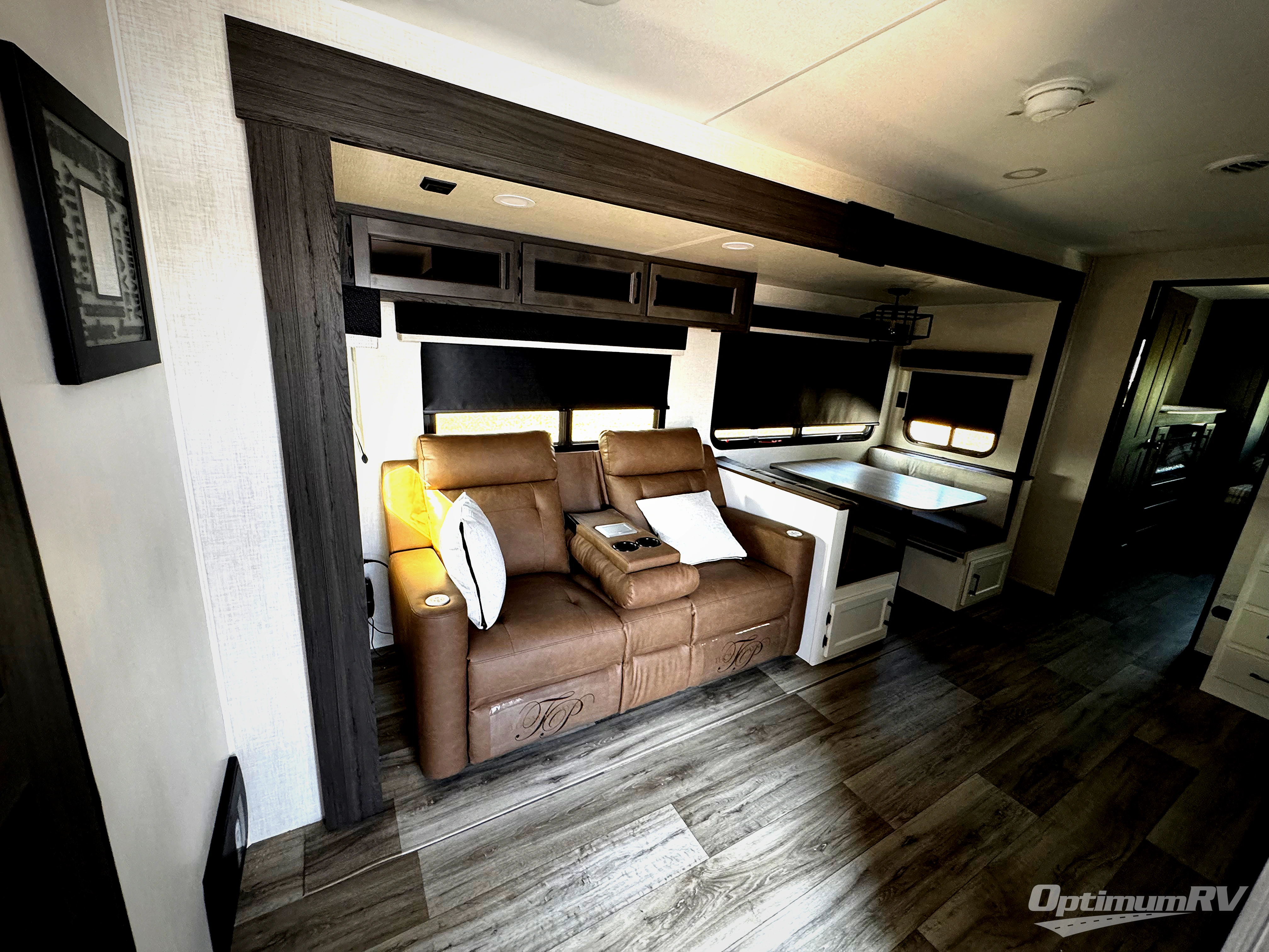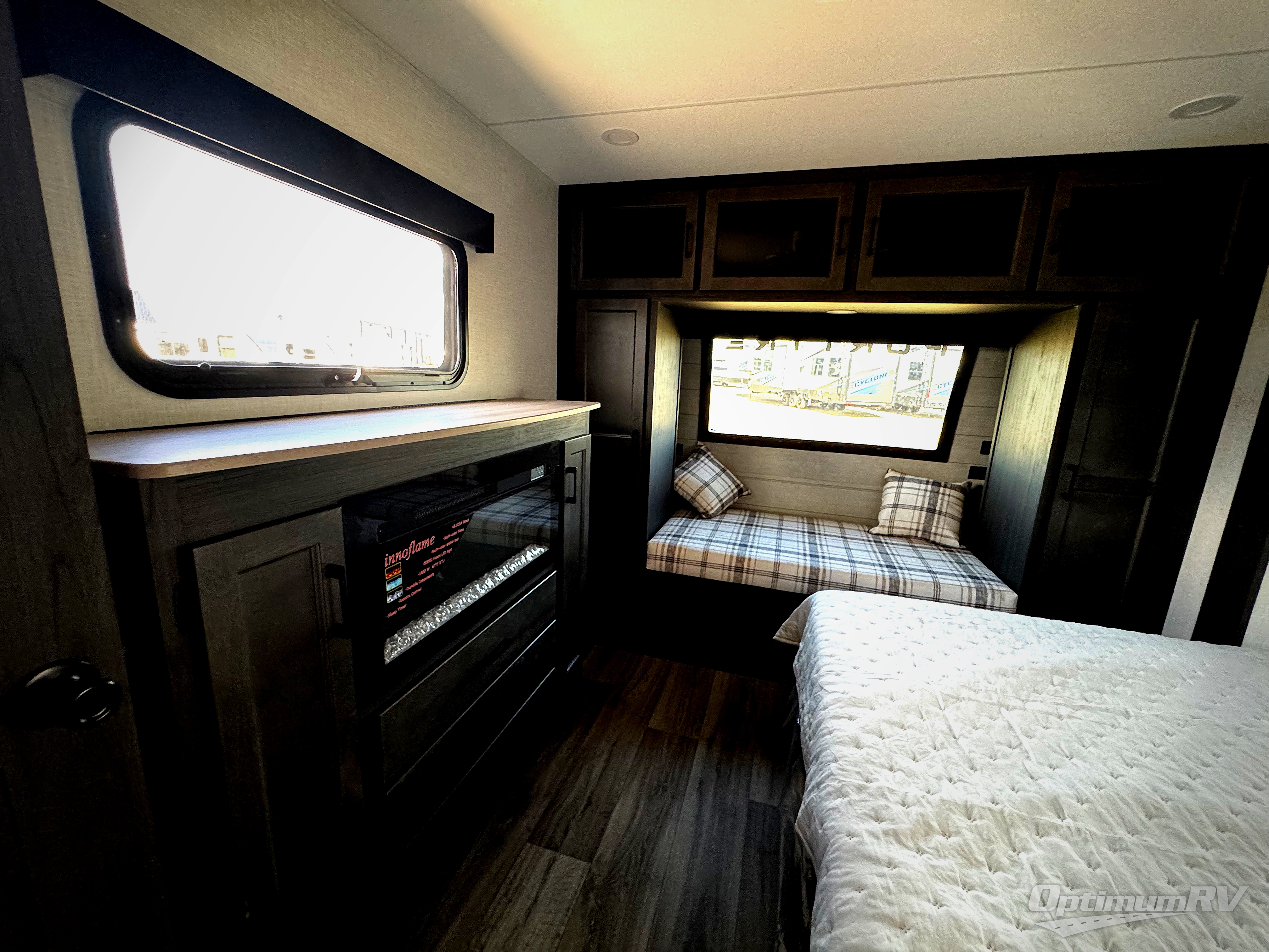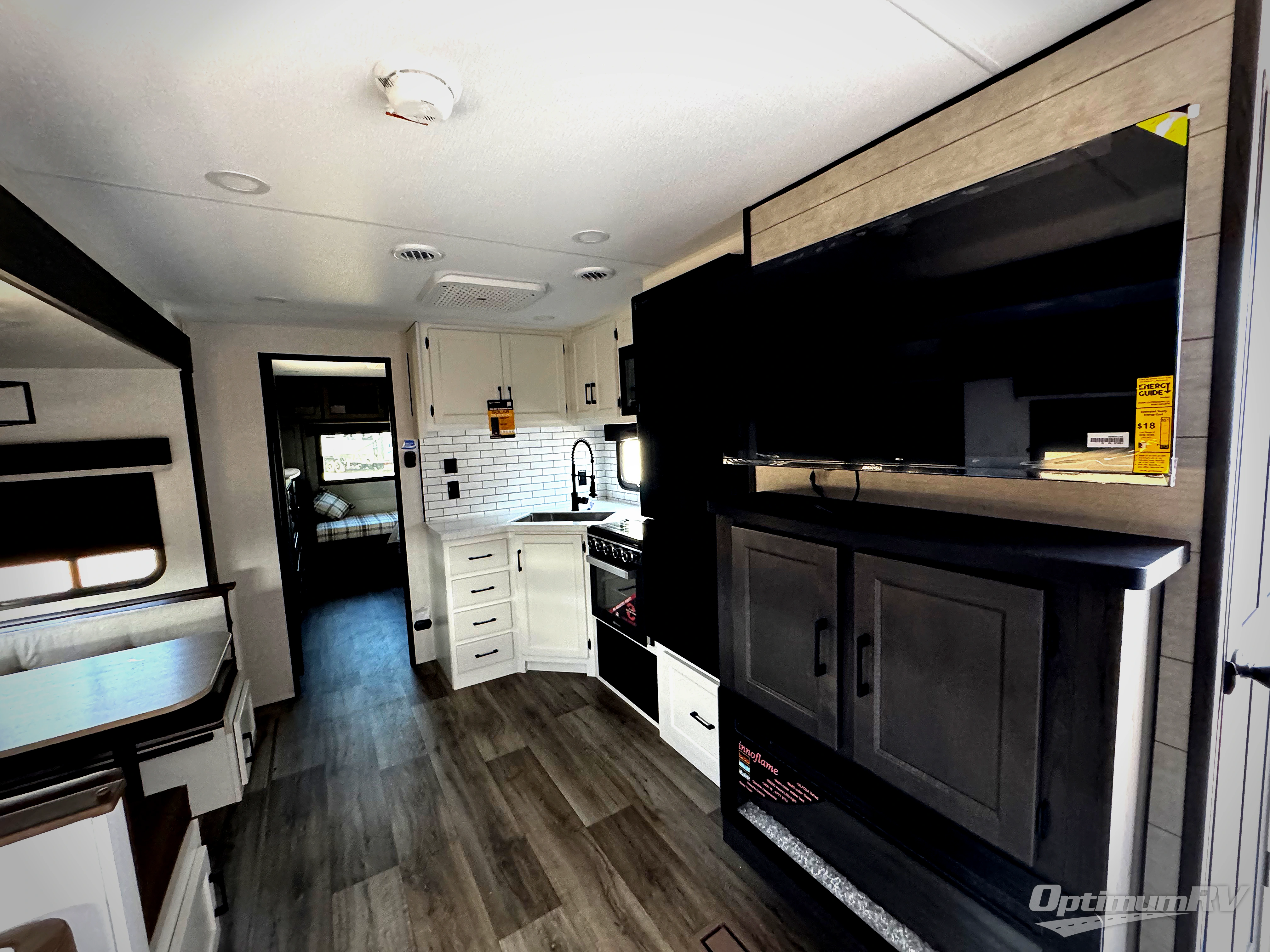 Pack your bags for an adventure of a lifetime with your spouse in this travel trailer! The front private bedroom has a 70" x 80" Sleep Tight king bed slide for more interior space, a dresser with a 30" frameless fireplace and TV, and a window seat to read a book with a view. Freshen up each morning in the rear full bathroom with the 30" x 36" shower, and store your linens in the three door linen closet, then head to the fully equipped kitchen to fry up some eggs on the three burner cooktop. The Sit N' Slide table offers a comfortable place to enjoy your meals, play card games, and even transform into an extra sleeping space. Grab a snack from the walk-in pantry with coat hooks and relax on the 70" tri-fold sofa bed across from the entertainment center with a 30" frameless fireplace!