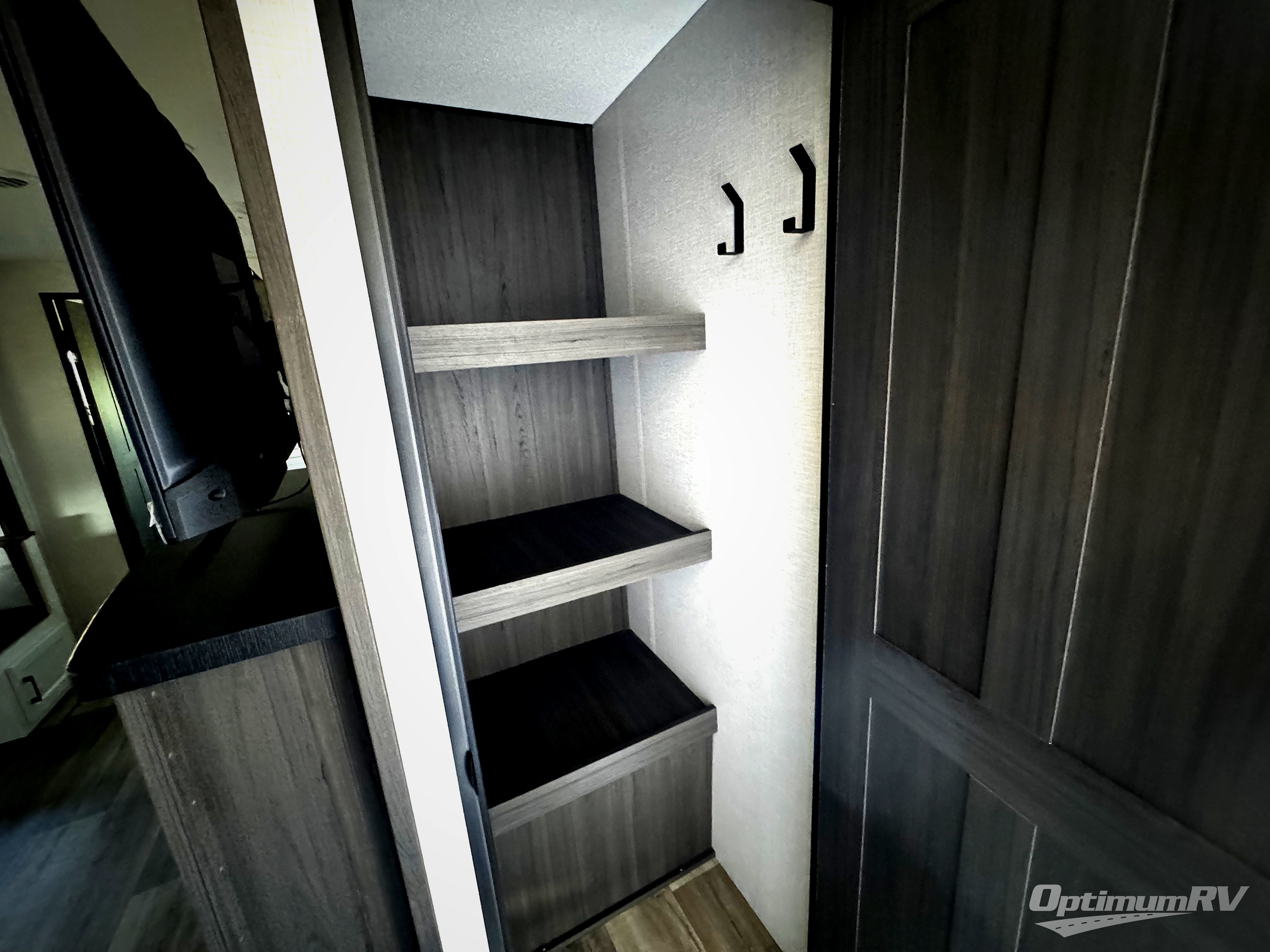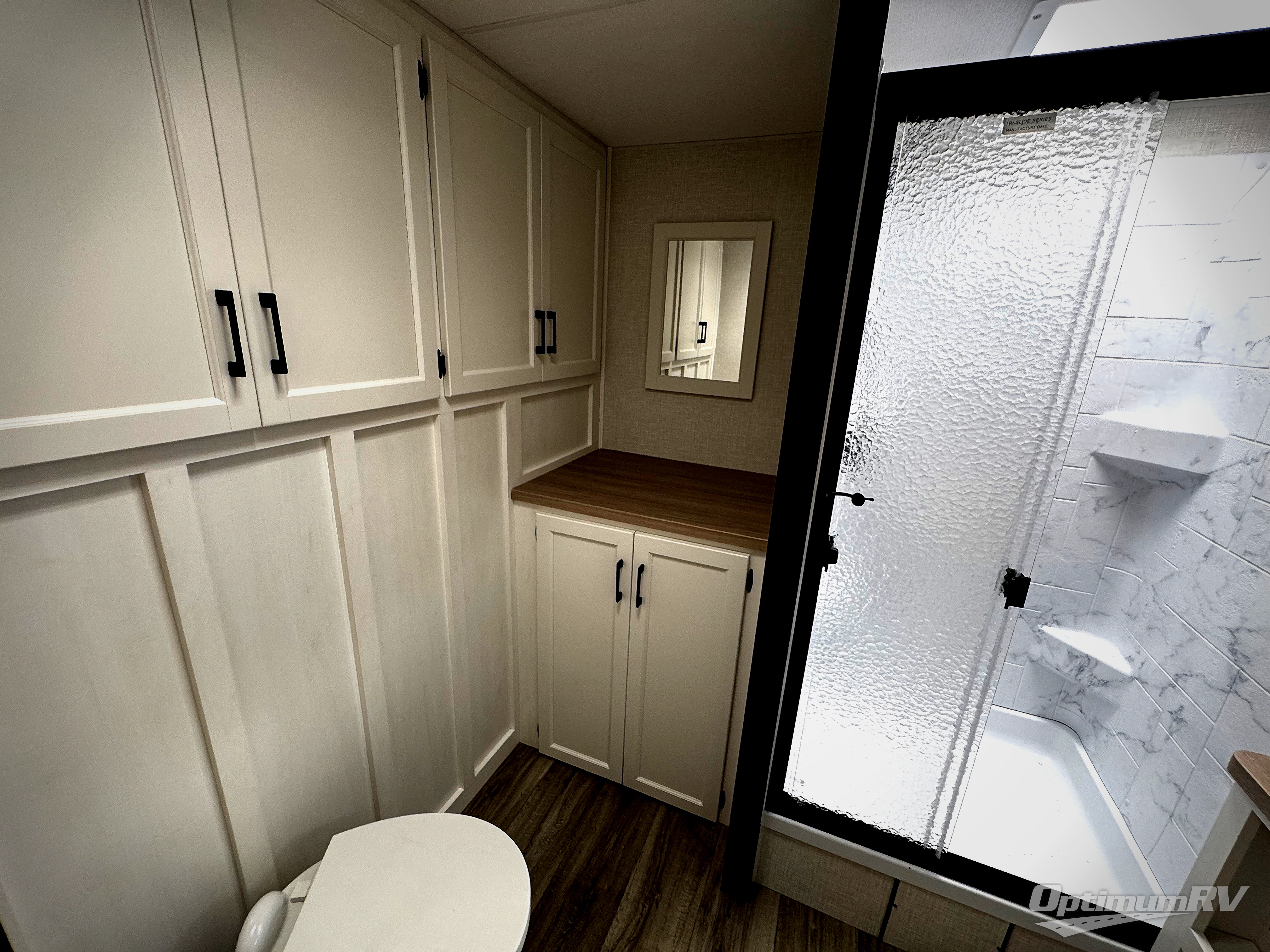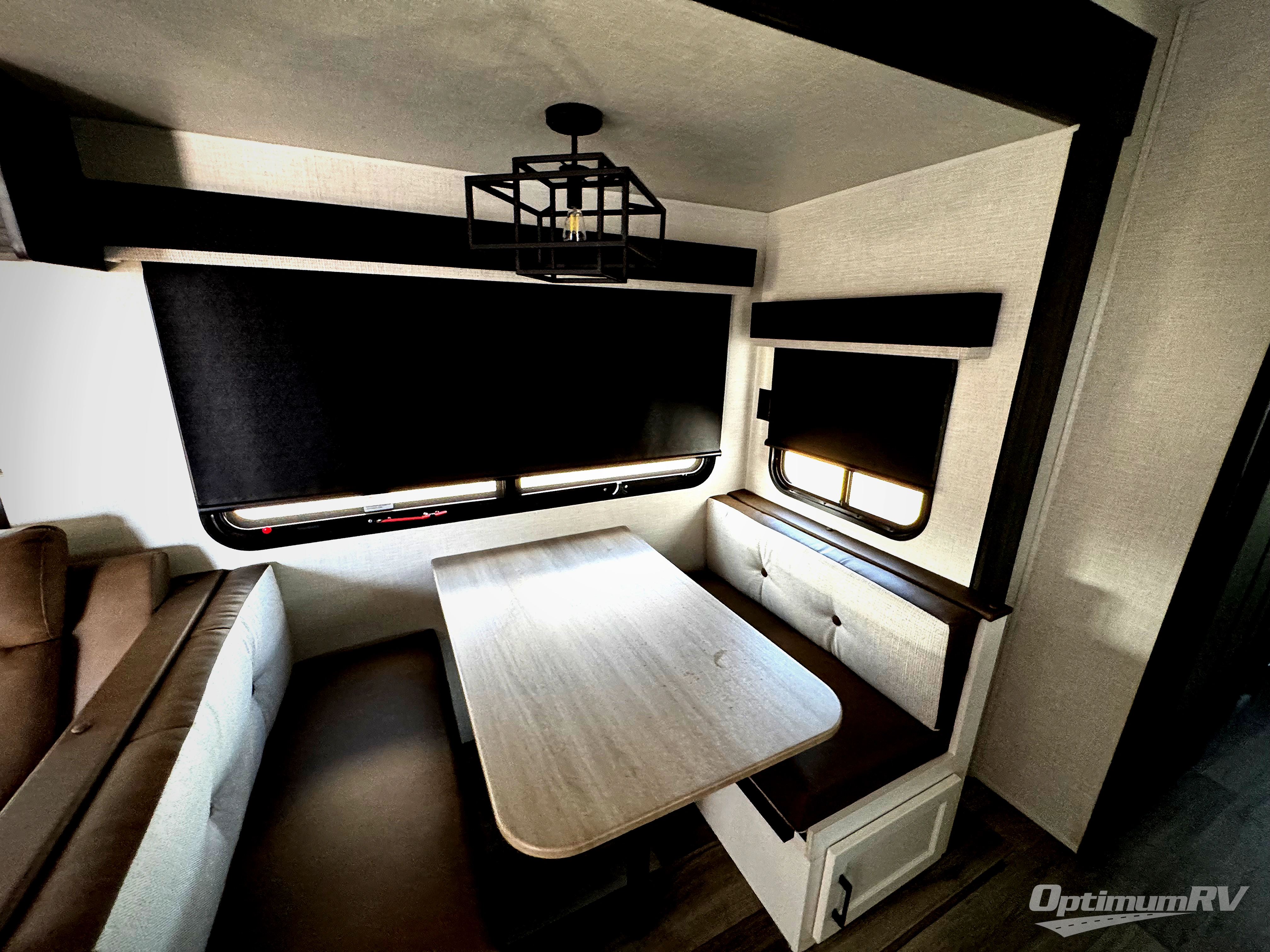 Pack your bags for an adventure of a lifetime with your spouse in this travel trailer! The front private bedroom has a 70" x 80" Sleep Tight king bed slide for more interior space, a dresser with a 30" frameless fireplace and TV, and a window seat to read a book with a view. Freshen up each morning in the rear full bathroom with the 30" x 36" shower, and store your linens in the three door linen closet, then head to the fully equipped kitchen to fry up some eggs on the three burner cooktop. The Sit N' Slide table offers a comfortable place to enjoy your meals, play card games, and even transform into an extra sleeping space. Grab a snack from the walk-in pantry with coat hooks and relax on the 70" tri-fold sofa bed across from the entertainment center with a 30" frameless fireplace!