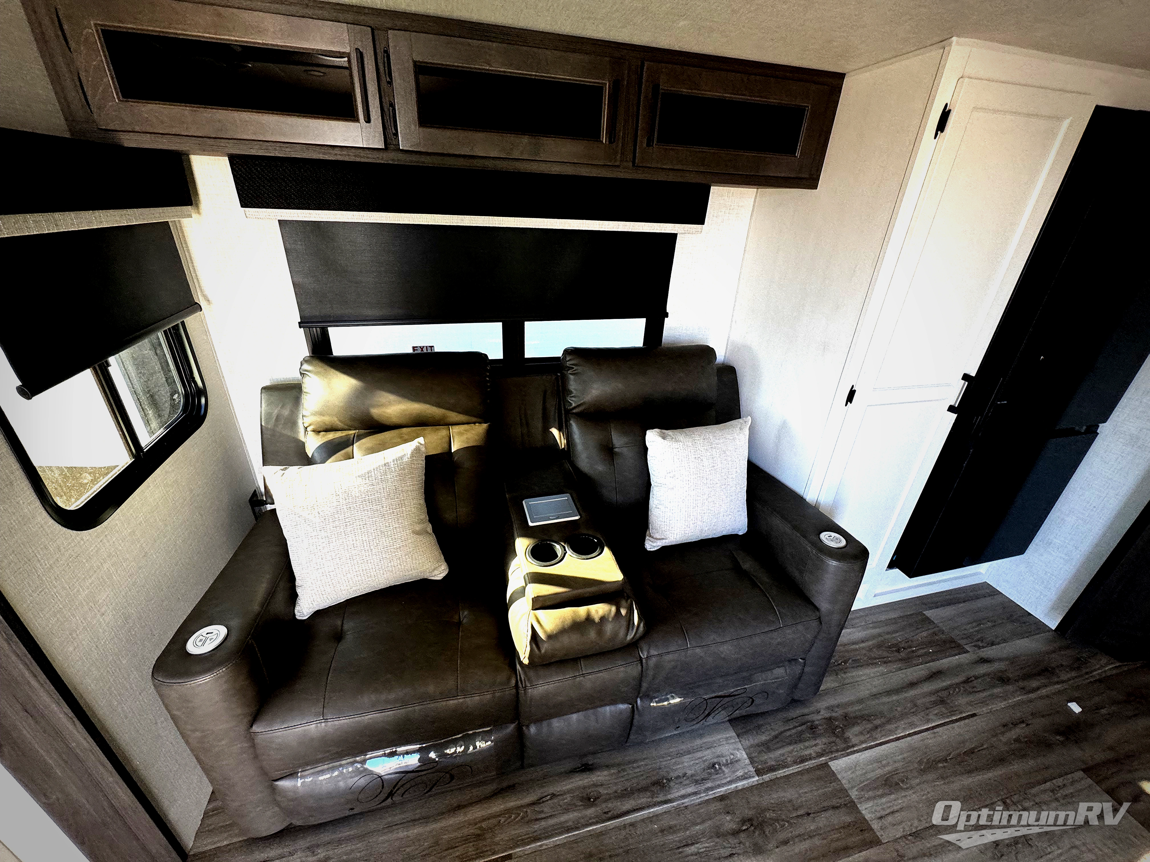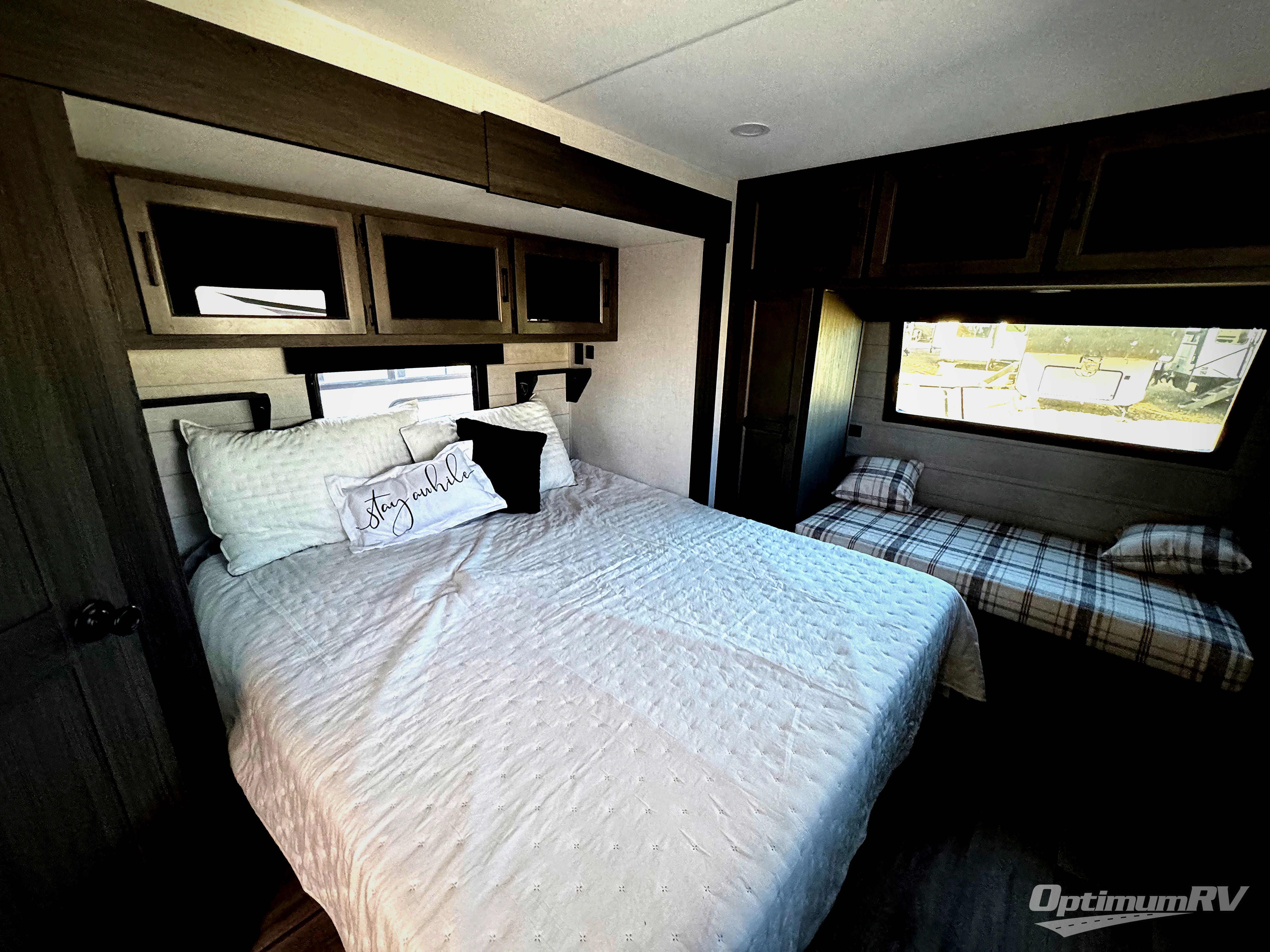 This travel trailer with dual entry doors allows you to enter in through the front master bedroom or the rear living area! You're sure to get a great night's rest on the king bed slide out, and you'll love the front bench seat with closets on either side for your things. There is also a dresser and a private door that leads to the walk-thru bath. Your crew can dine around the U-shaped dinette, relax on the 70" sofa slide out, and watch a movie with the Smart TV. There is also a fully equipped kitchen so you can make meals every day!