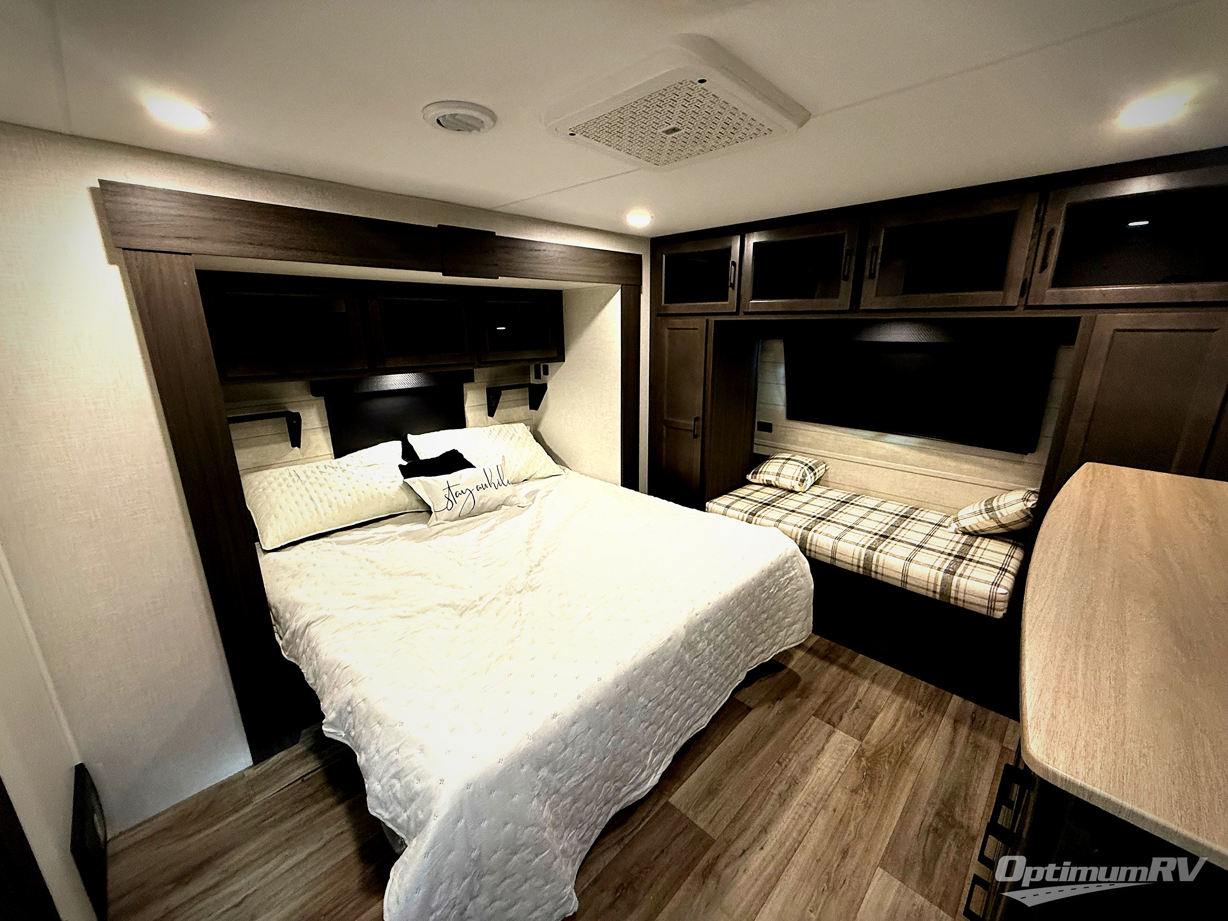 This travel trailer with dual entry doors allows you to enter in through the front master bedroom or the rear living area! You're sure to get a great night's rest on the king bed slide out, and you'll love the front bench seat with closets on either side for your things. There is also a dresser and a private door that leads to the walk-thru bath. Your crew can dine around the U-shaped dinette, relax on the 70" sofa slide out, and watch a movie with the Smart TV. There is also a fully equipped kitchen so you can make meals every day!