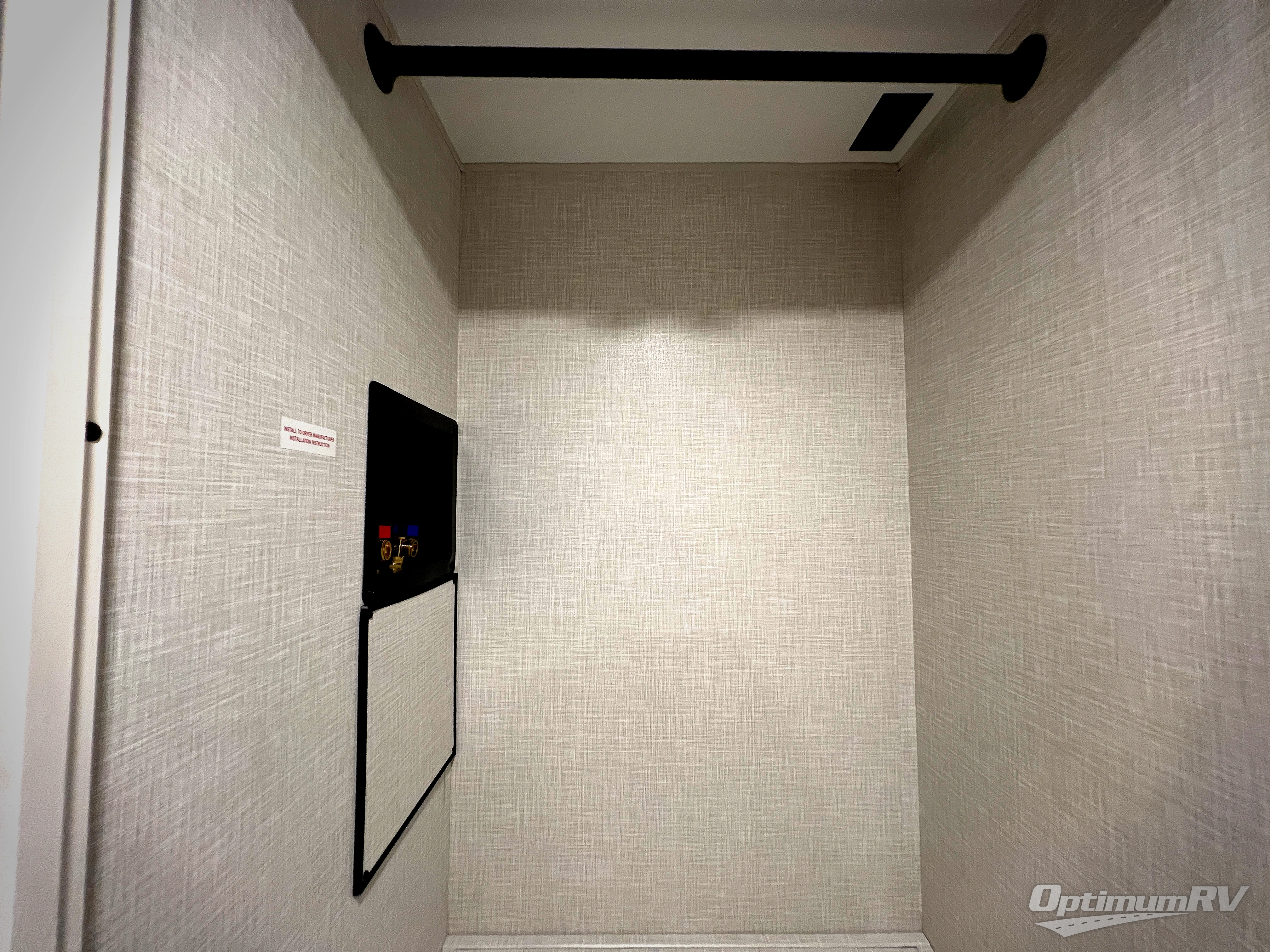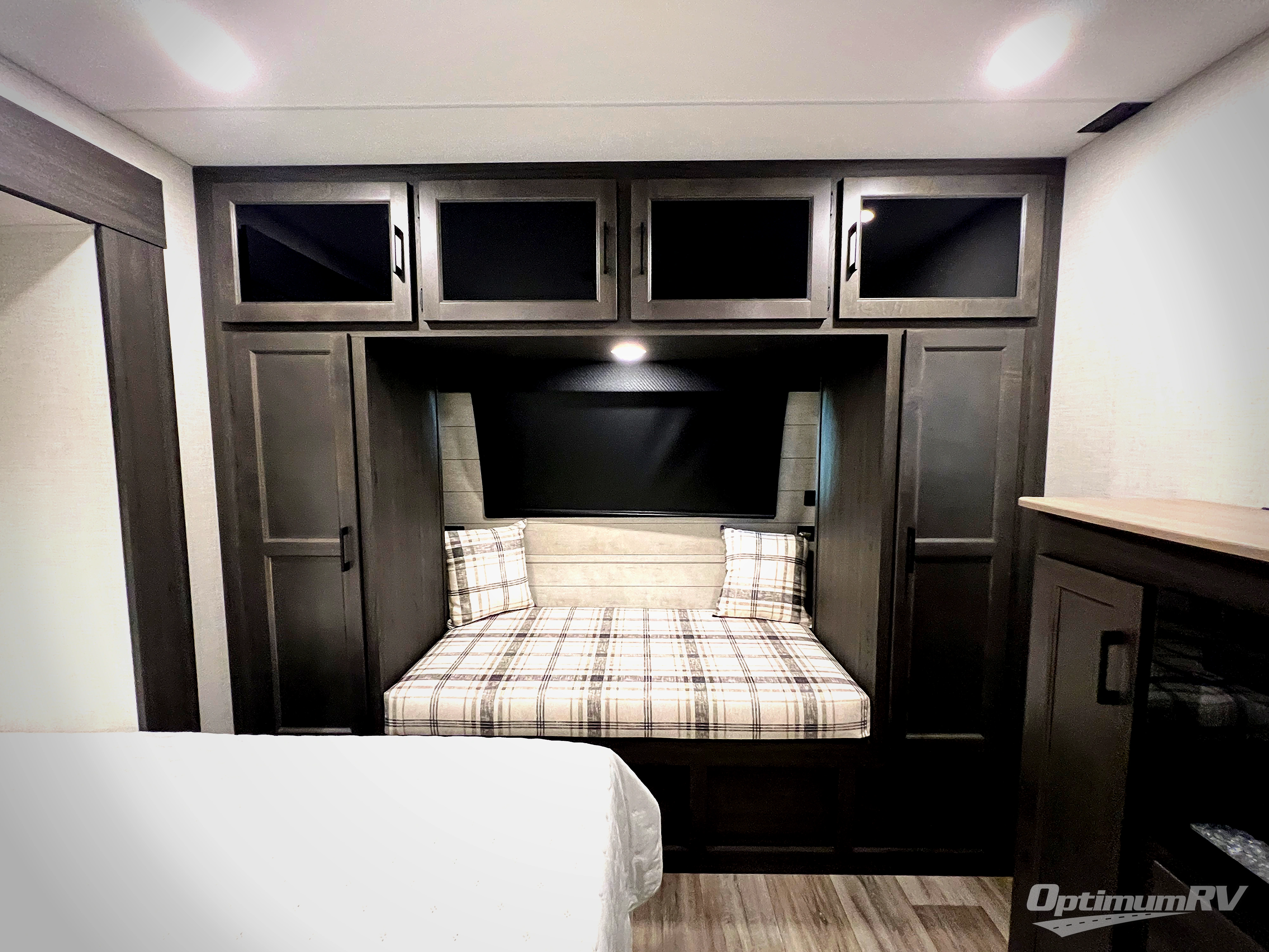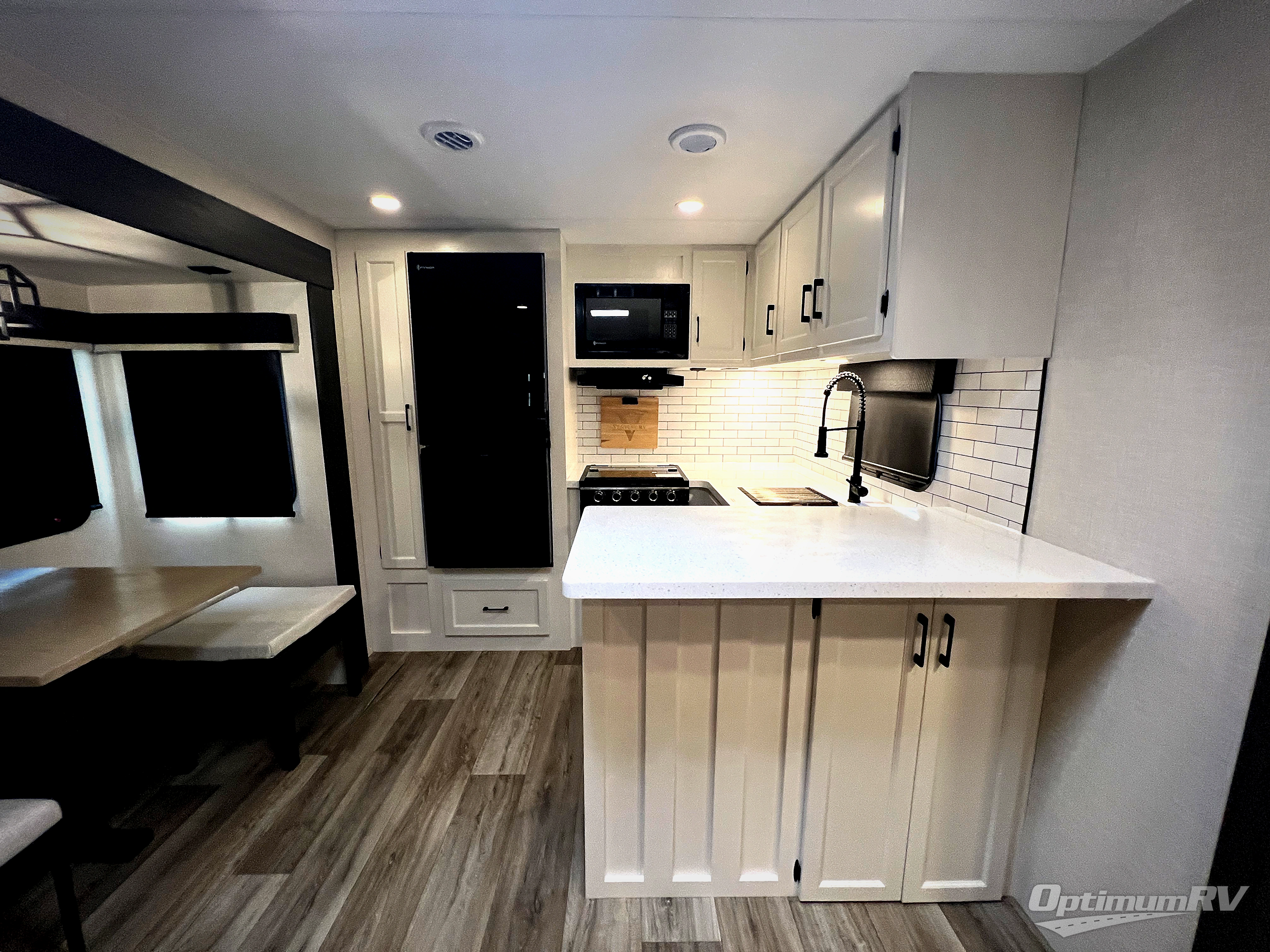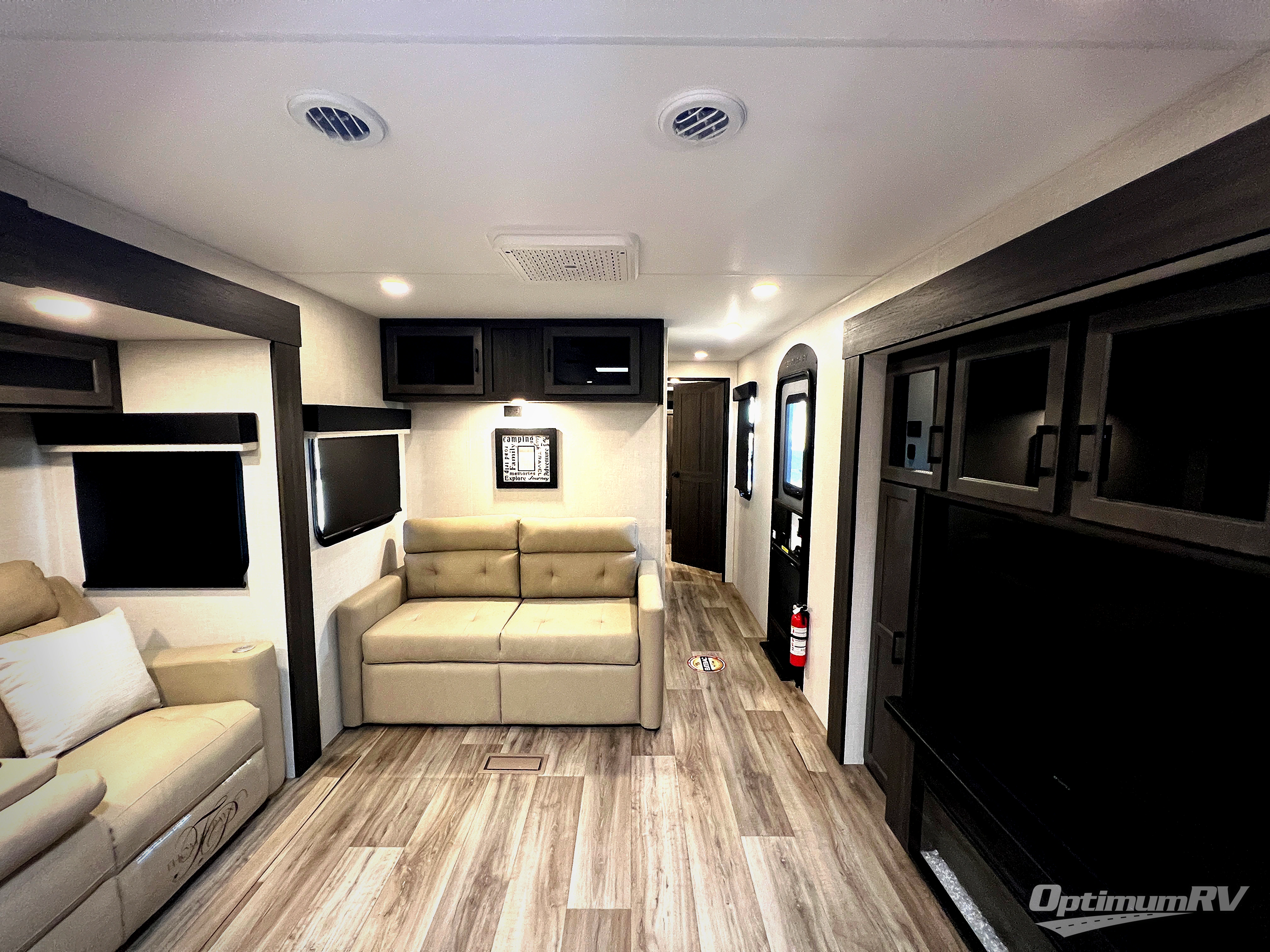 The chef will feel right at home cooking in the rear kitchen with all of the countertop space in this travel trailer! They can even head outside to breathe in some fresh air while cooking at the exterior campfire café with a refrigerator, a sink with countertop space, and a griddle. Relax each night in the middle living area with the 64" sofa and the slide that has theater seating with USB charging across from the entertainment center with a TV and 30" frameless fireplace. When you're ready to wind down your nights, take a hot shower in the full bathroom with the 30" x 36" shower then head to the front private bedroom and either read a book at the window seat or lay in the 70" x 80" sleep tight king bed slide while watching a movie with the TV or watch the 30" frameless fireplace!