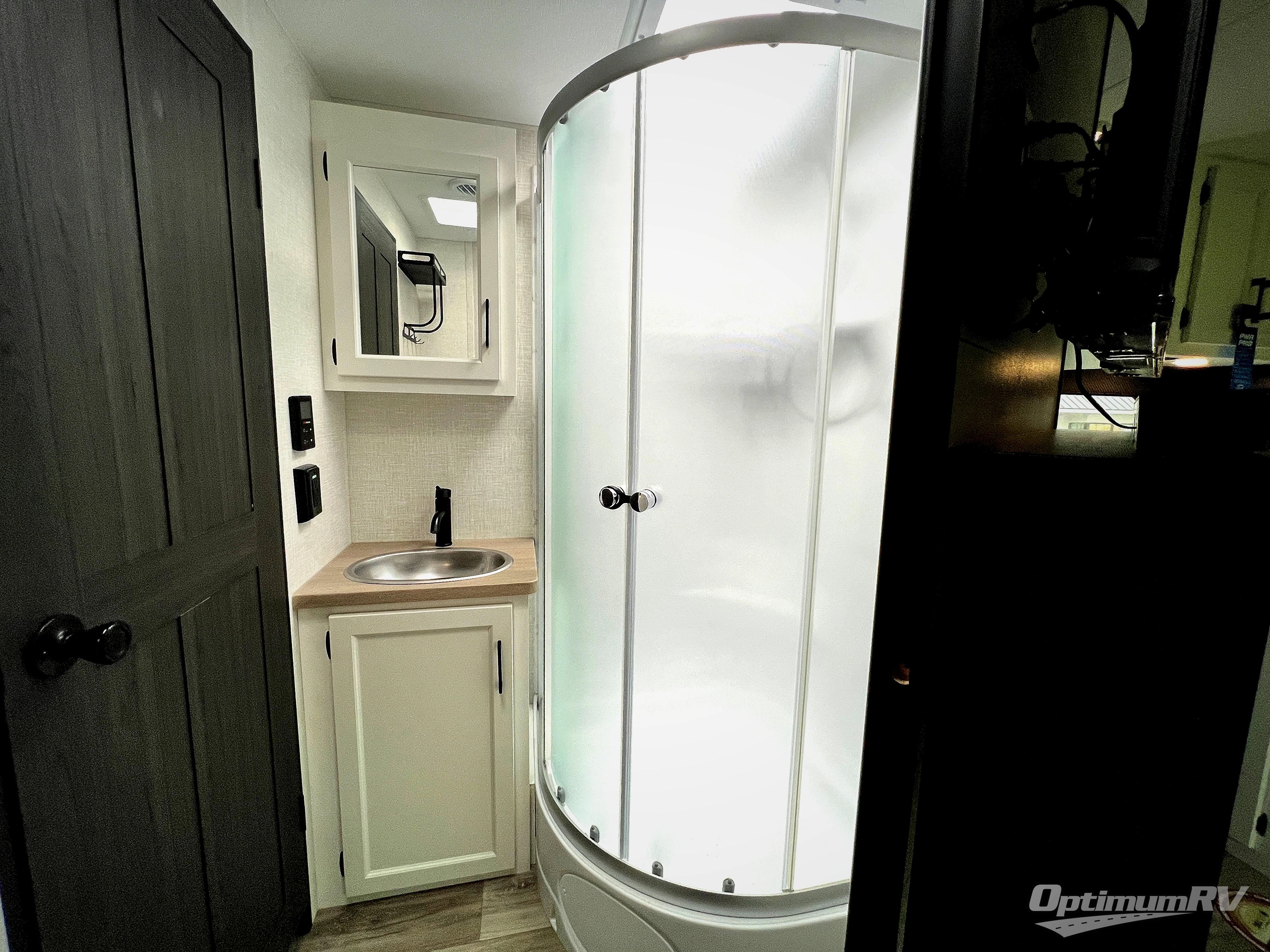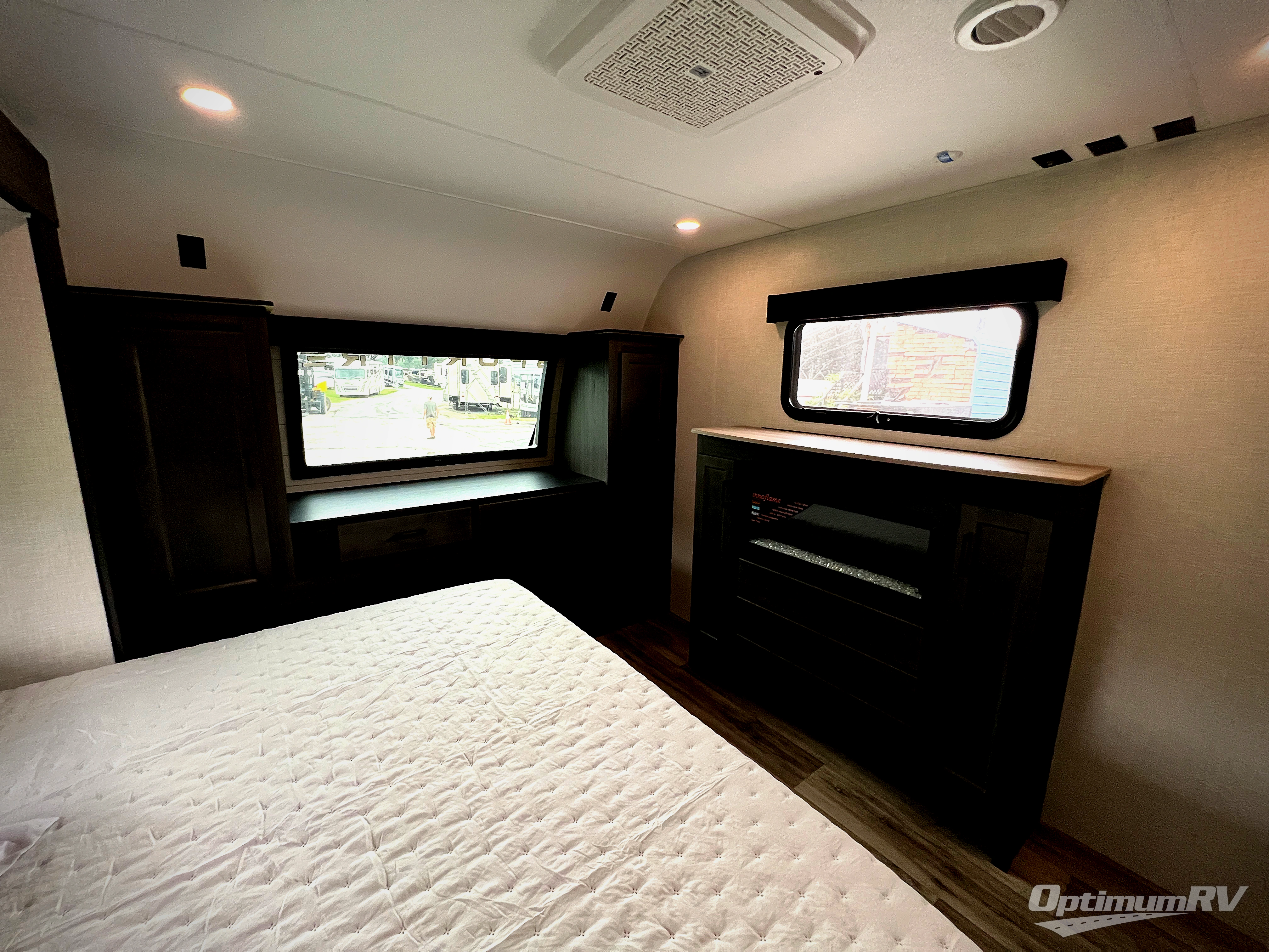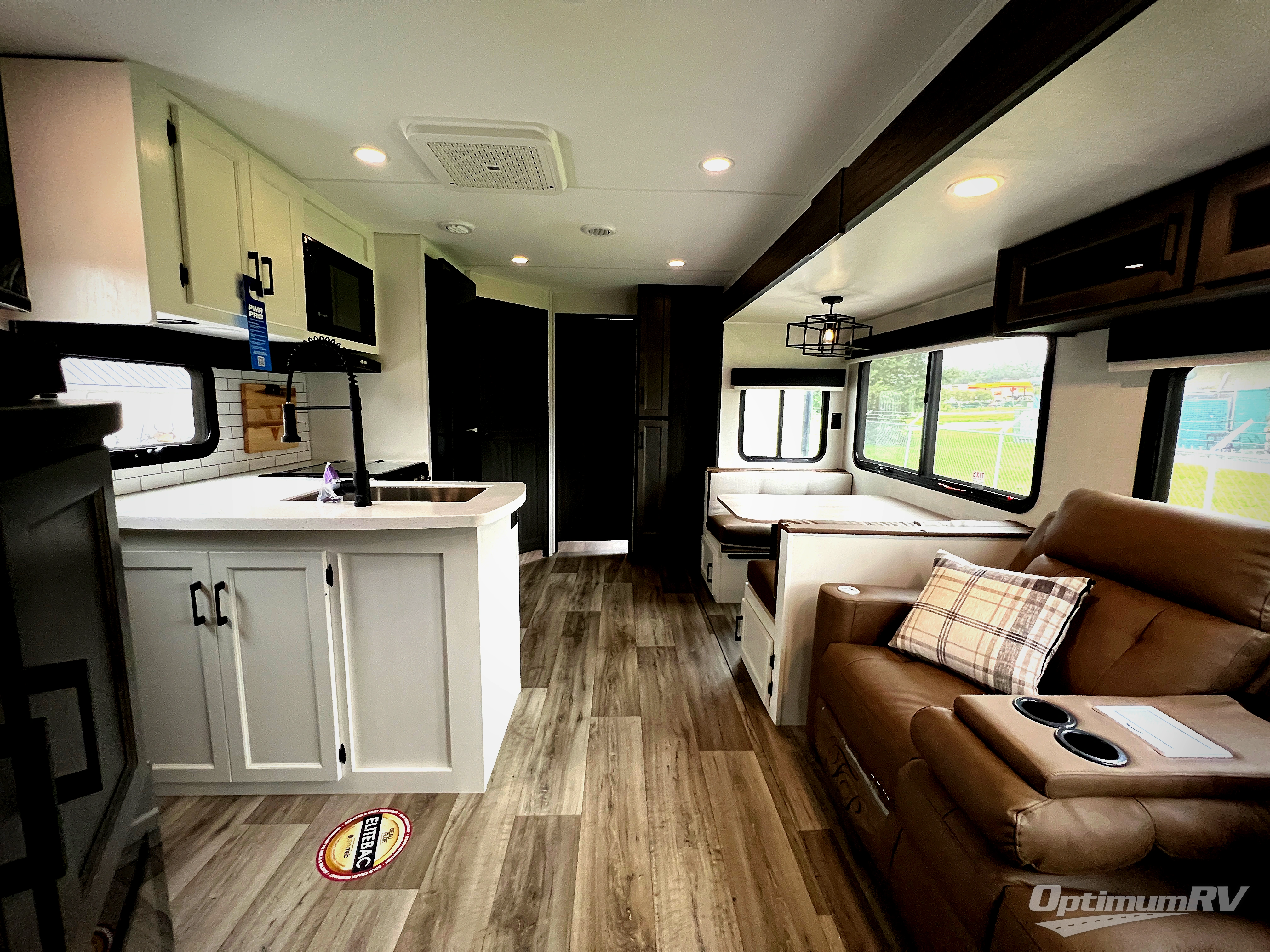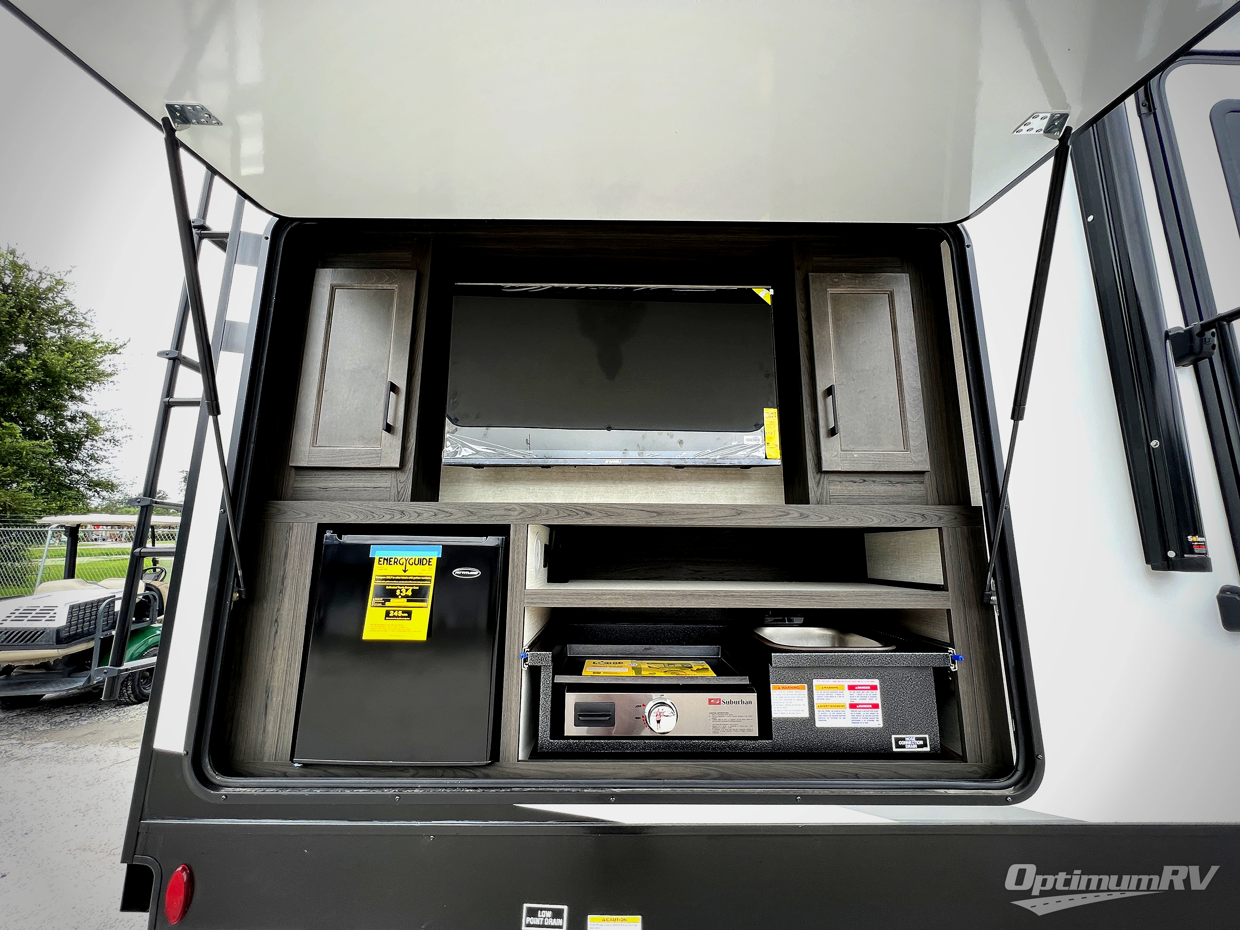 The whole family can camp together in this travel trailer! It features a rear private bunkhouse with a 28" x 70" top bunk above a 40" x 70" bottom bunk, a closet, and a 28" x 73" flip up top bunk above a 70" sofa with table slide. One of the dual entry doors leads directly into the half bathroom with fold-out aluminum steps so you can get back to having fun faster. The chef can prepare their best meals for the crew either indoors with the three burner cooktop or at the exterior campfire café with a 40" TV/DVD/speakers to entertain them while they cook. Everyone can gather together at the Sit N' Slide table and 70" tri-fold sofa across from the entertainment center with a fireplace for a cozy evening. The dual entry bathroom is easy to access, especially for those staying in the front private bedroom. You even have a coat closet next to the main entrance to limit the clutter!