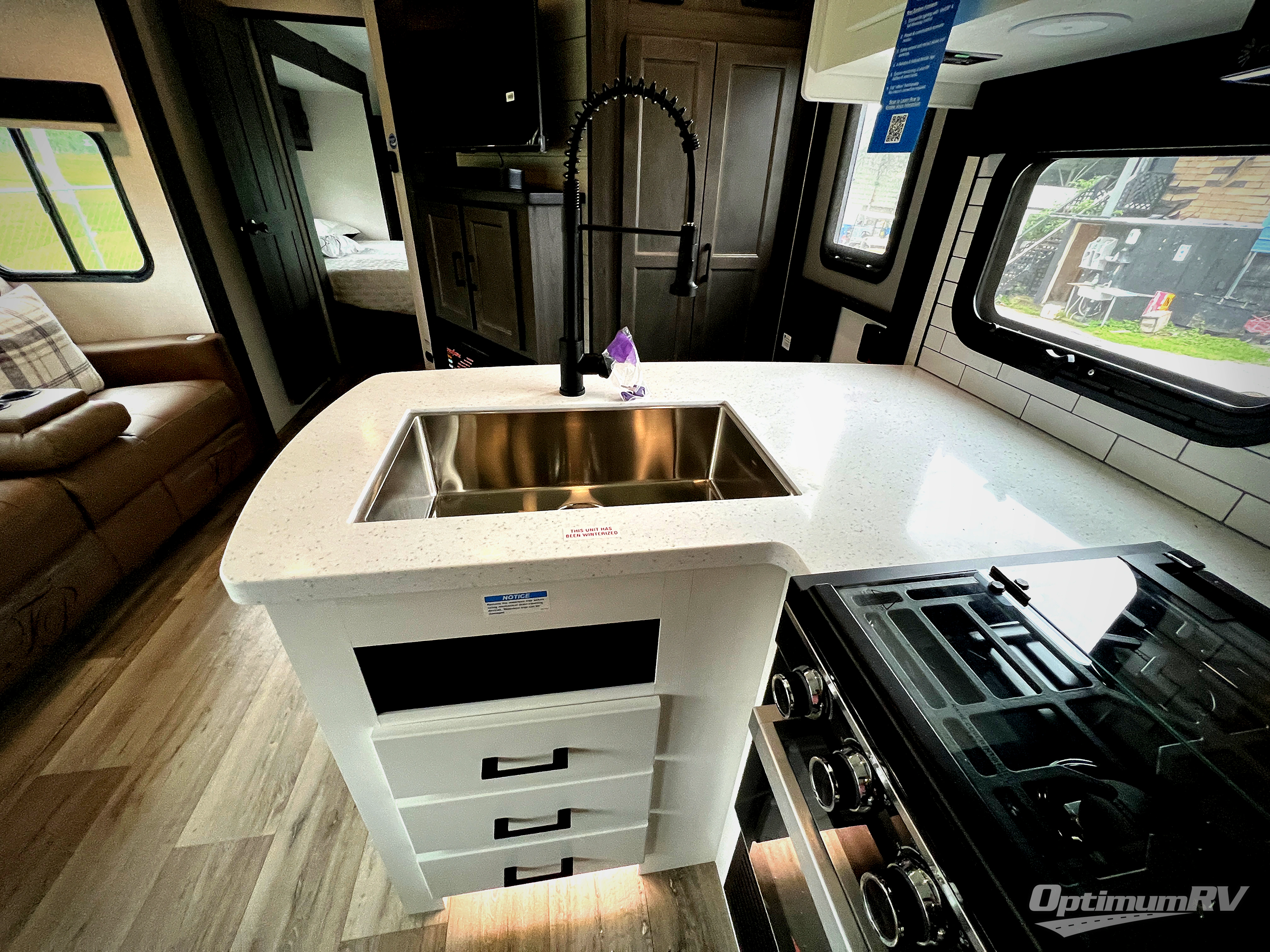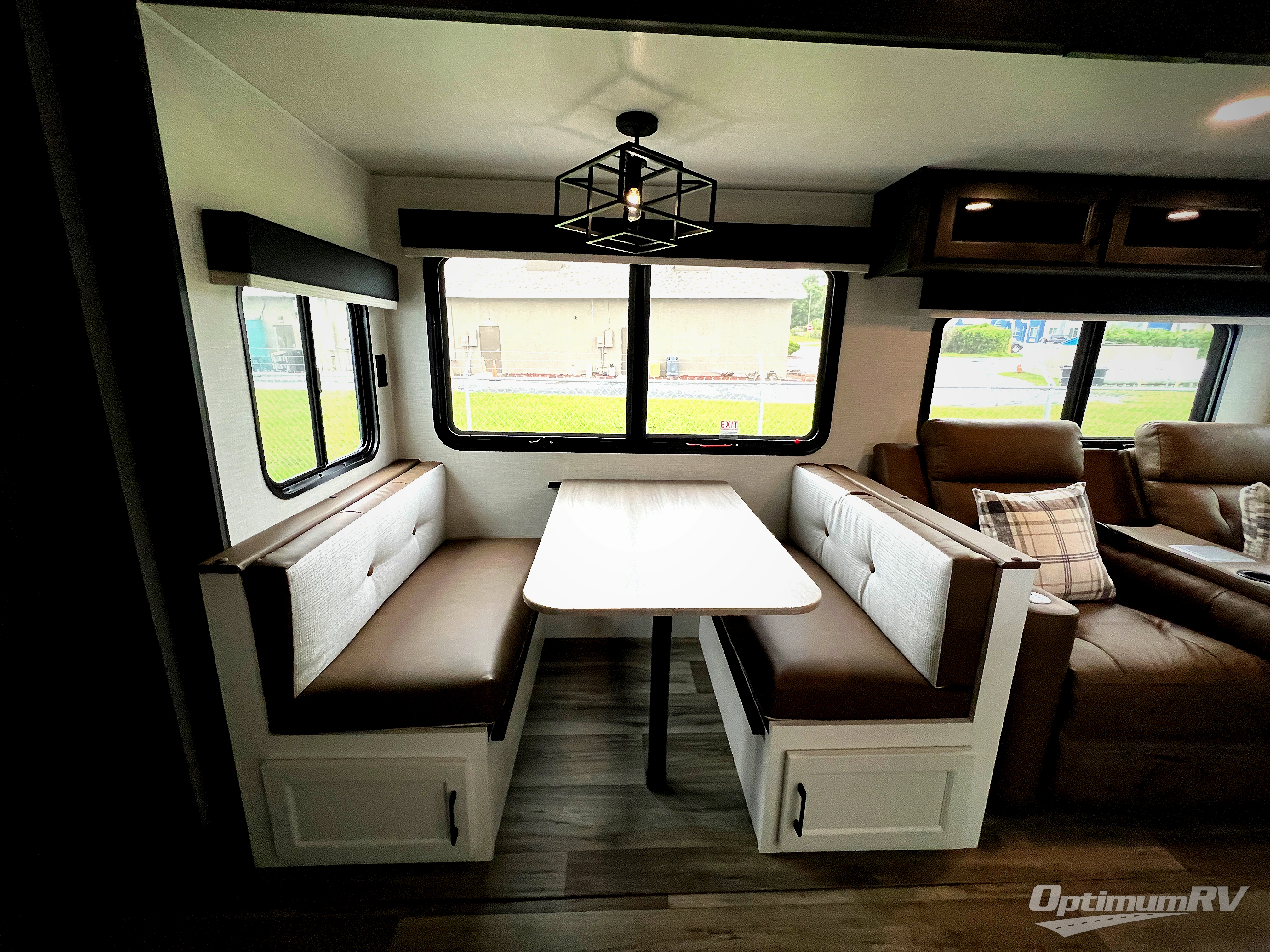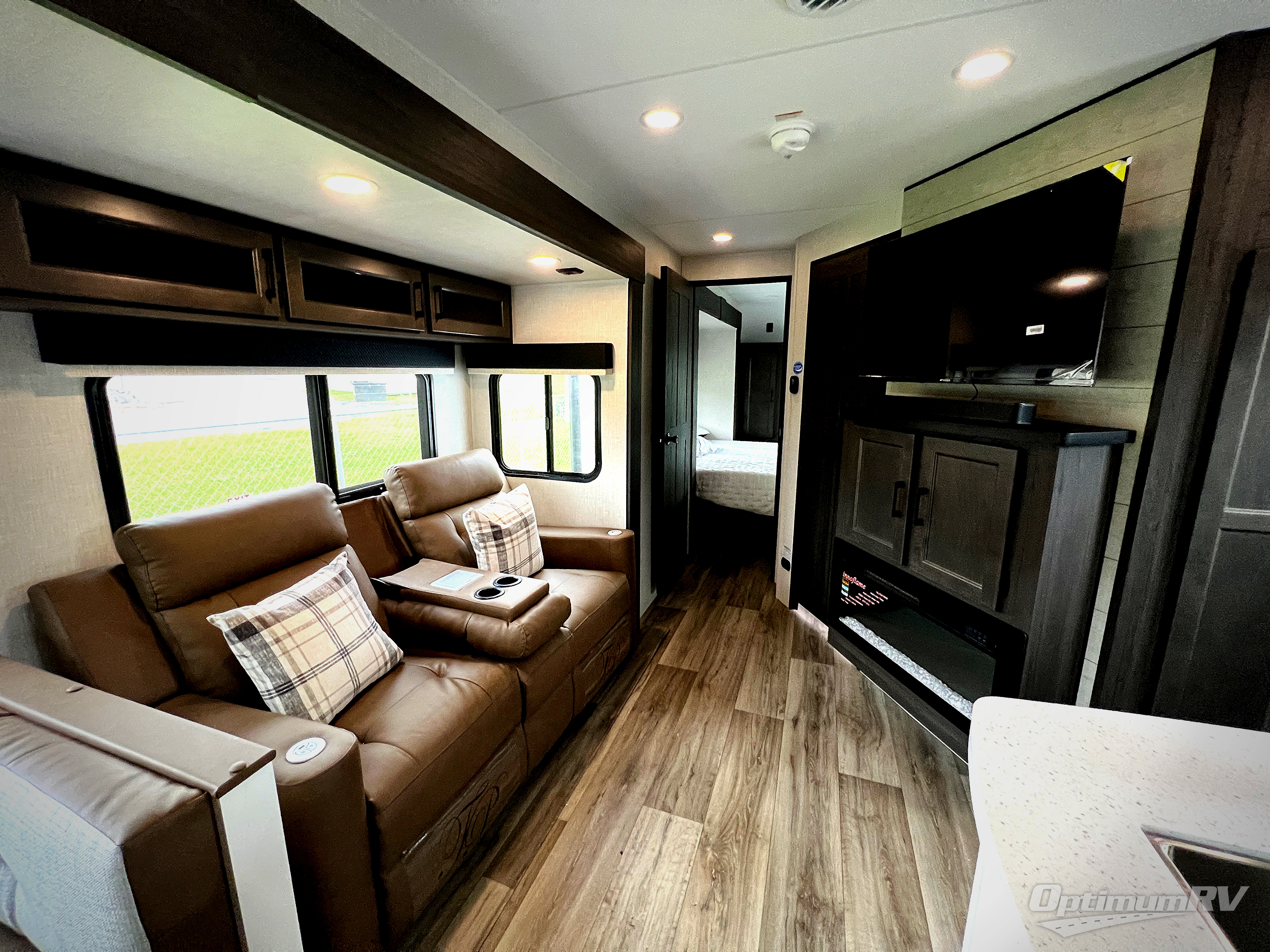 The whole family can camp together in this travel trailer! It features a rear private bunkhouse with a 28" x 70" top bunk above a 40" x 70" bottom bunk, a closet, and a 28" x 73" flip up top bunk above a 70" sofa with table slide. One of the dual entry doors leads directly into the half bathroom with fold-out aluminum steps so you can get back to having fun faster. The chef can prepare their best meals for the crew either indoors with the three burner cooktop or at the exterior campfire café with a 40" TV/DVD/speakers to entertain them while they cook. Everyone can gather together at the Sit N' Slide table and 70" tri-fold sofa across from the entertainment center with a fireplace for a cozy evening. The dual entry bathroom is easy to access, especially for those staying in the front private bedroom. You even have a coat closet next to the main entrance to limit the clutter!