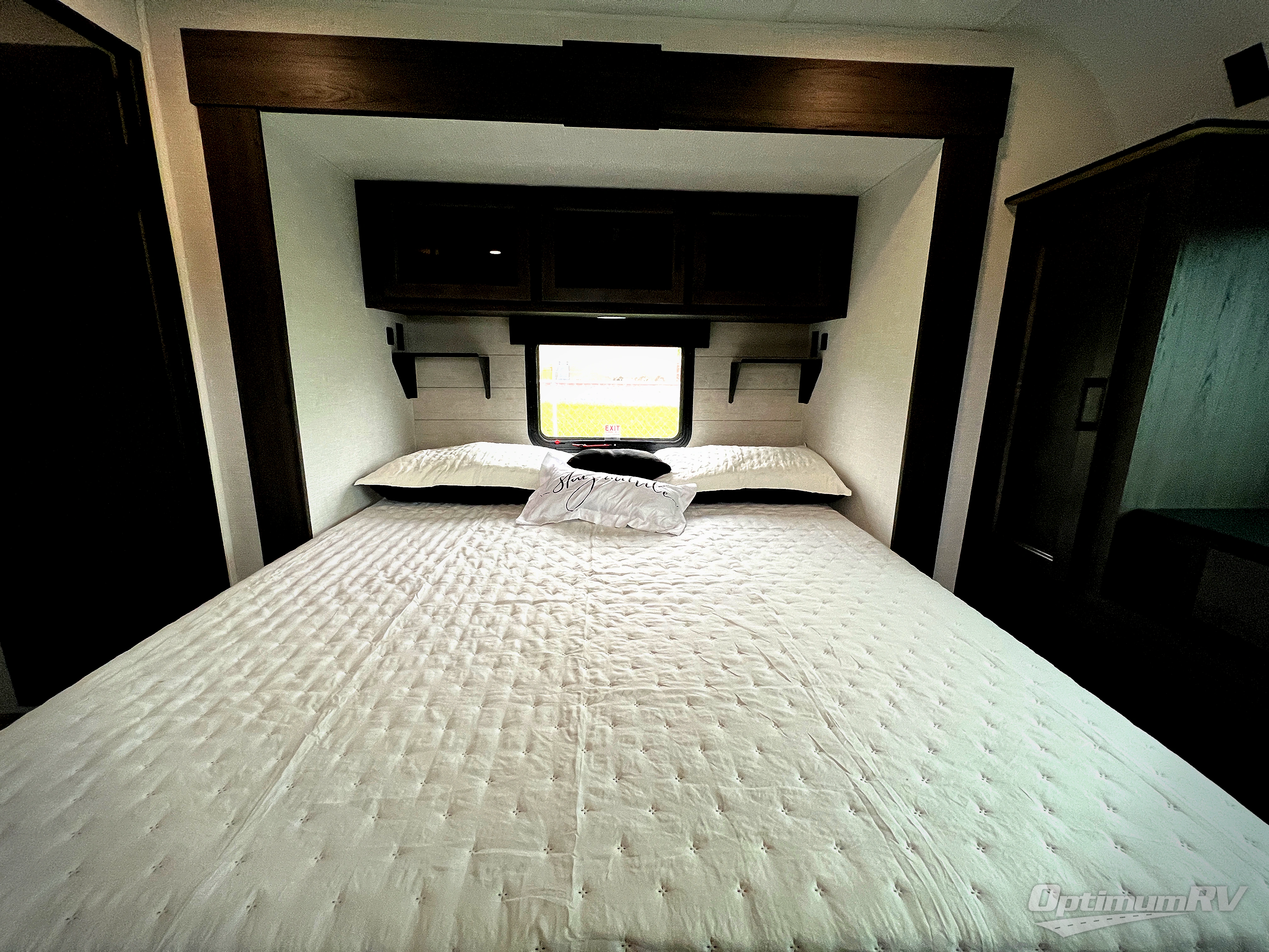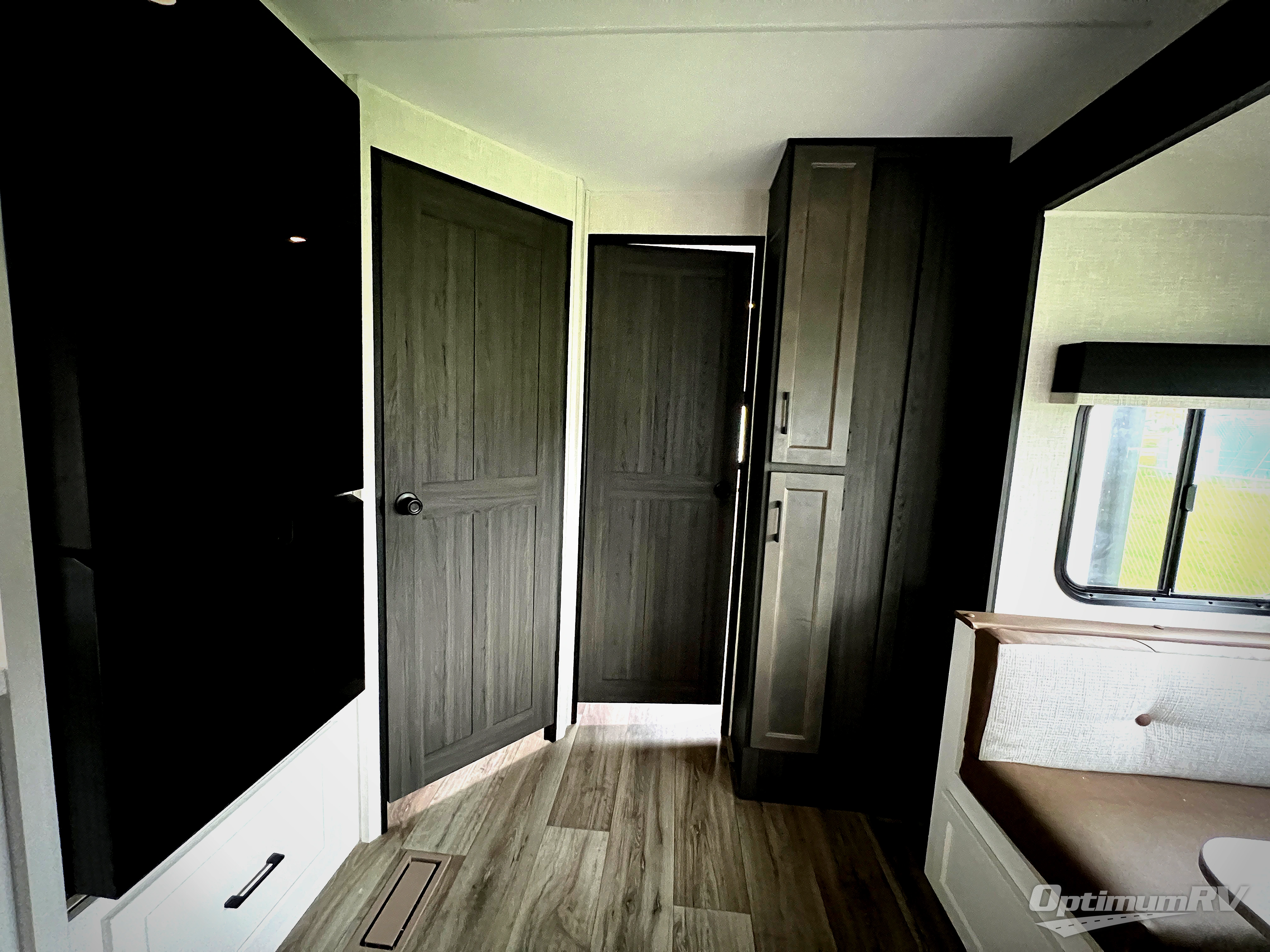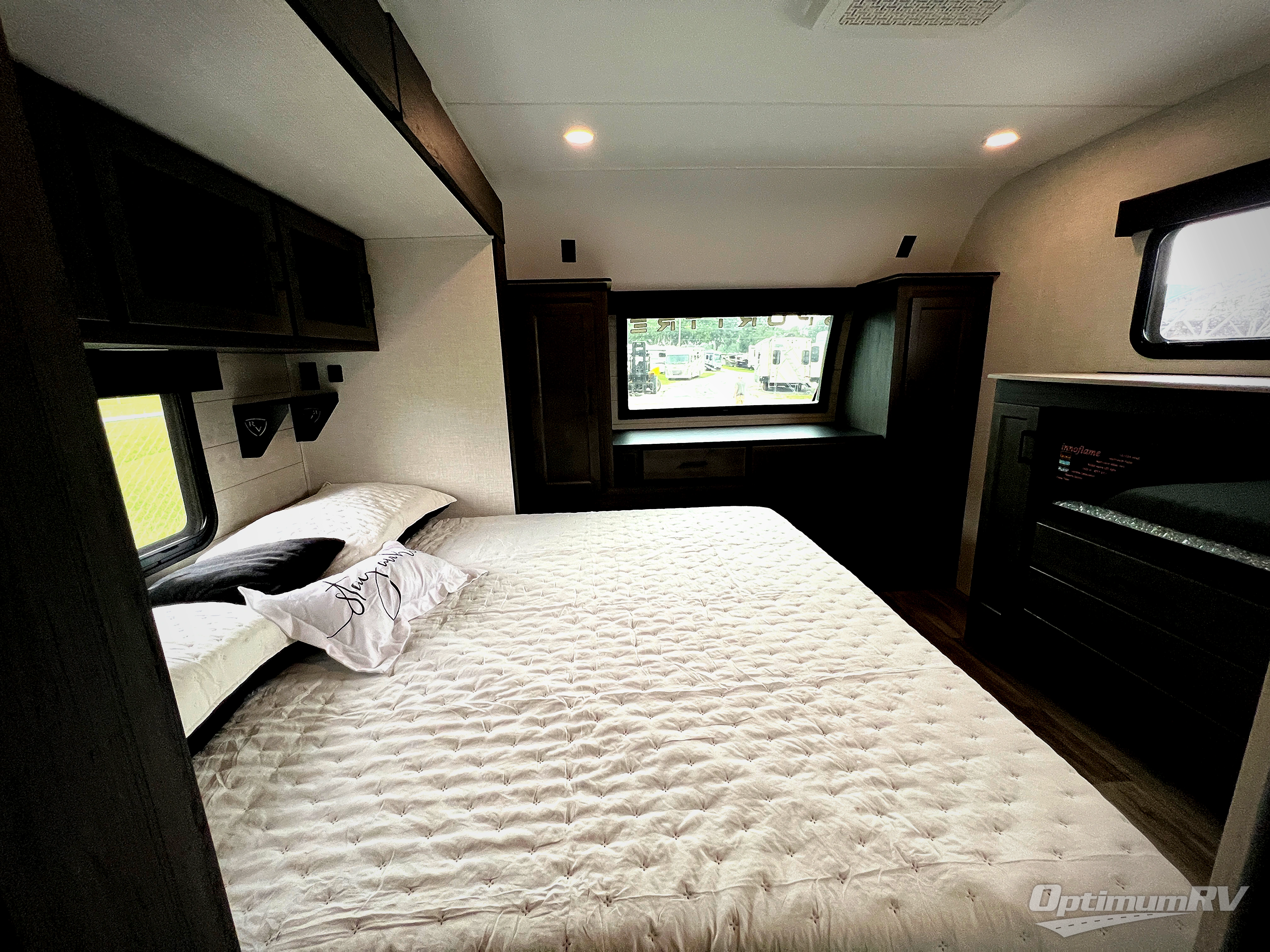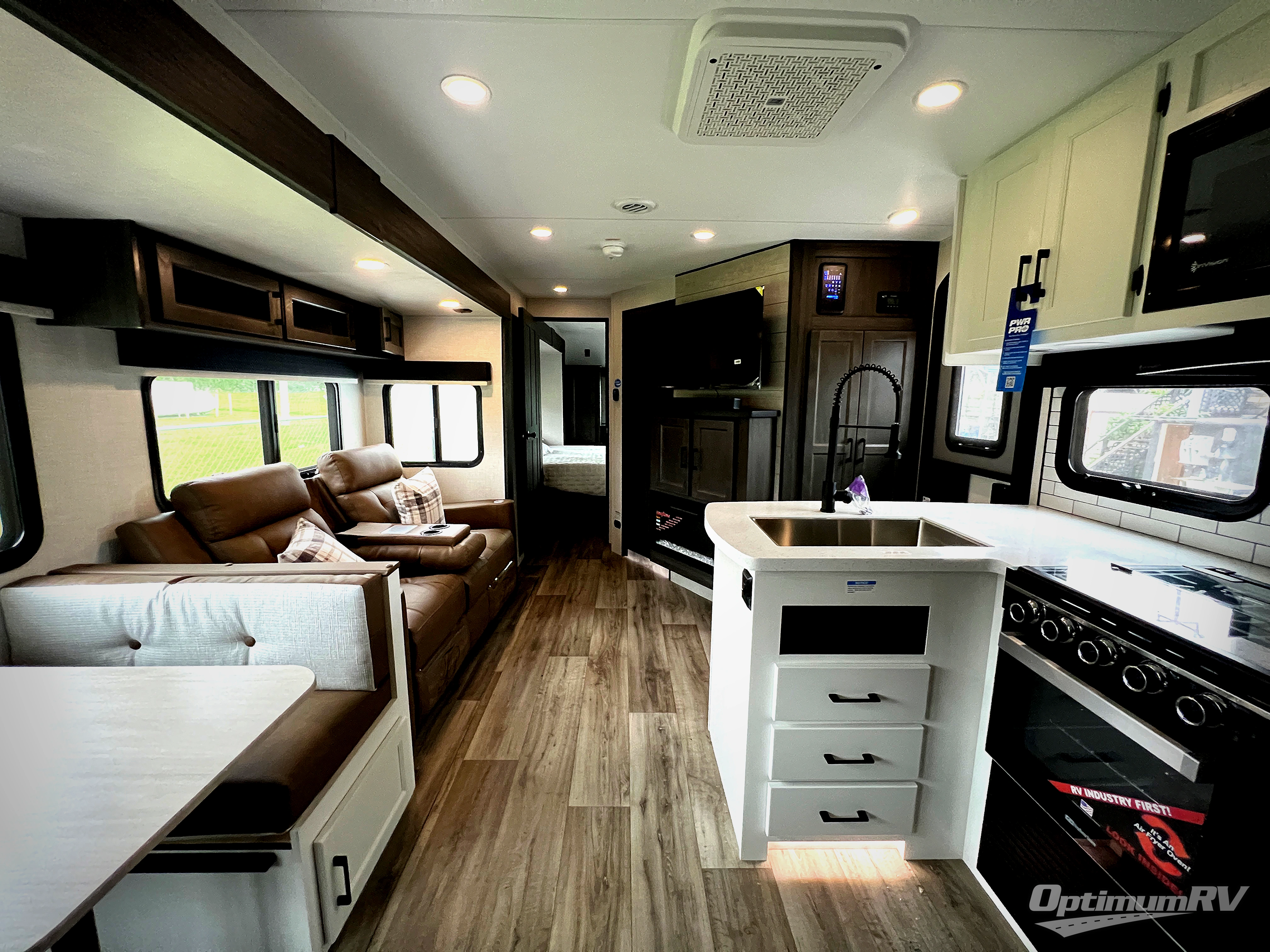 The whole family can camp together in this travel trailer! It features a rear private bunkhouse with a 28" x 70" top bunk above a 40" x 70" bottom bunk, a closet, and a 28" x 73" flip up top bunk above a 70" sofa with table slide. One of the dual entry doors leads directly into the half bathroom with fold-out aluminum steps so you can get back to having fun faster. The chef can prepare their best meals for the crew either indoors with the three burner cooktop or at the exterior campfire café with a 40" TV/DVD/speakers to entertain them while they cook. Everyone can gather together at the Sit N' Slide table and 70" tri-fold sofa across from the entertainment center with a fireplace for a cozy evening. The dual entry bathroom is easy to access, especially for those staying in the front private bedroom. You even have a coat closet next to the main entrance to limit the clutter!