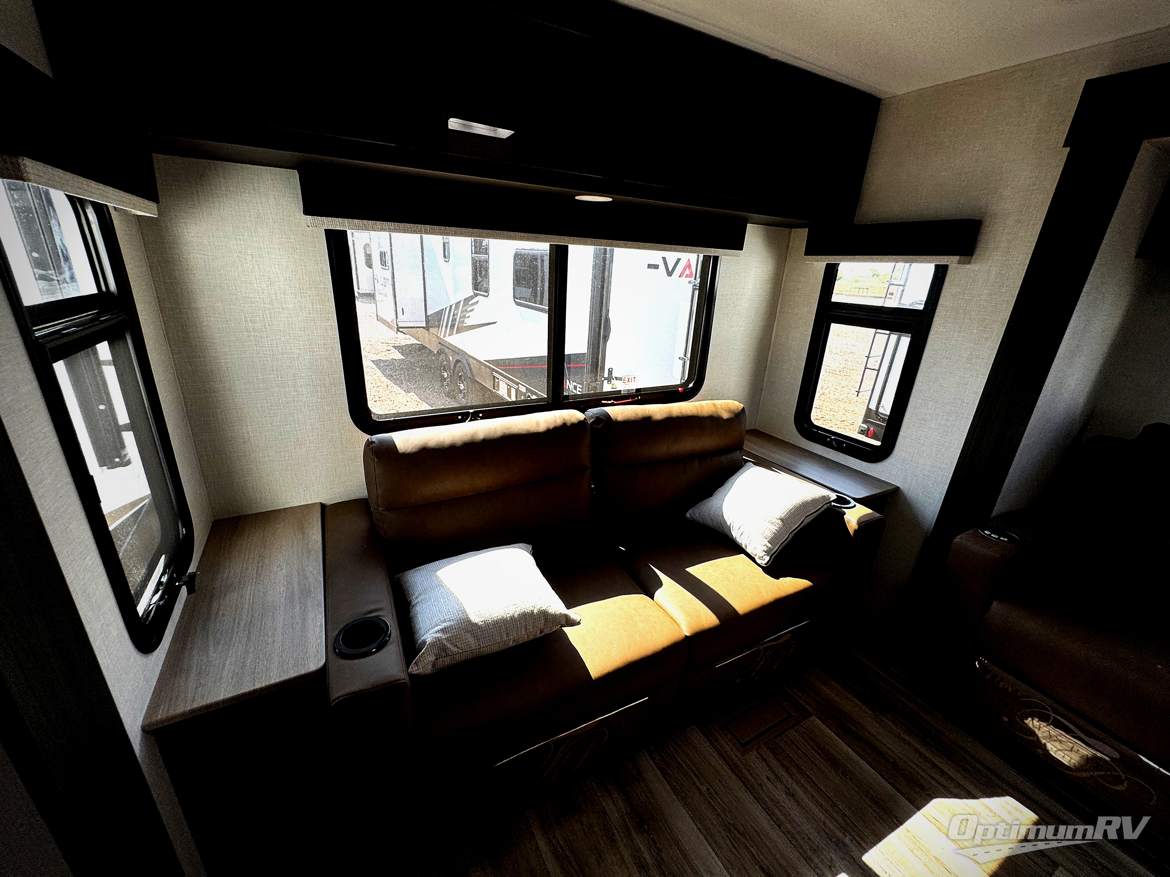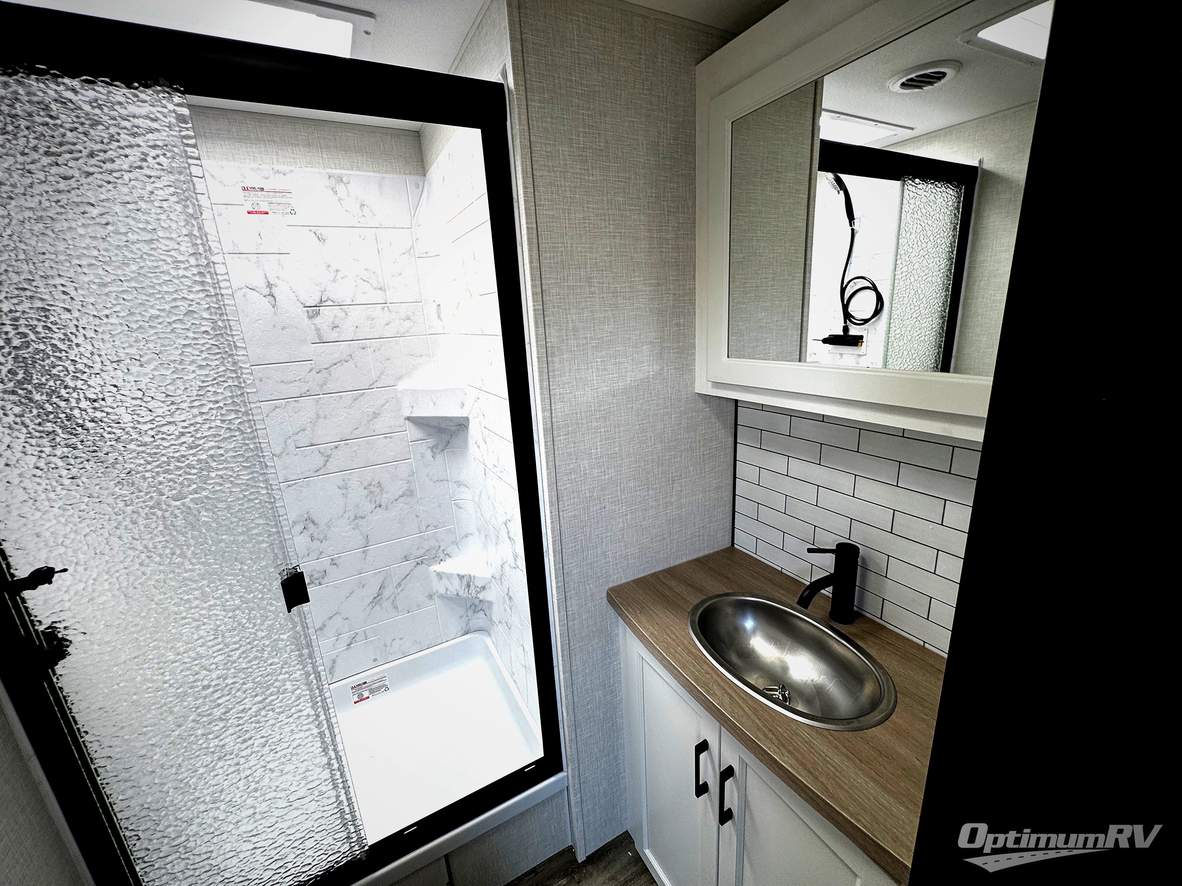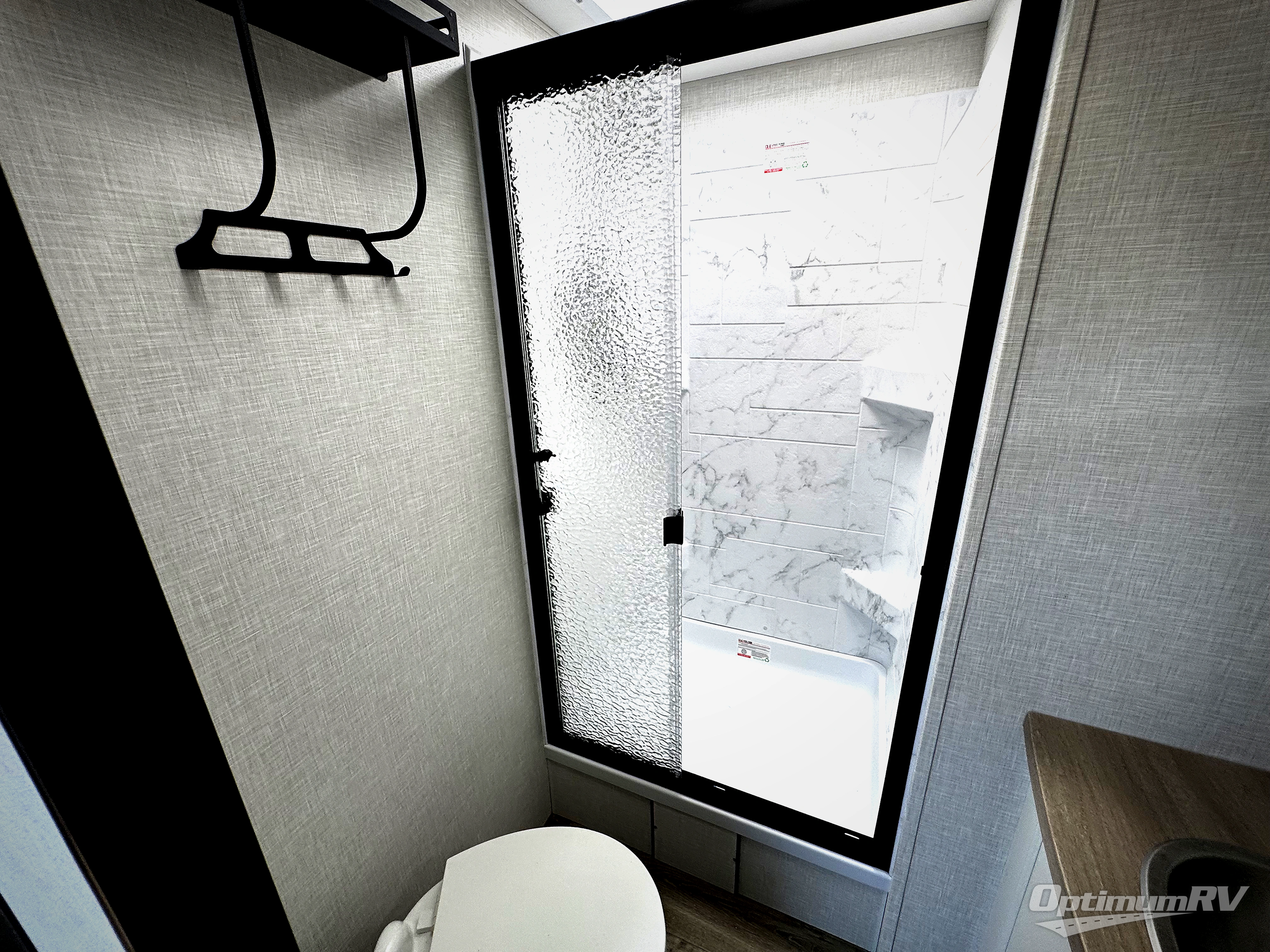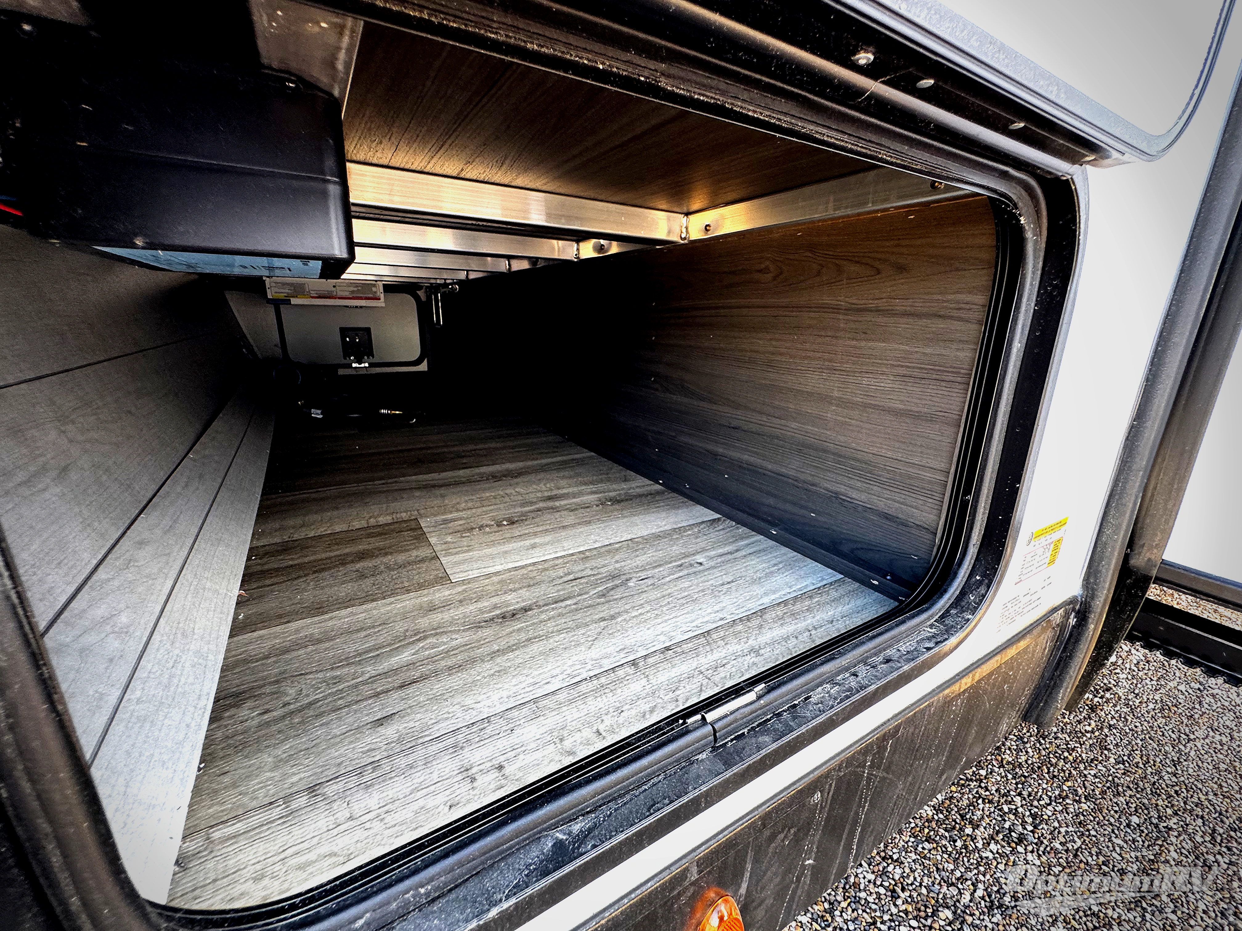 Pack your bags and hitch up this travel trailer for a great weekend camping trip! The front private bedroom has a 70" x 80" Sleep Tight king bed slide to lay your head at night, a dresser with a 30" frameless fireplace, a window seat with shelves on either side for your books, and a wardrobe with washer and dryer prep. Freshen up each morning in the full bathroom with the 30" x 36" shower then head to the kitchen to fry up some eggs on the three burner cooktop and pour a cold glass of orange juice stored in the 10 cu. ft. refrigerator. The kitchen island will make your meal prepping easier and the table and chairs offer a comfortable place to enjoy your meals or play card games. You could even cook your meals at the exterior campfire café and set up a table underneath one of the two power awnings!