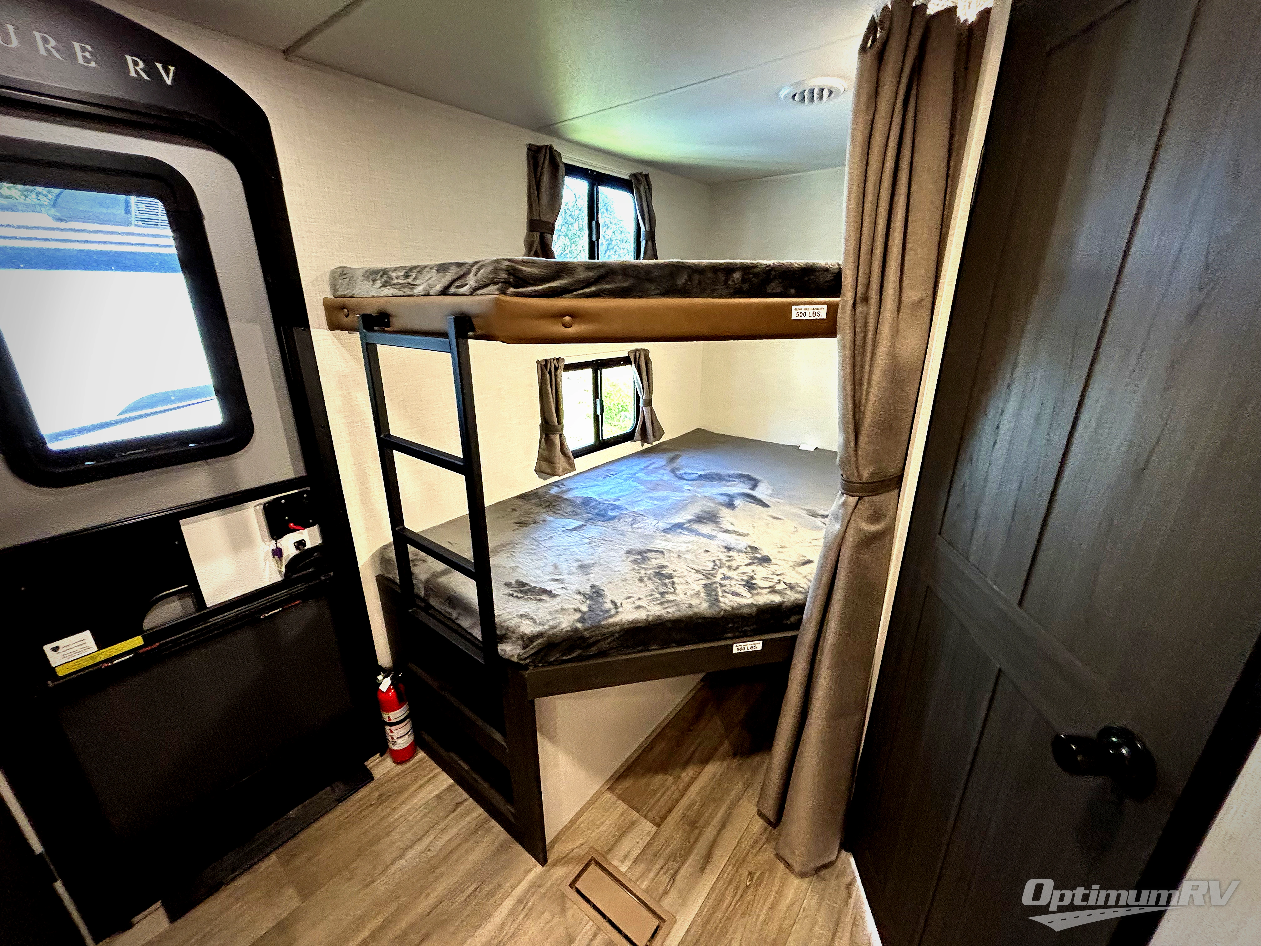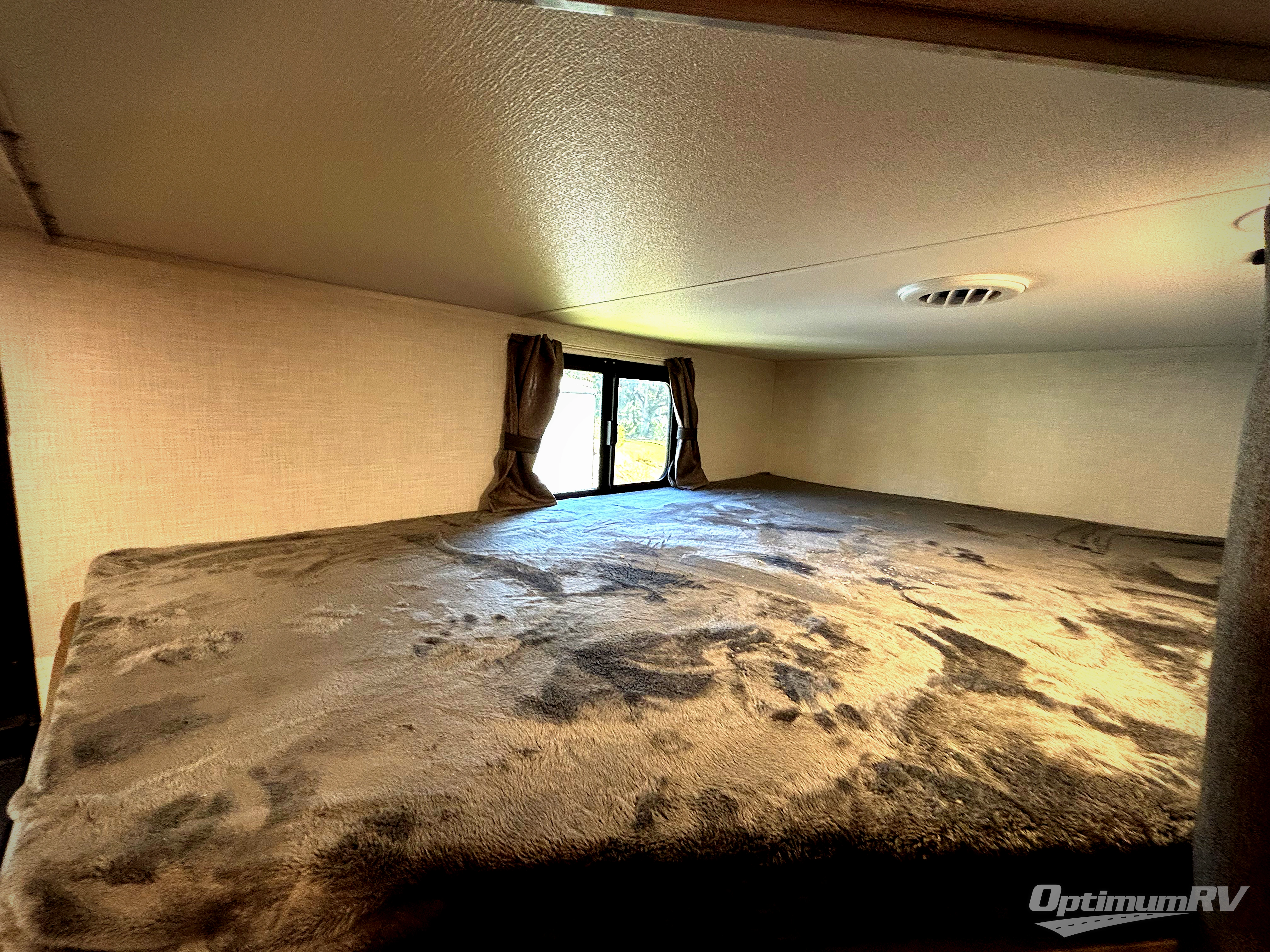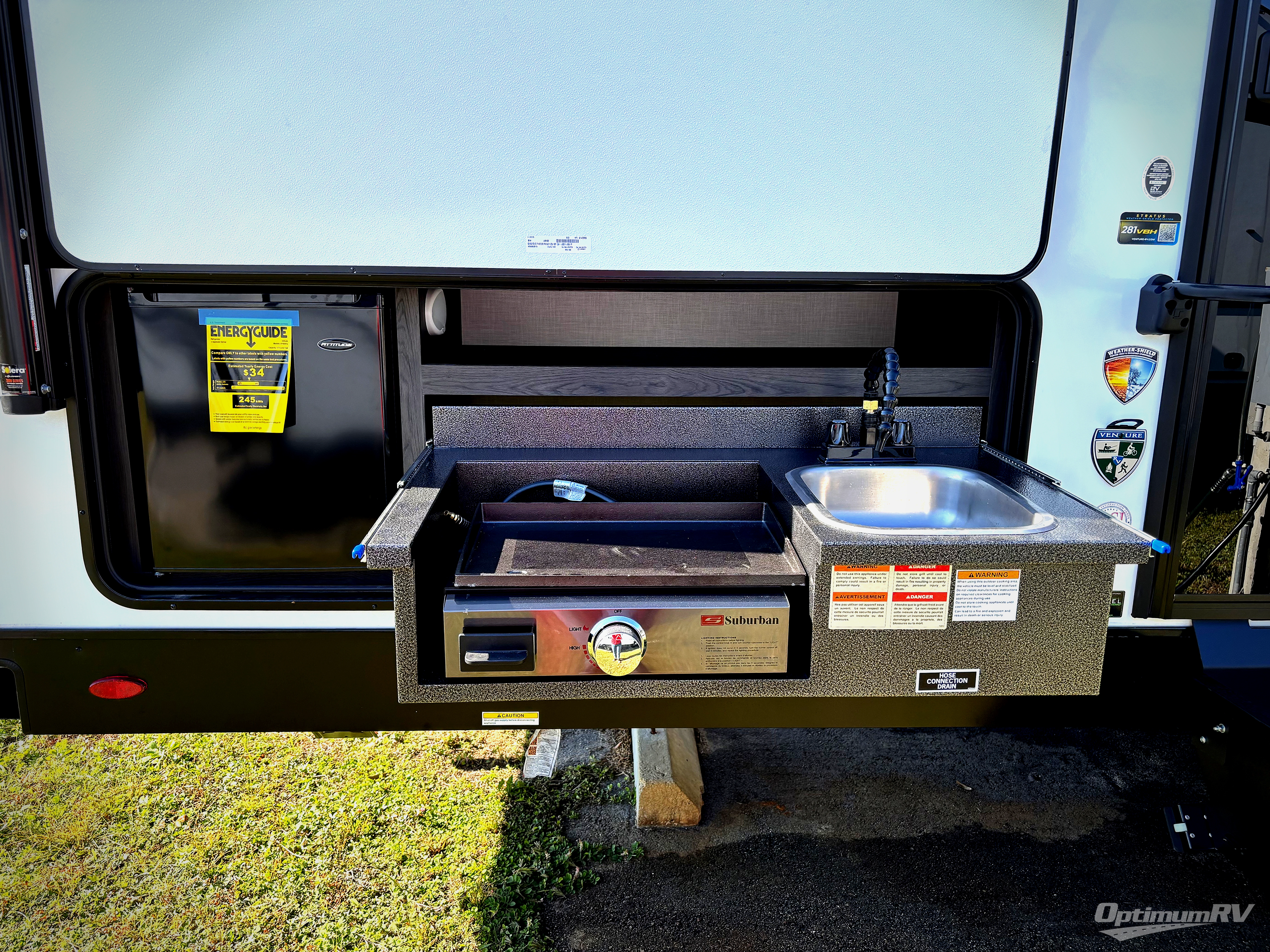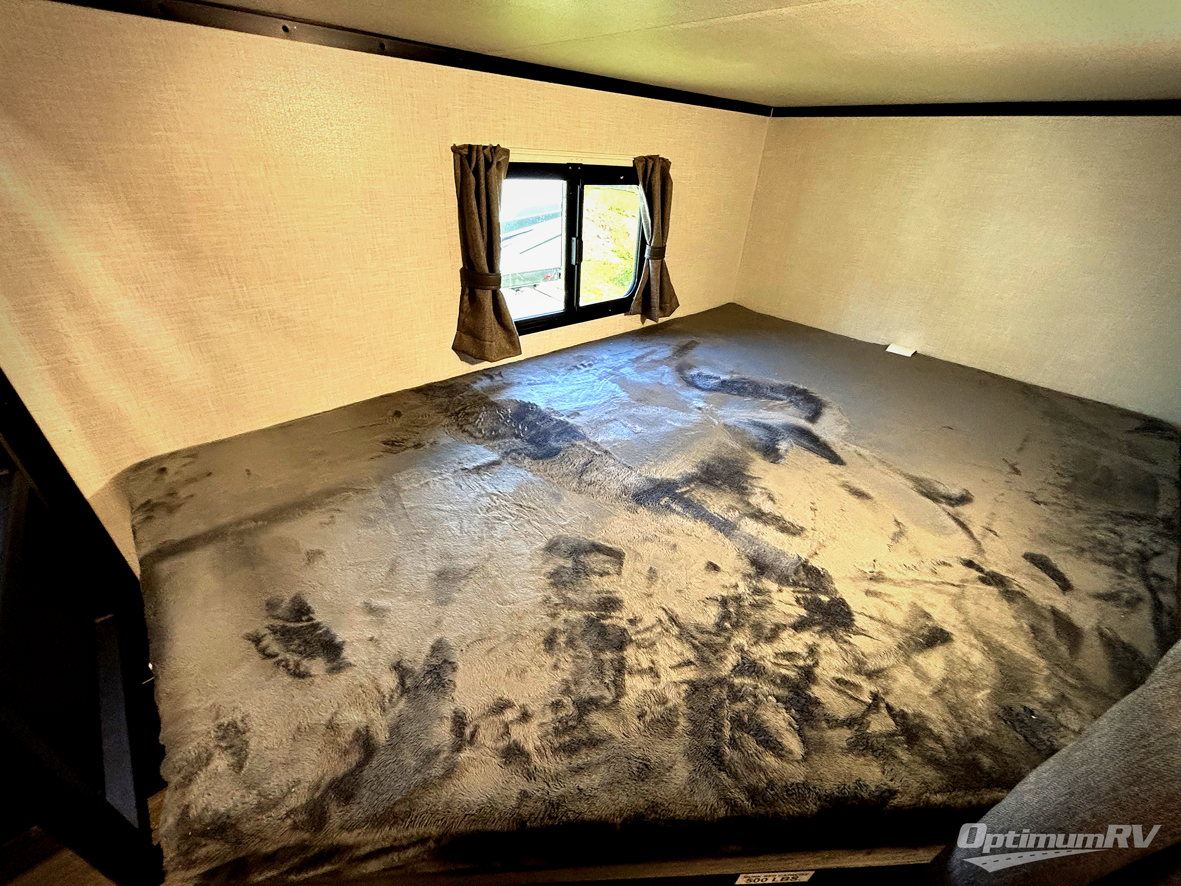 The whole family will have a fun time camping in this travel trailer! You will appreciate having your own space with the front private bedroom that has a sleep tight queen bed to lay your head on at night, and wardrobes on either side to hang your clothes. The kids can sleep on the set of 51" x 75" double bed bunks and can even invite a friend or two to tag along and sleep on either the 70" sofa or the 42" booth dinette once they are converted. Everyone can freshen up in the rear corner bathroom featuring a 30" x 36" shower. Behind the entertainment center is a walk-in pantry with coat hooks so you can store your jacket and groceries. The chef will enjoy cooking at the outside campfire café on the griddle, plus there is a refrigerator, and a sink for cleaning up!