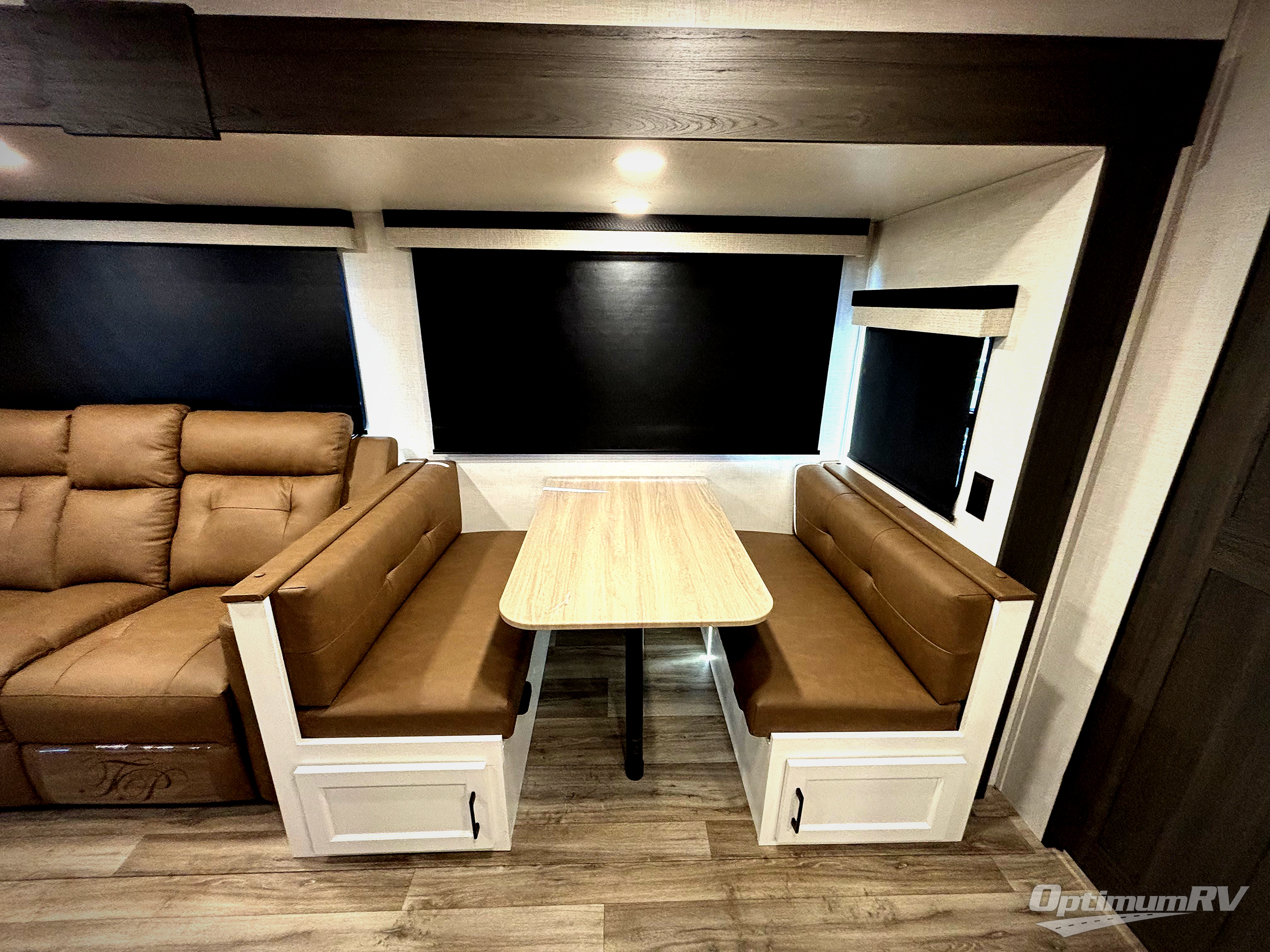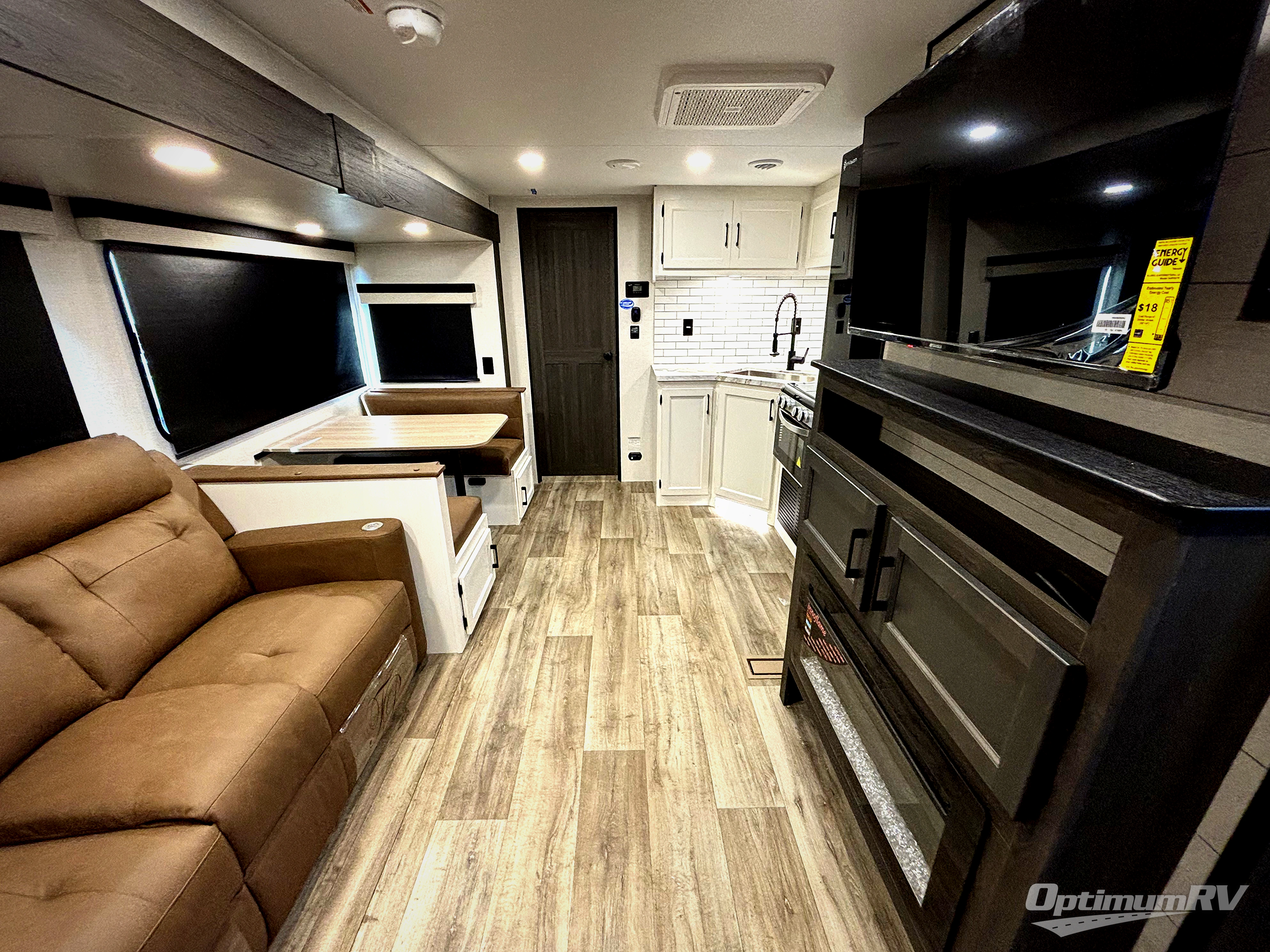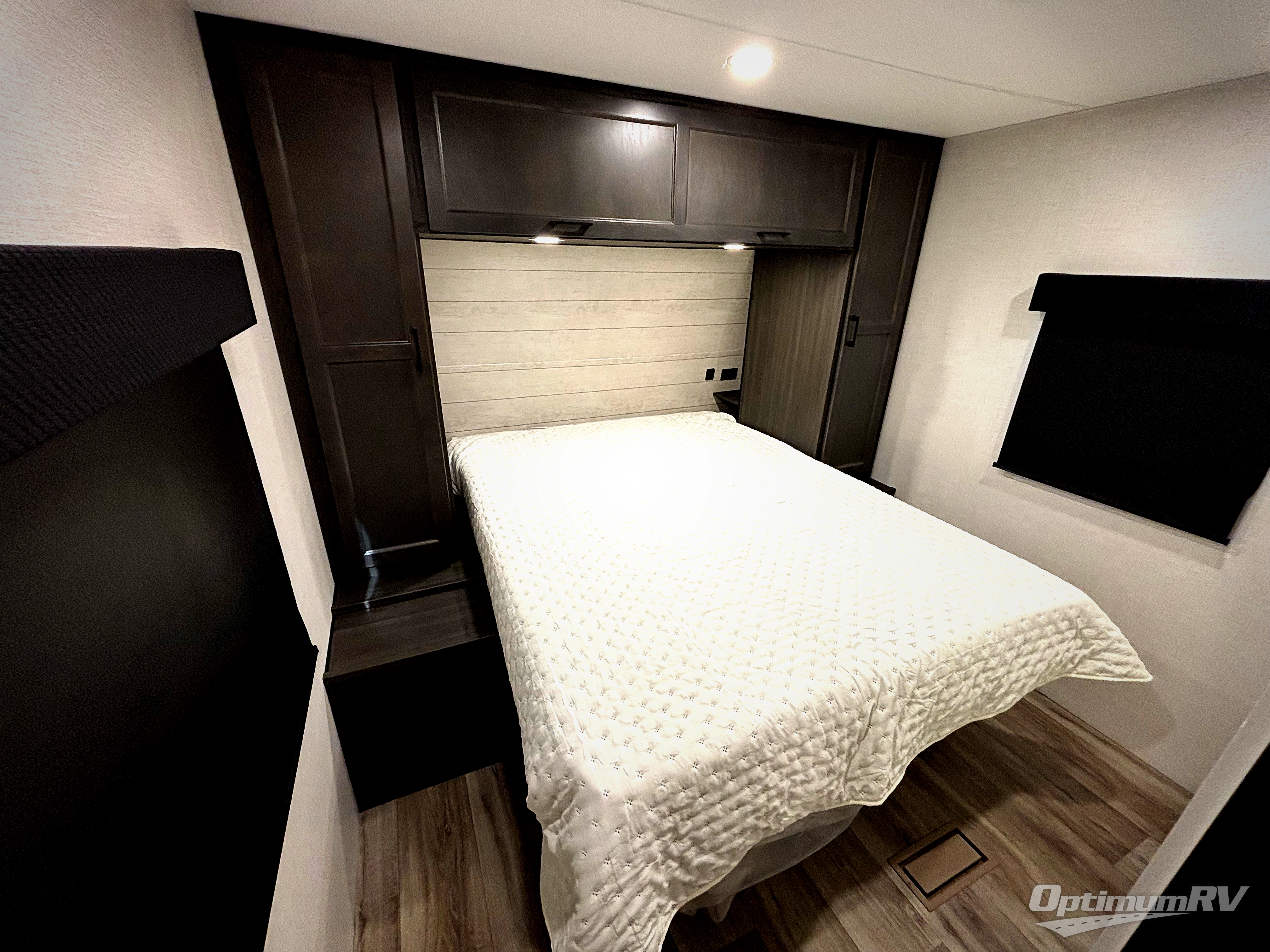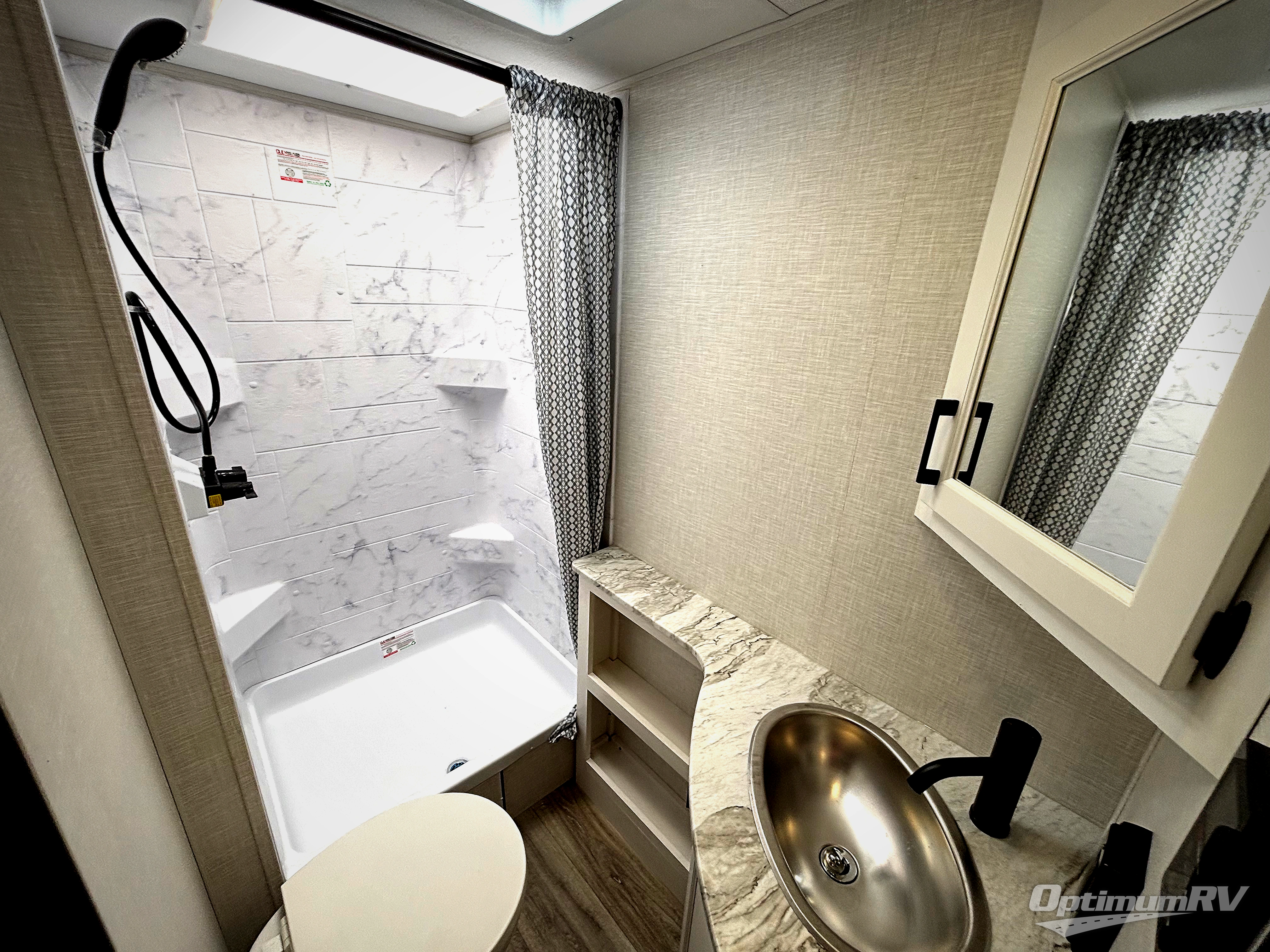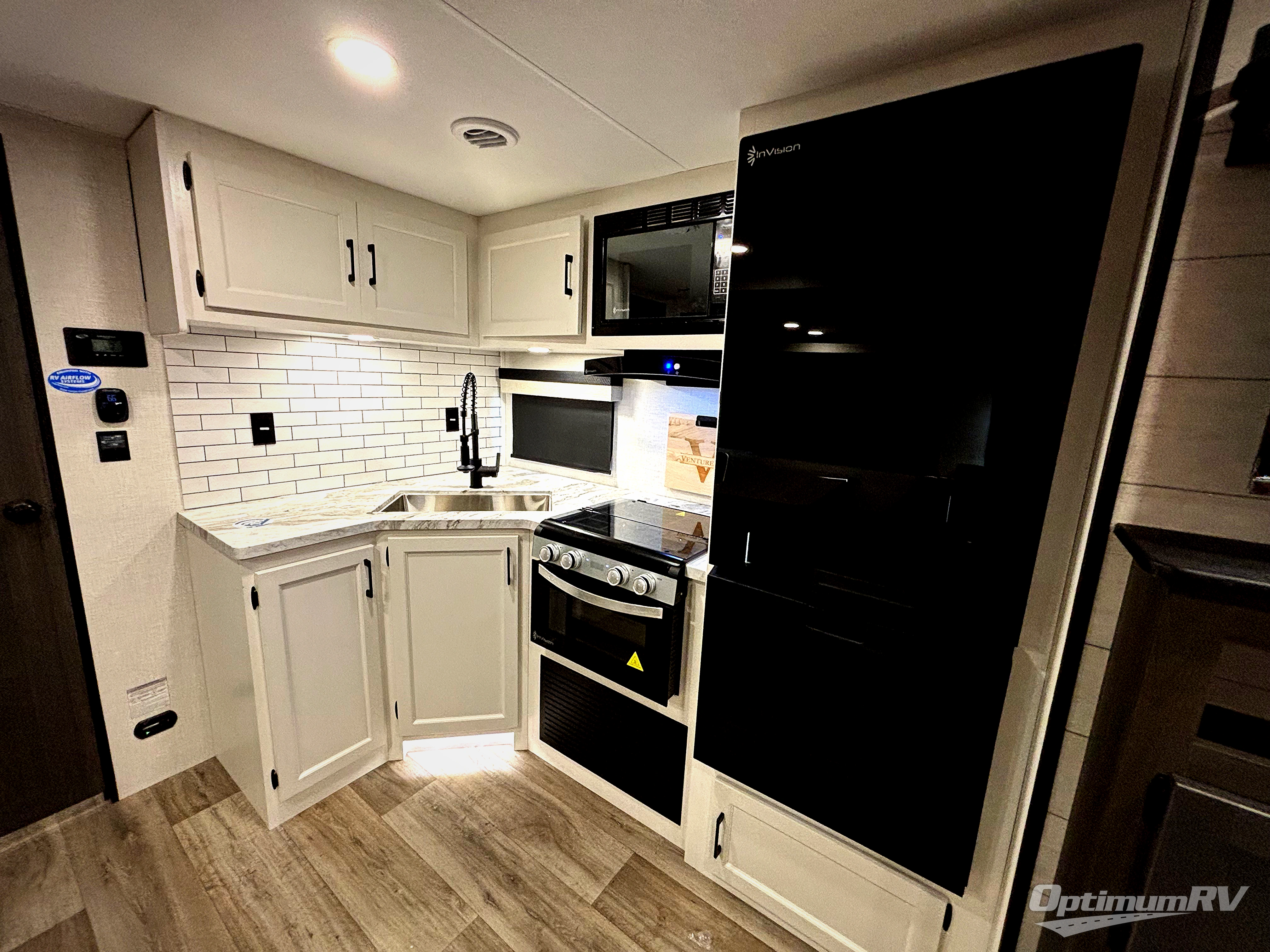 The whole family will have a fun time camping in this travel trailer! You will appreciate having your own space with the front private bedroom that has a sleep tight queen bed to lay your head on at night, and wardrobes on either side to hang your clothes. The kids can sleep on the set of 51" x 75" double bed bunks and can even invite a friend or two to tag along and sleep on either the 70" sofa or the 42" booth dinette once they are converted. Everyone can freshen up in the rear corner bathroom featuring a 30" x 36" shower. Behind the entertainment center is a walk-in pantry with coat hooks so you can store your jacket and groceries. The chef will enjoy cooking at the outside campfire café on the griddle, plus there is a refrigerator, and a sink for cleaning up!