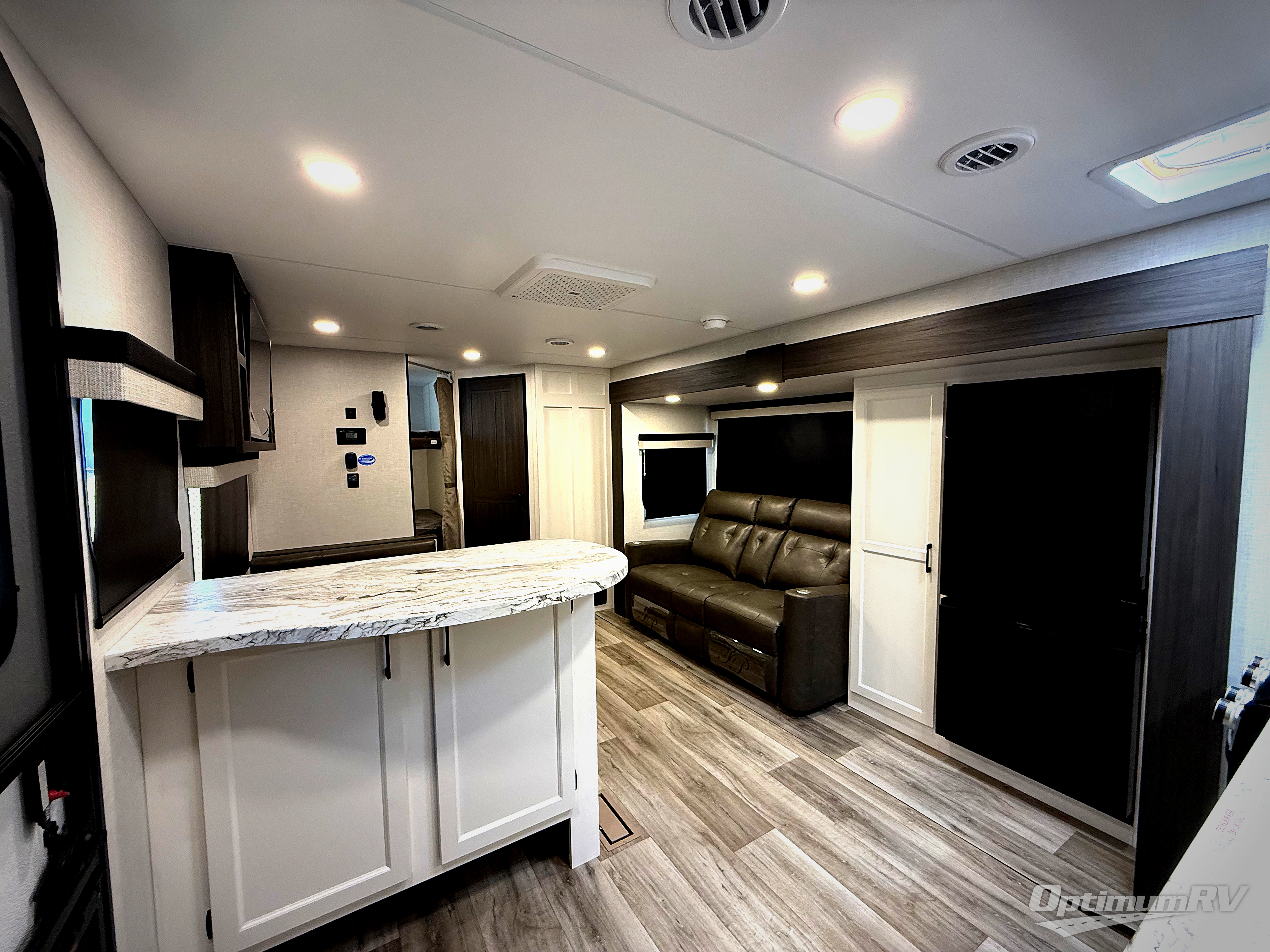 Sleep tight with your family on the road! This travel trailer is special for the whole family since it has plenty of space for sleep. First we have the 60" x 80" queen bed, the 51" x 75" double size bunk bed, you can also two people on the sit n' slide dinette and one more on the 70" sofa. Cook delicious dinner in the incredible kitchen. It includes stainless steel sink with cover and dish drying racks, three cooktop burner, 10 cu. refrigerator, pantry and an over head cabinet. However you can also have an amazing cooking time outside thanks to the outdoor kitchen, ideal ideal to share a meal with your family while enjoying nature and its surroundings. Store your belongings in the large closet beside the bed and also in the pass thru storage. Finally, take a relaxing bath in the full bathroom furnished with a 30" x 36" shower.