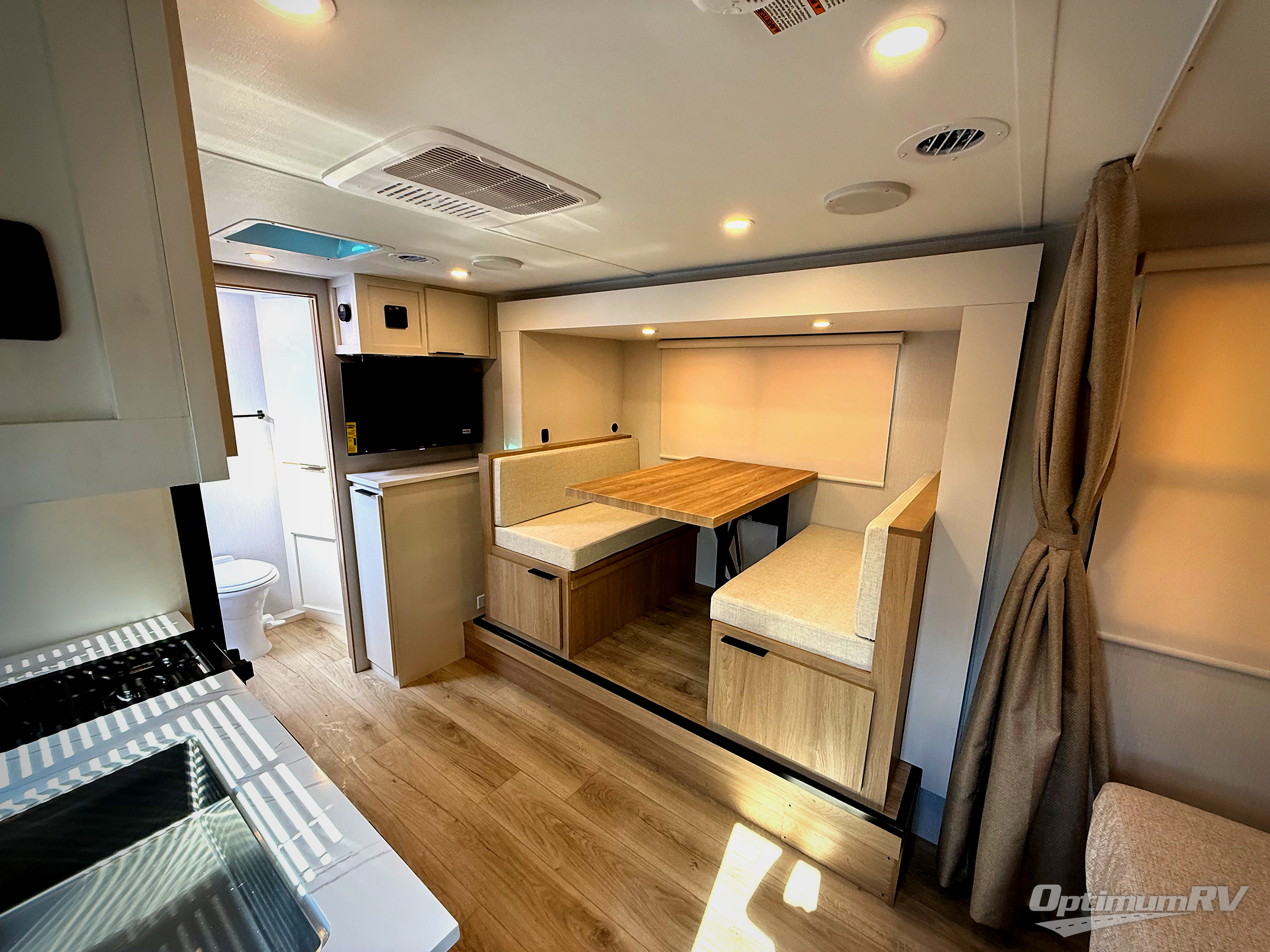 Pack your bags and head to the campground with this travel trailer! You will love all that it has to offer from the full rear bathroom to the front 60" x 74" RV queen-size bed with dual wardrobes on either side of the bed. The 44" x 72" booth dinette slide is not only a great place to enjoy your meals at or play card games, but it can also be transformed into an extra sleeping space if you want to bring along a guest. When you don't feel like making dinner, you can easily pop in some leftovers or a bag of popcorn into the convection microwave and relax while you watch a movie on the Smart TV!