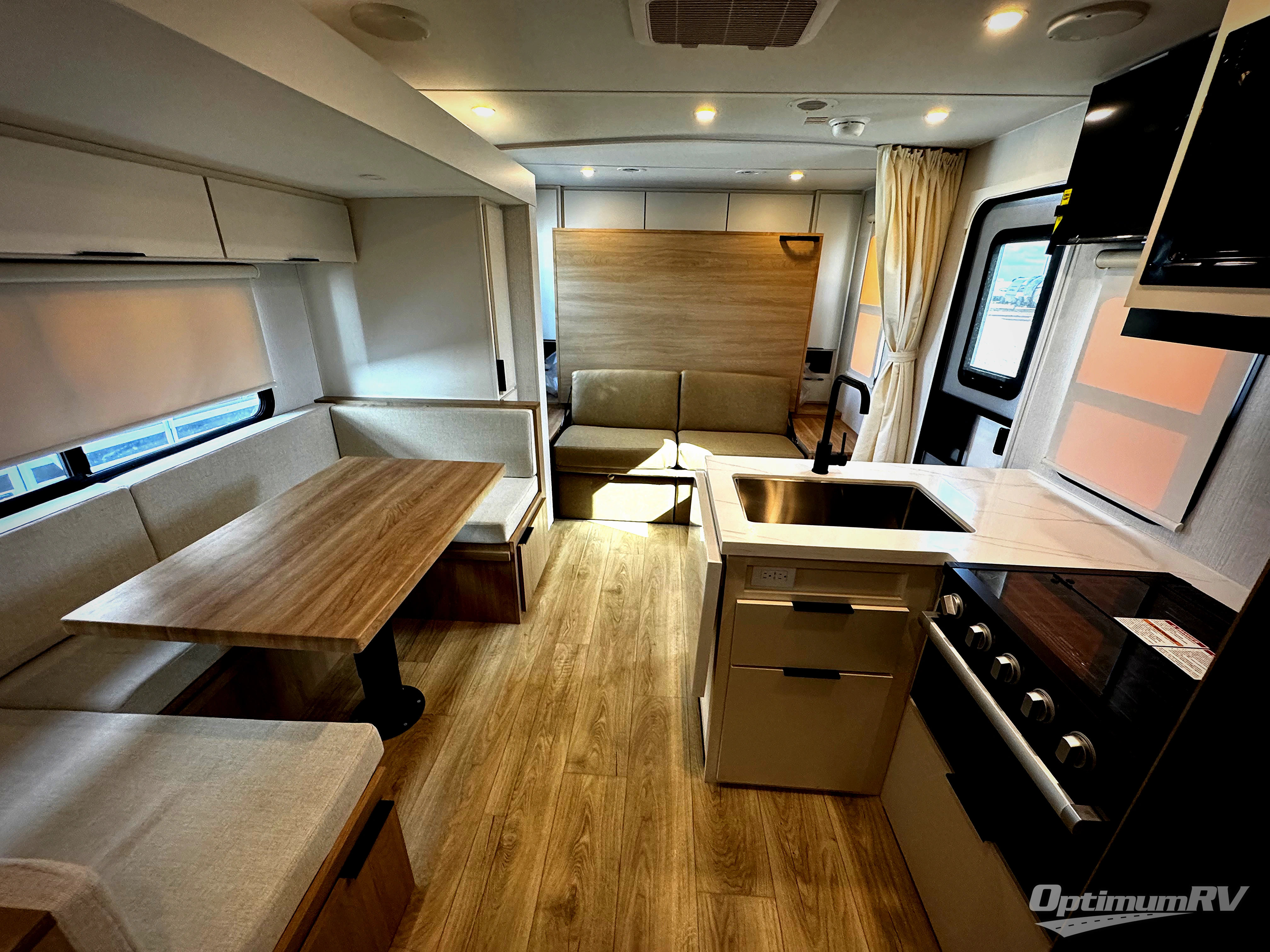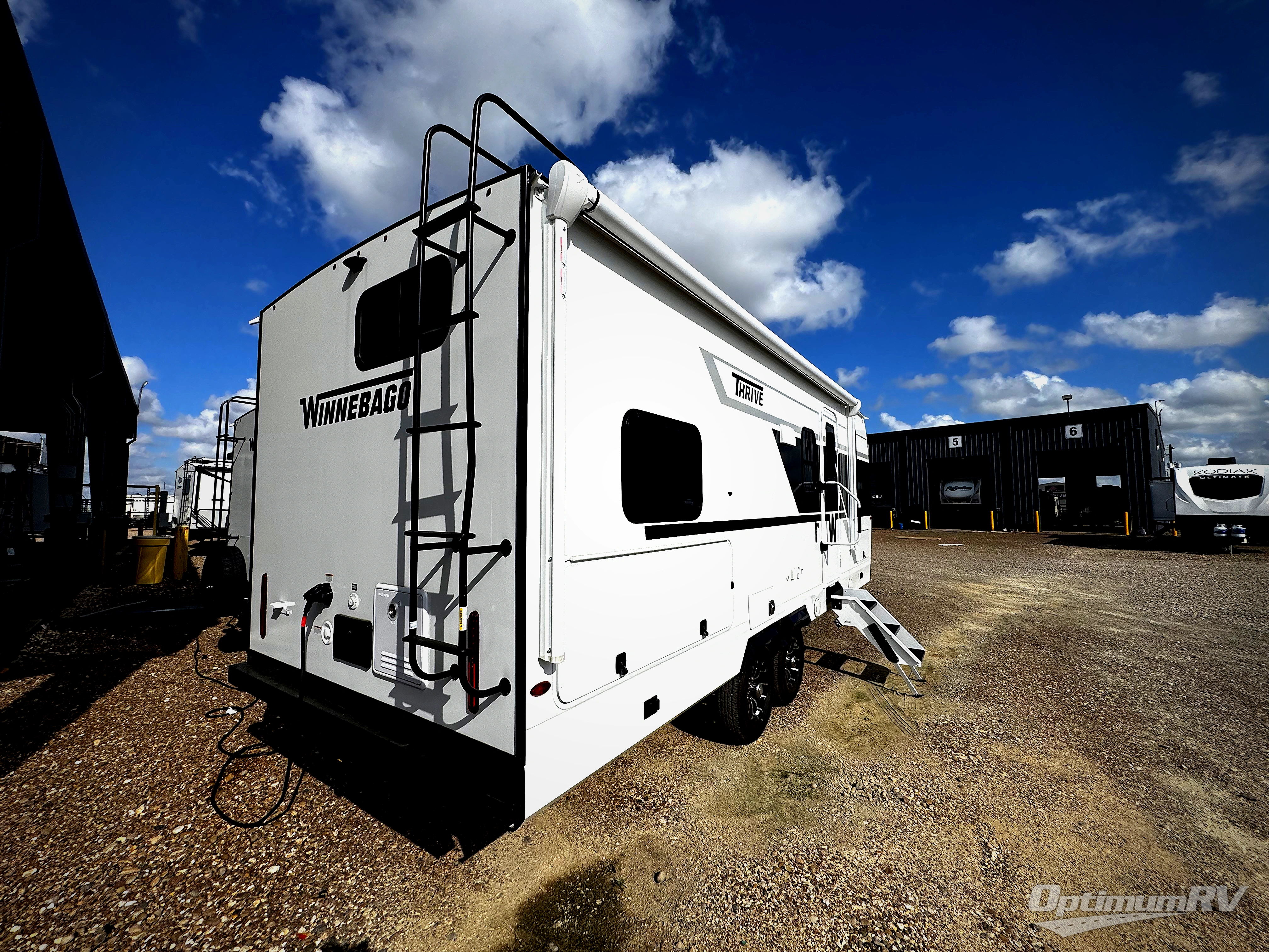 With any Thrive travel trailer by Winnebago, you can camp with functionality, comfort, and convenience! The tinted and frameless front window will be the first thing that catches your eye, and the fiberglass sidewalls with Azdel Onboard provide a durable trailer made to last. There is also an exterior ladder, along with front radius profile lights, power stabilizer jacks, and a powered awning with LED lighting to name a few exterior features. You will stay powered up by the 30-amp power cord and 200-watt solar panel, plus there is a tankless water heater for endless hot showers. Inside, you'll love the custom Winnebago furniture, carpetless side outs, molded fiberglass countertops, and residential recessed ceiling lights to keep your space well lit!