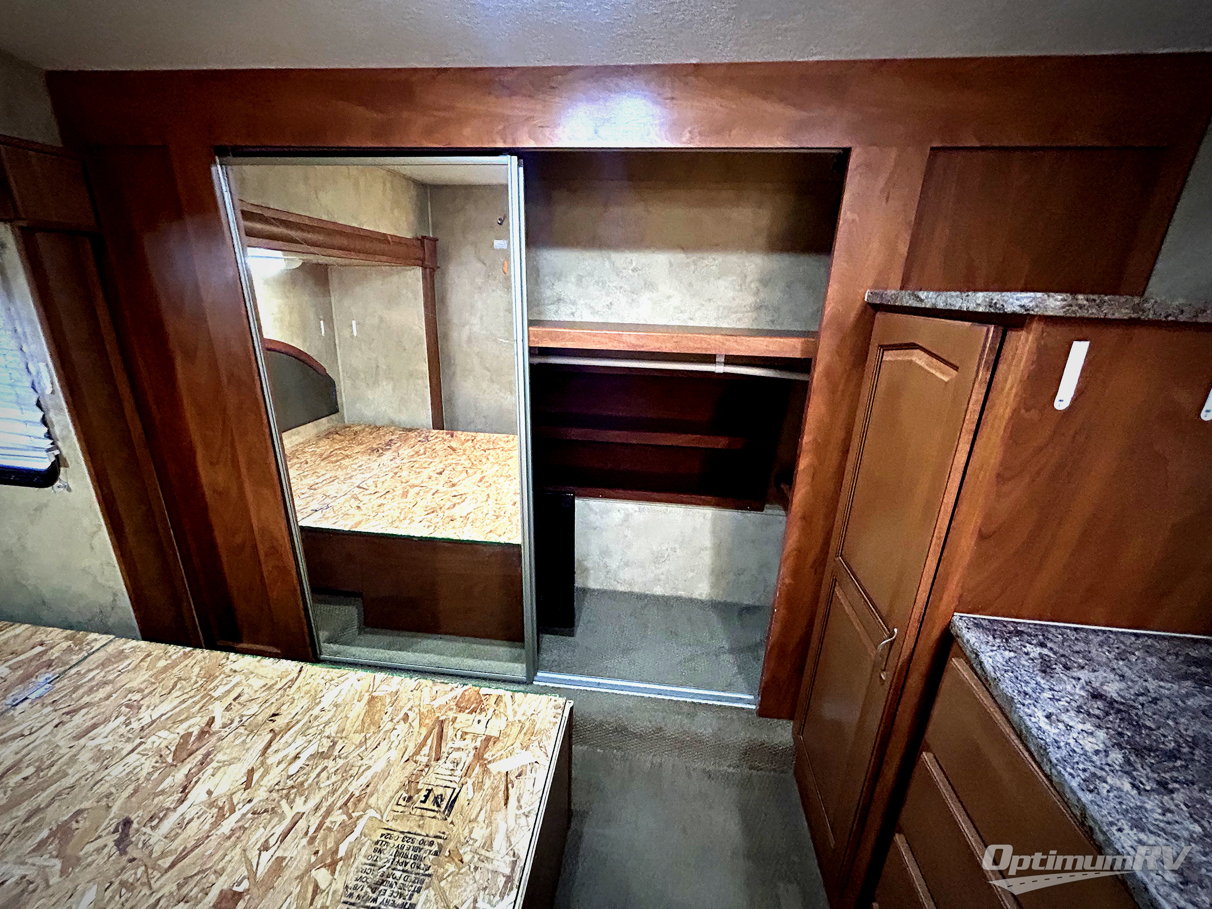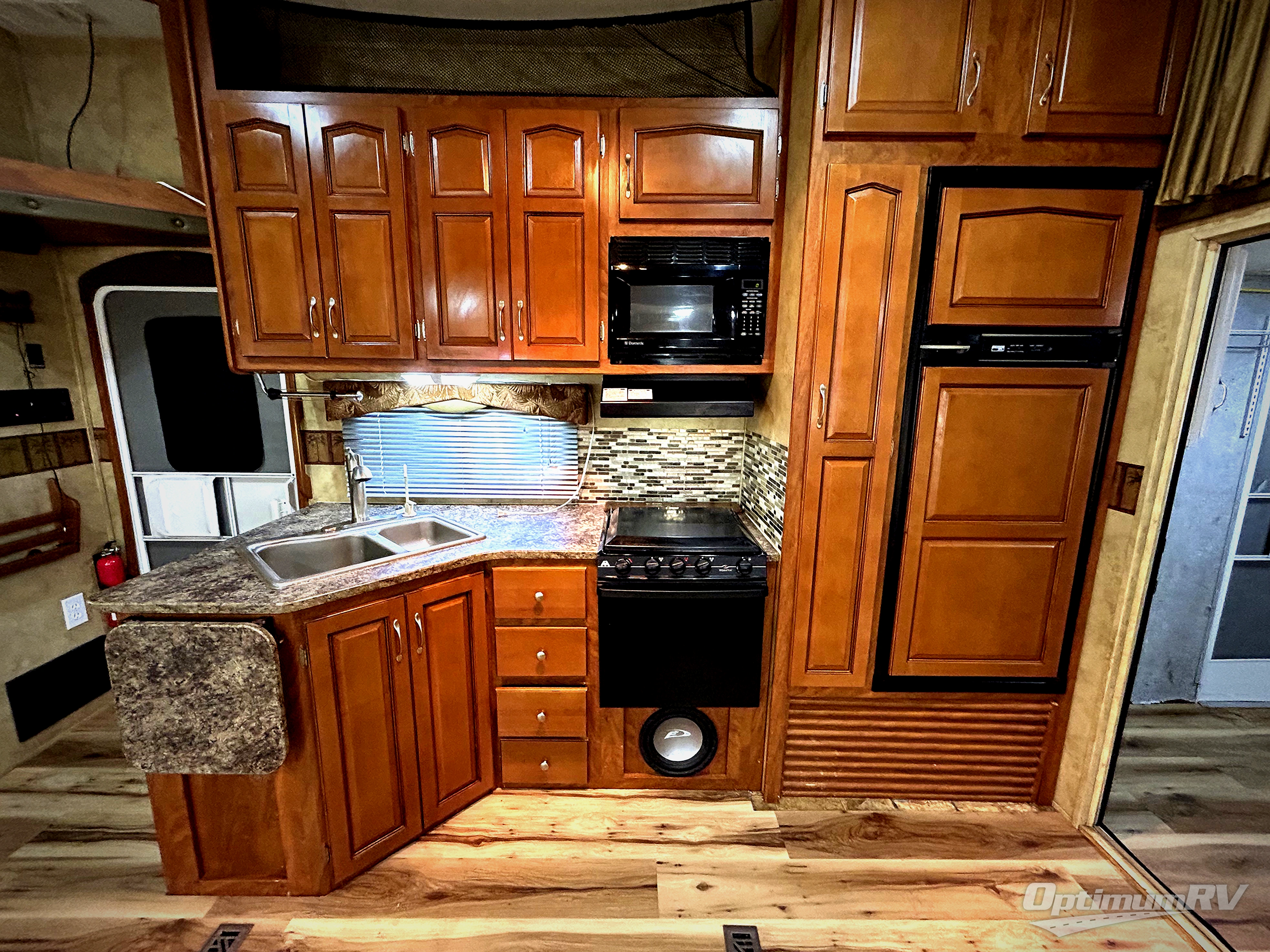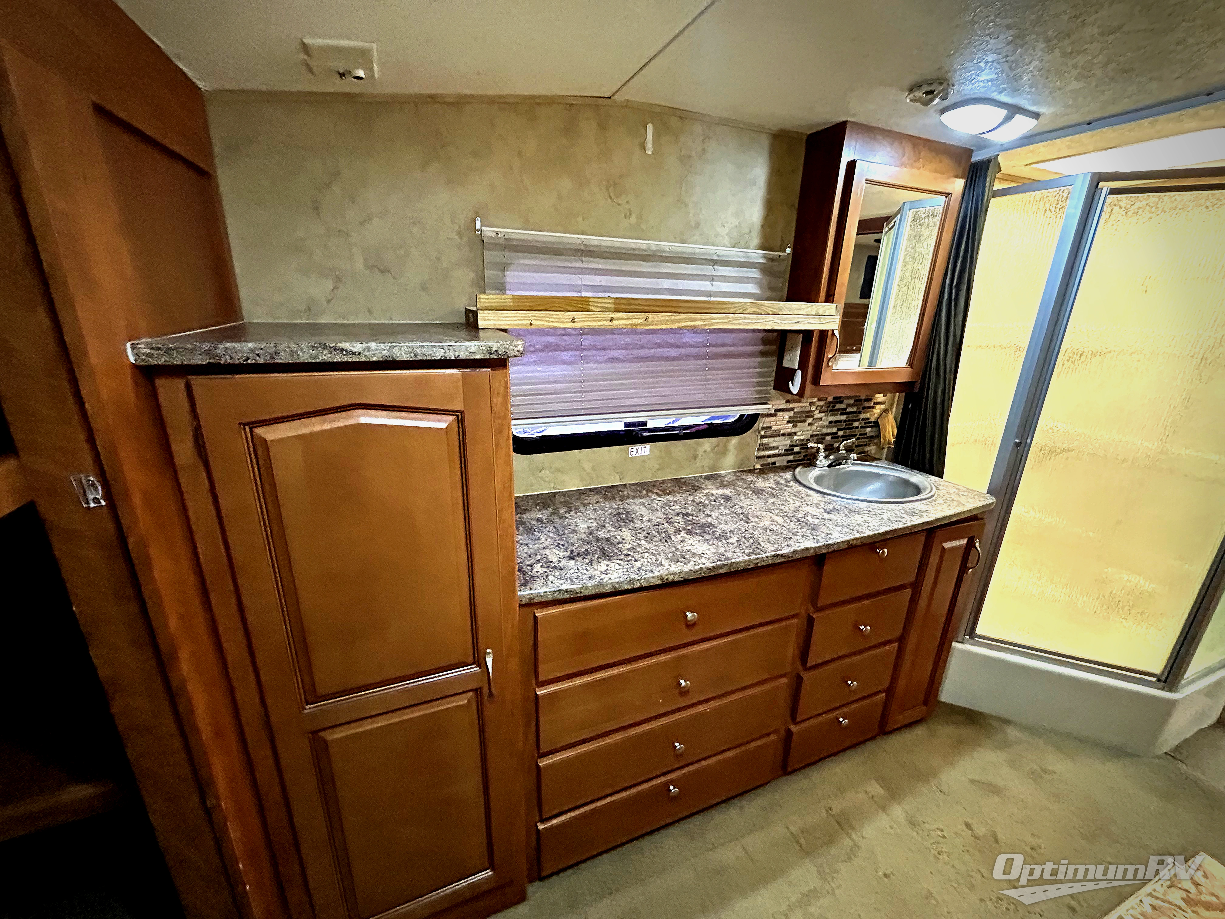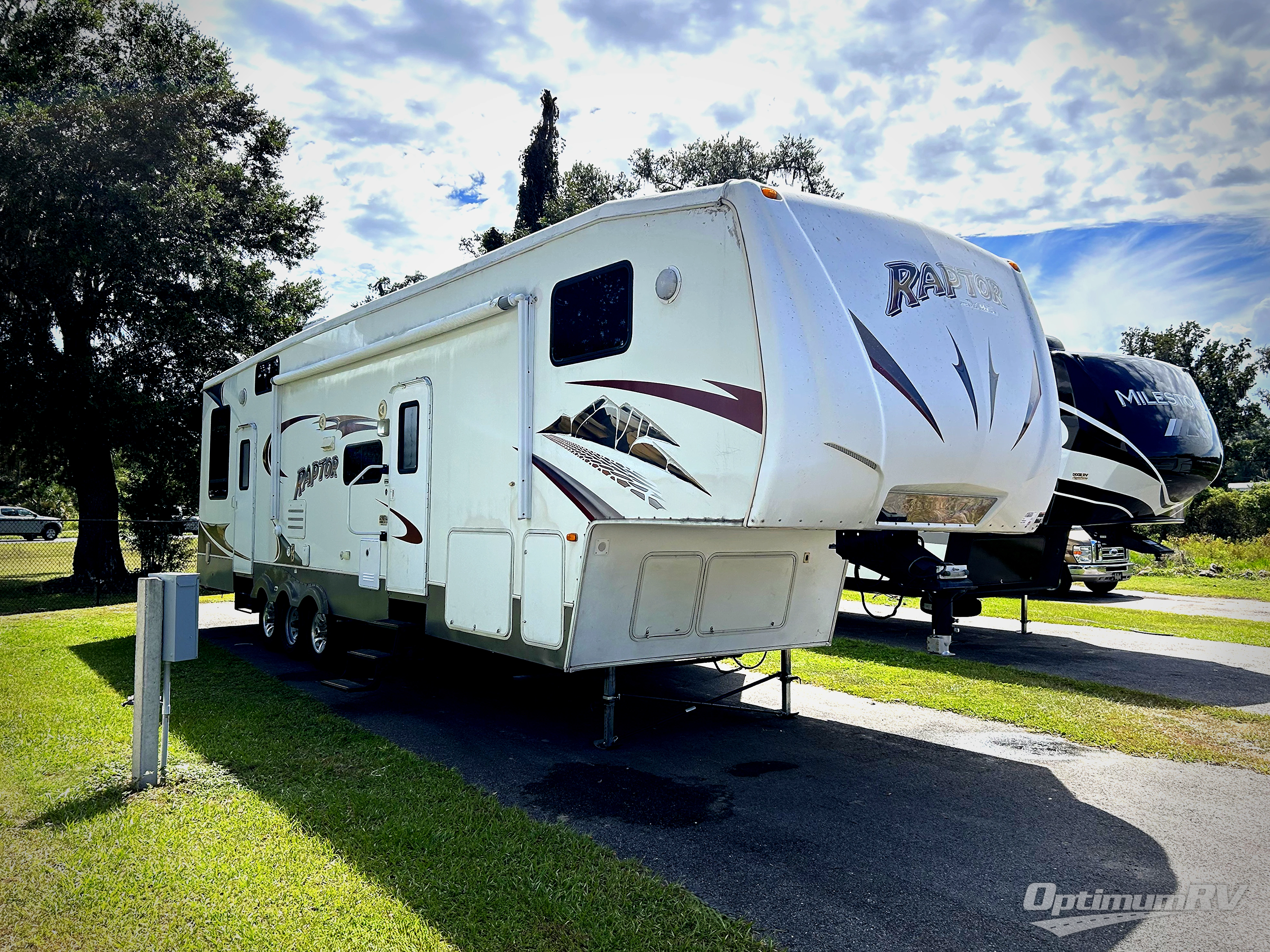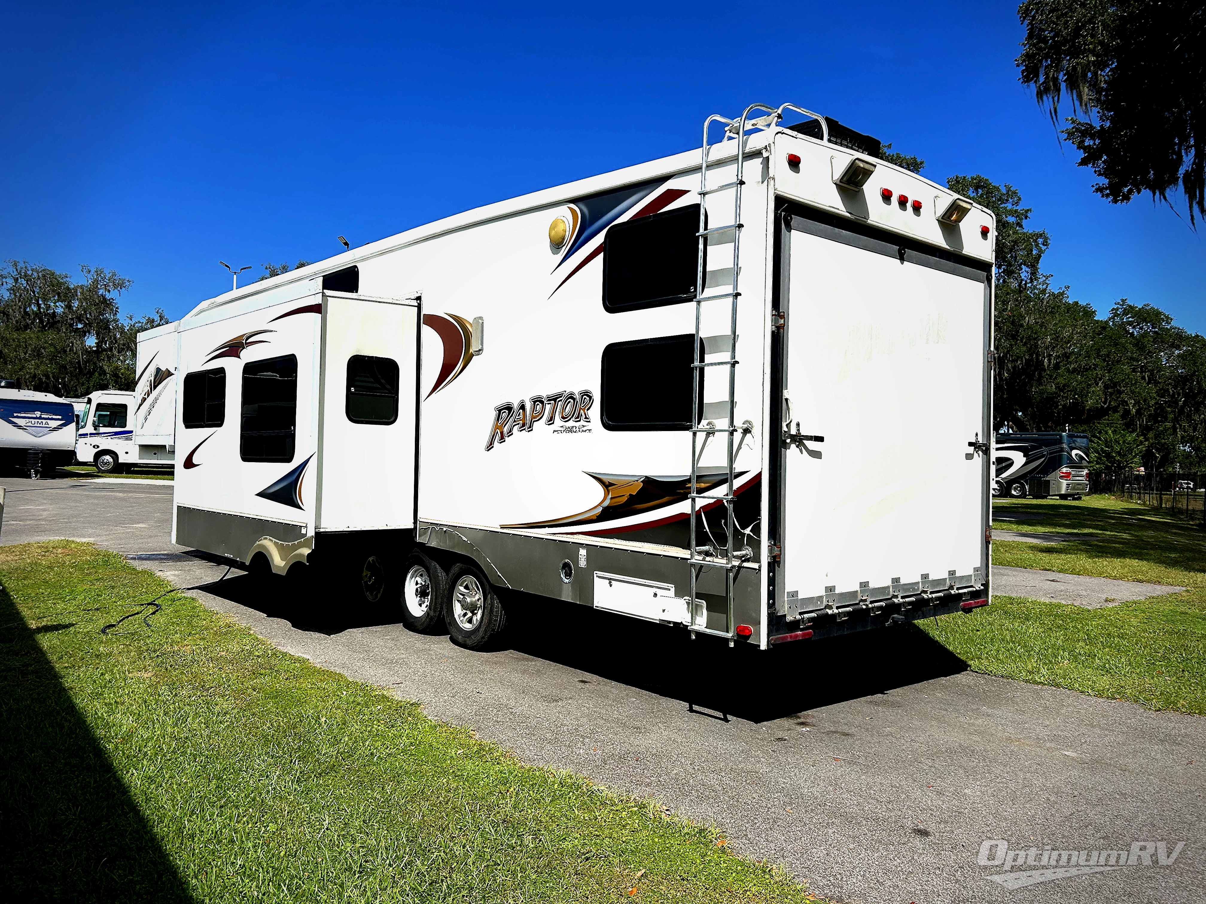 Double Slide Raptor FW Toy Hauler w/Rear Ramp Door to 12' Garage Cargo Space, Opt. Double Queen Electric Beds w/Sofa in Cargo Area, Loft w/Queen Bed, Side Entrance Door in Cargo Space, 2 Corner Garage Cabinets, Booth Dinette & Sofa w/Bed Slideout, Refrig. w/Oak Cab., Pantry, 3 Burner Range, Double Kitchen Sink, TV, Angle Shower w/Surround, Private Toilet Area, Vanity w/Dresser & Sink, Front Queen Bed Slide, Wardrobe, TV Stand & Much More!