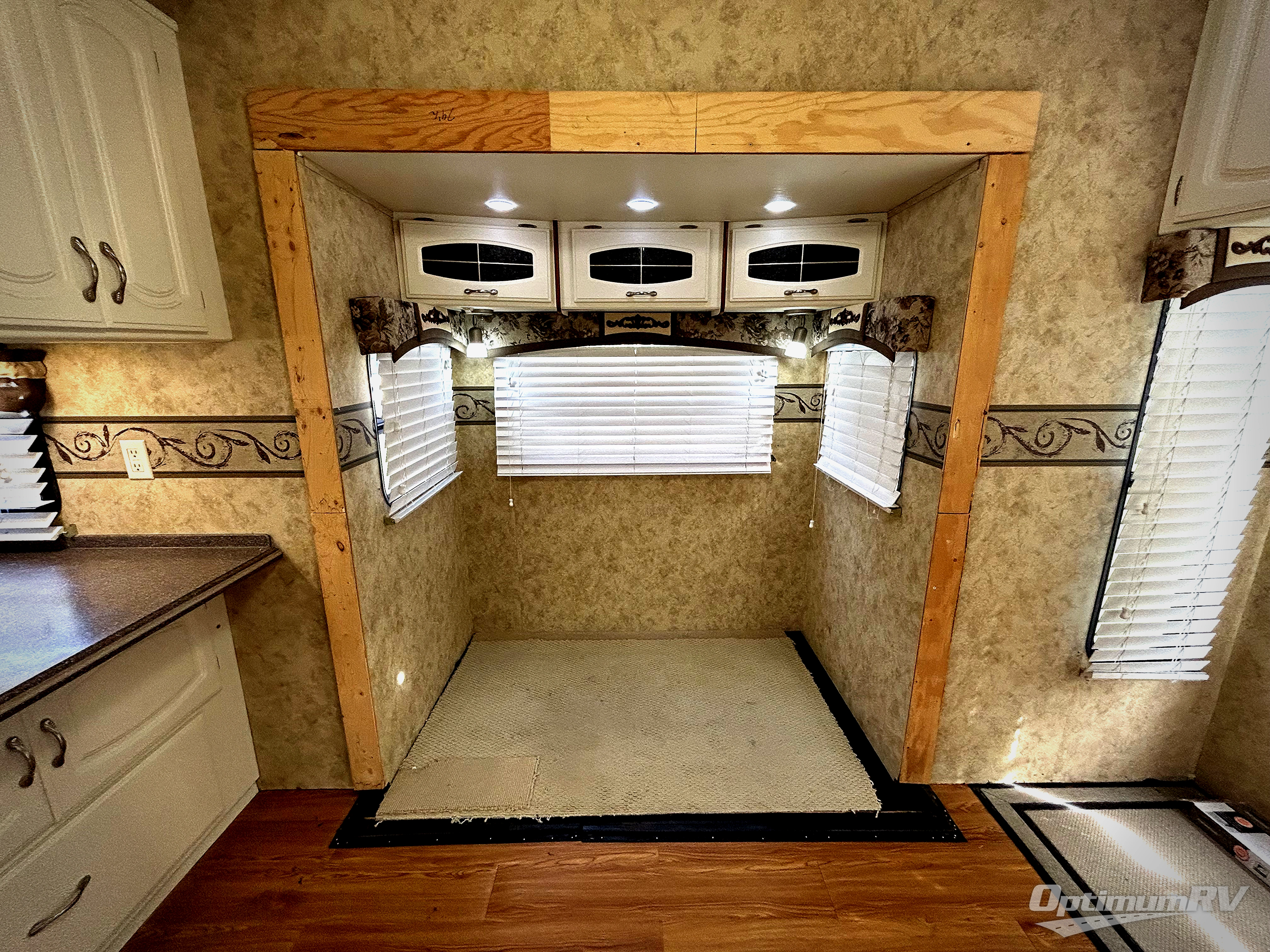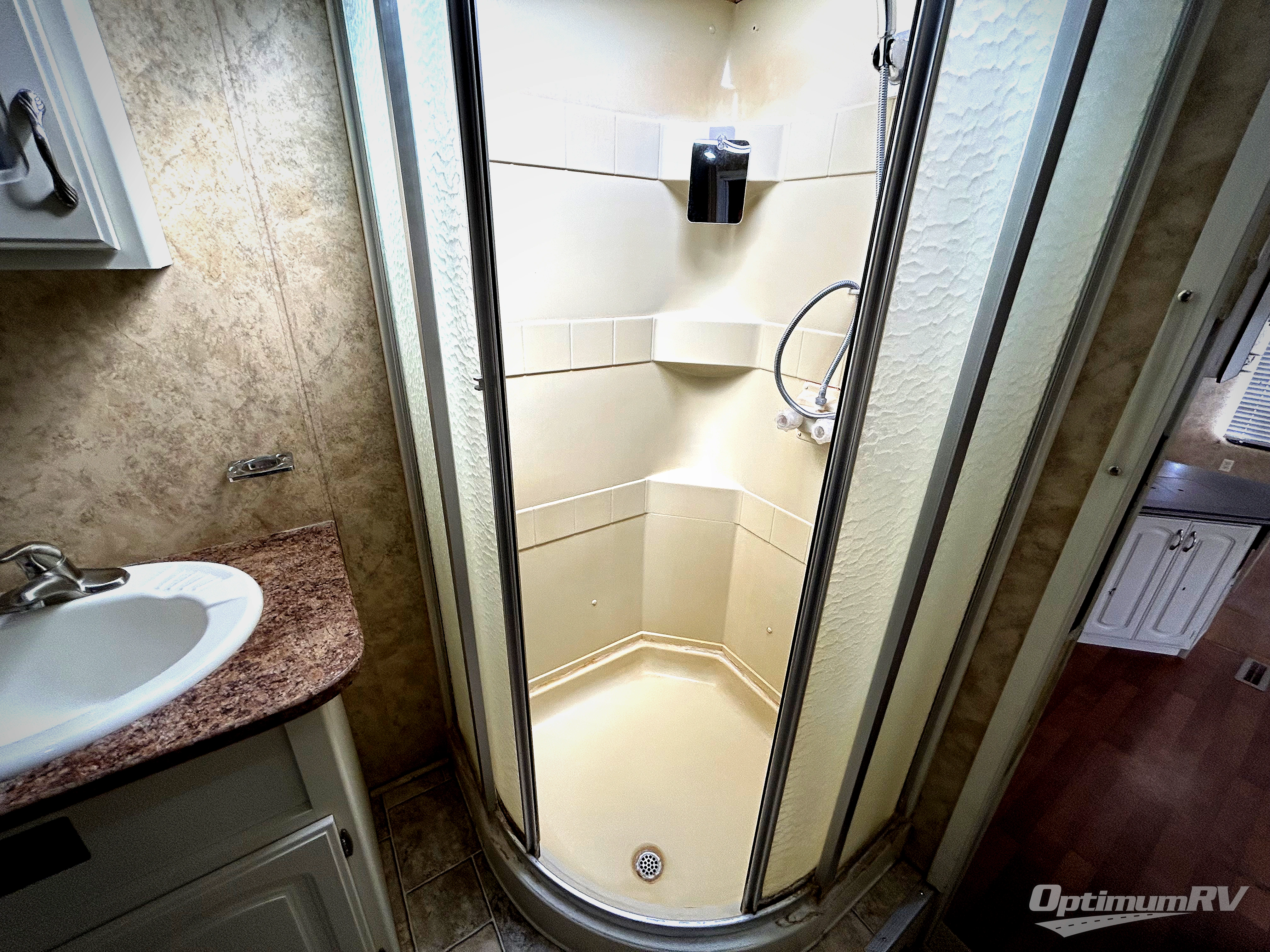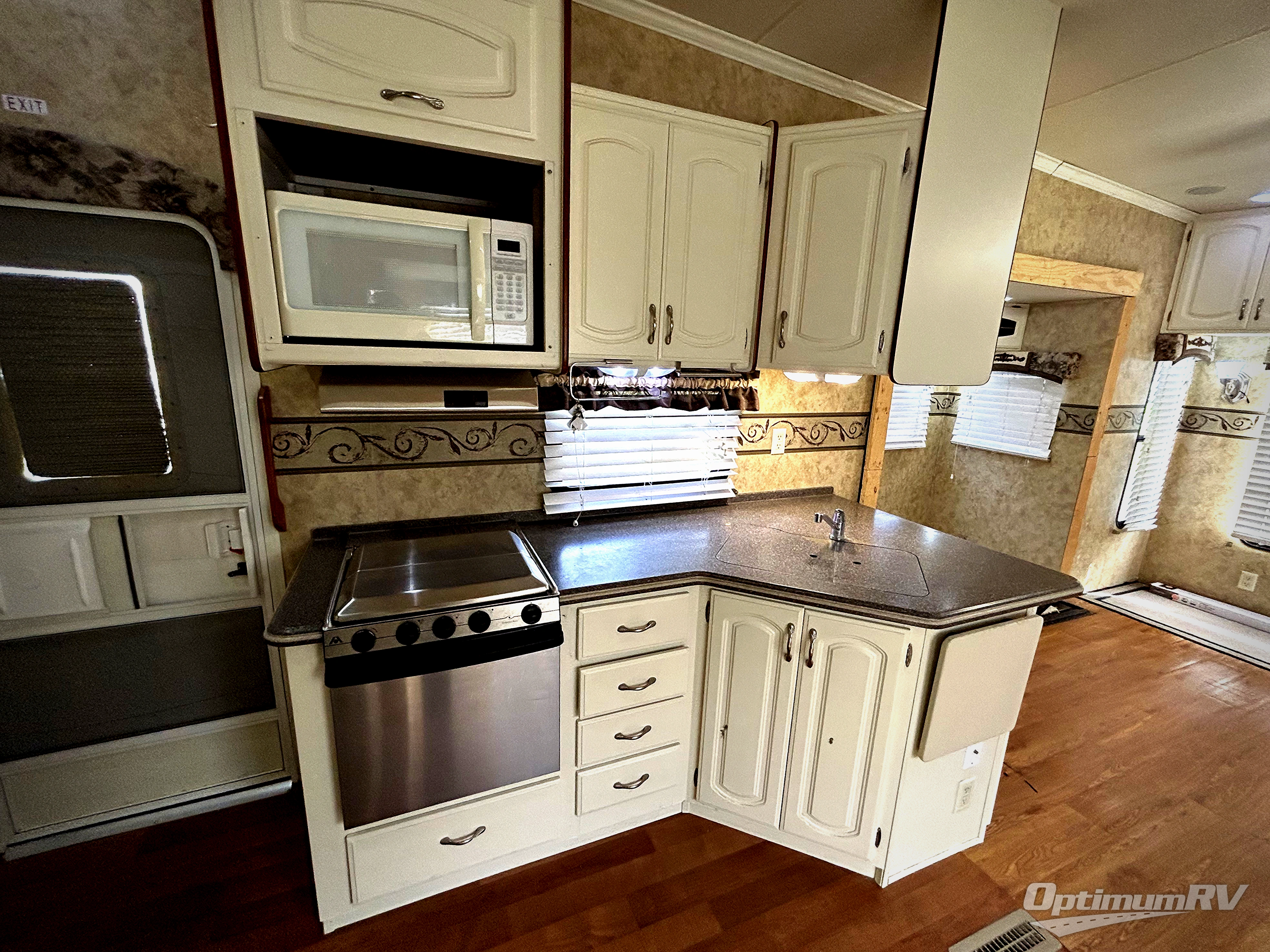 Triple Slide Fifth Wheel, Rear Living, Two Chairs, Slide Out Hide-A-Bed, Slide Out Ent Center/Desk/Booth Dinette, Double Kitchen Sink, 3 Burner Range, Refrigerator, Pantry, Closet, Shower, Private Toilet Area, Sink, Slide Out Queen Bed w/Storage Below, Chest, Closet, Cabinet, and More.