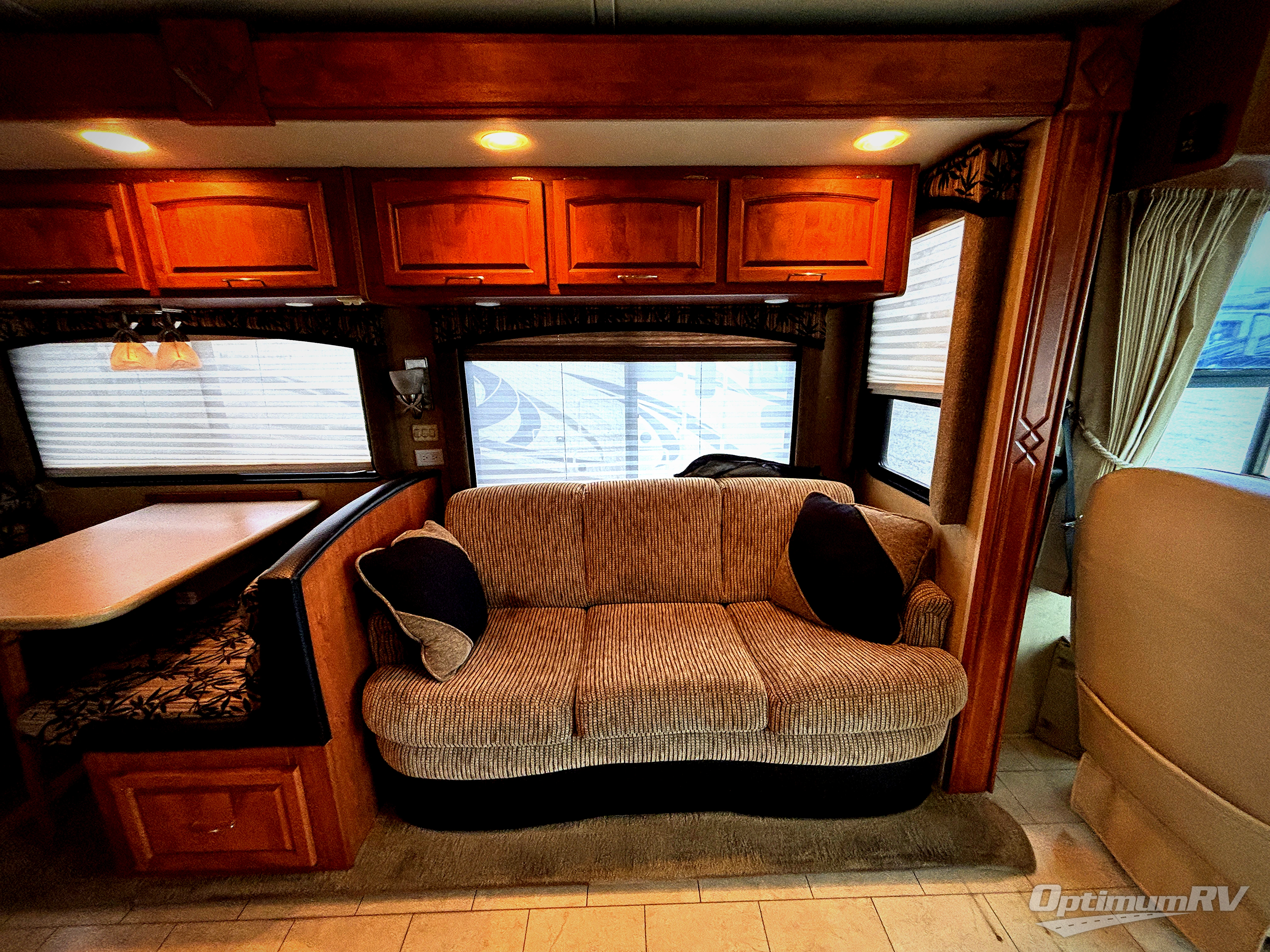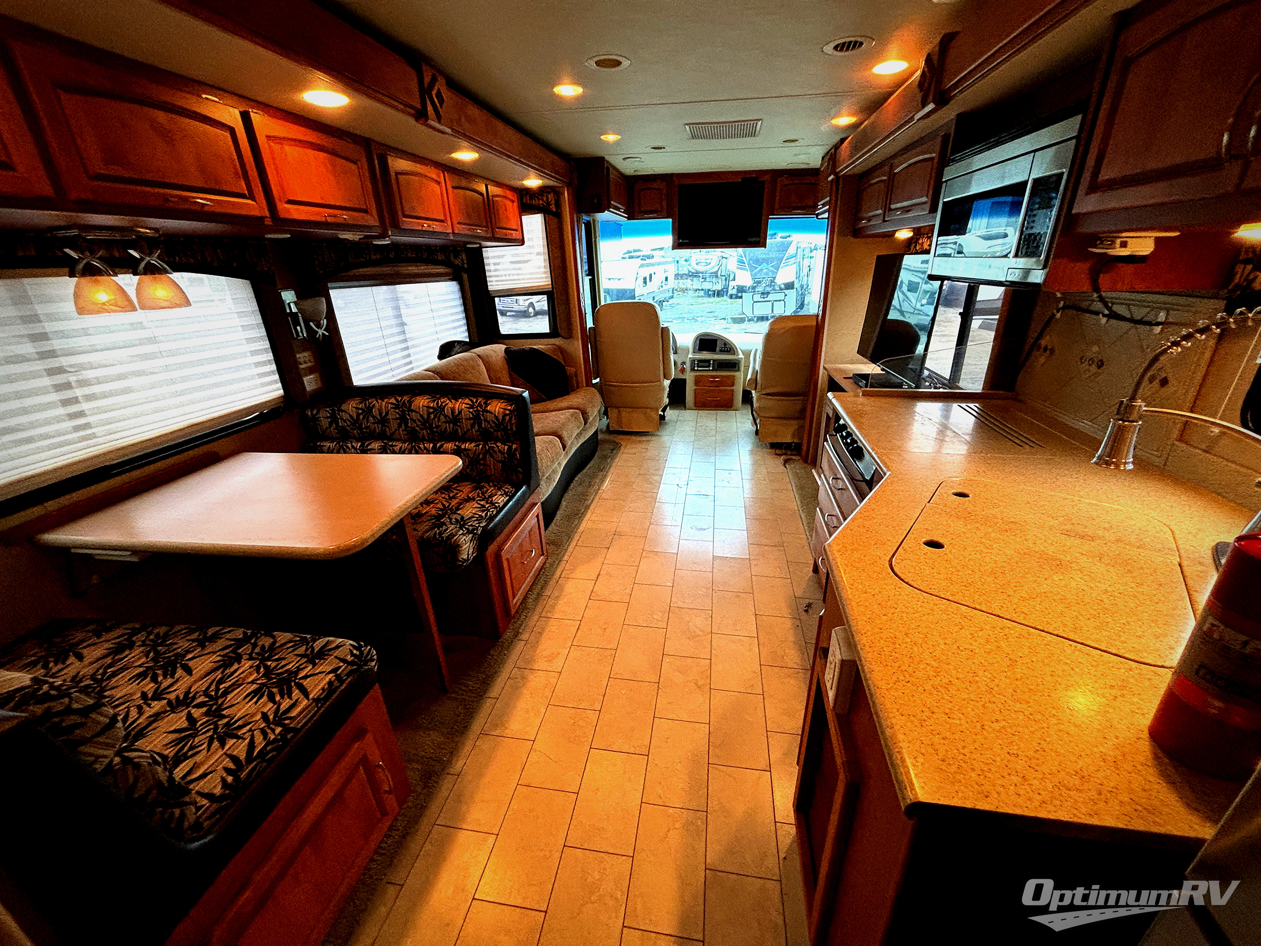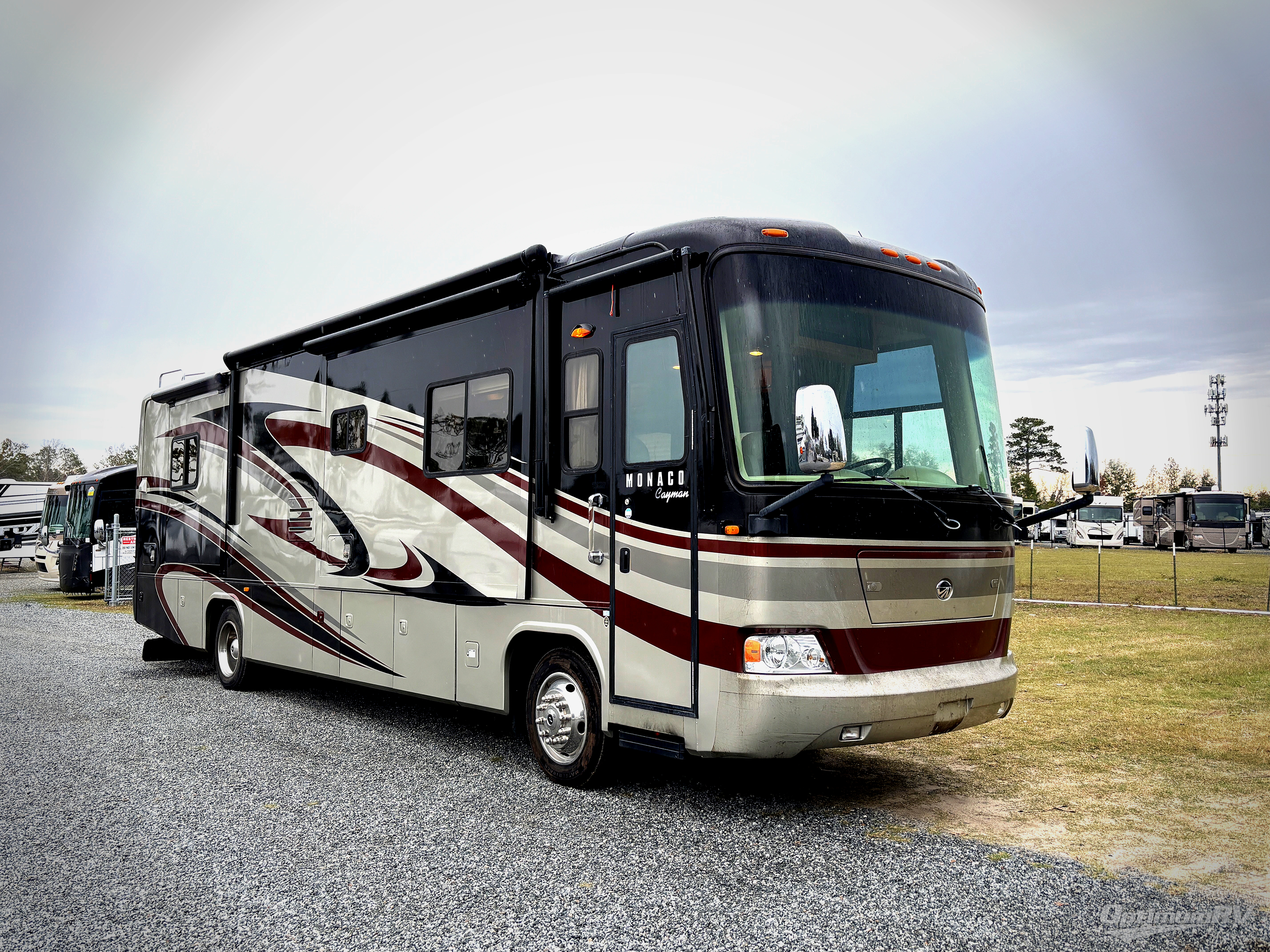 Quad Slide Cayman Class A Diesel by Monaco w/Rear Queen Bed Slide Including Nightstands, Wardrobe, Linen Closet w/Washer/Dryer Opt. Dresser w/Overhead Cabinet & TV Slide, Private Toilet Area w/Vanity & Sink, Shower, Pantry, Refrigerator, Booth Dinette & Sofa Slideout, TV Above Cab Area, 54" Sofa/3 Burner Range w/Microwave & Double Kitchen Sink Slide and More!