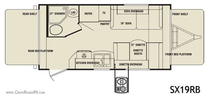 Sunset Trail Expandable Trailer, Rear & Front Expandable Beds, Rear Shelf, Corner Shower, Lav., Toilet, Refrig., TV, Pantry, 3 Burner Range, Dbl. Kitchen Sink, Overhead Cab., Sofa w/Overhead Cab., Booth Dinette, Overhead Cab., Front Shelf, Opt. Ext. Cooktop & More.