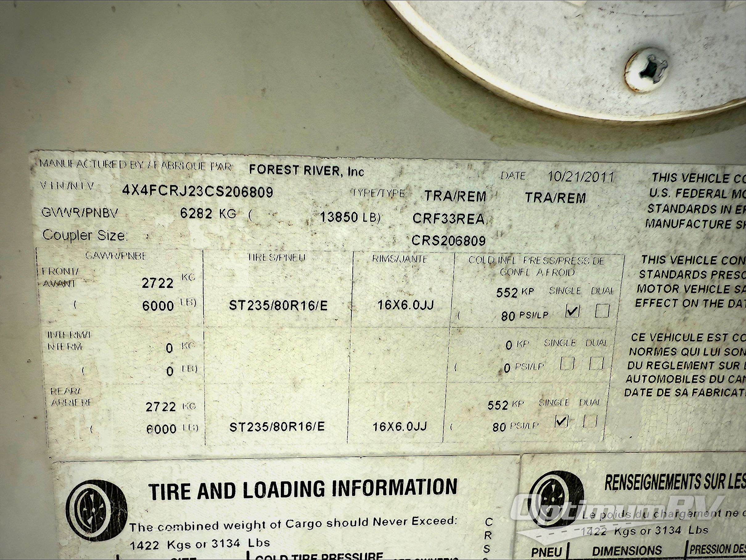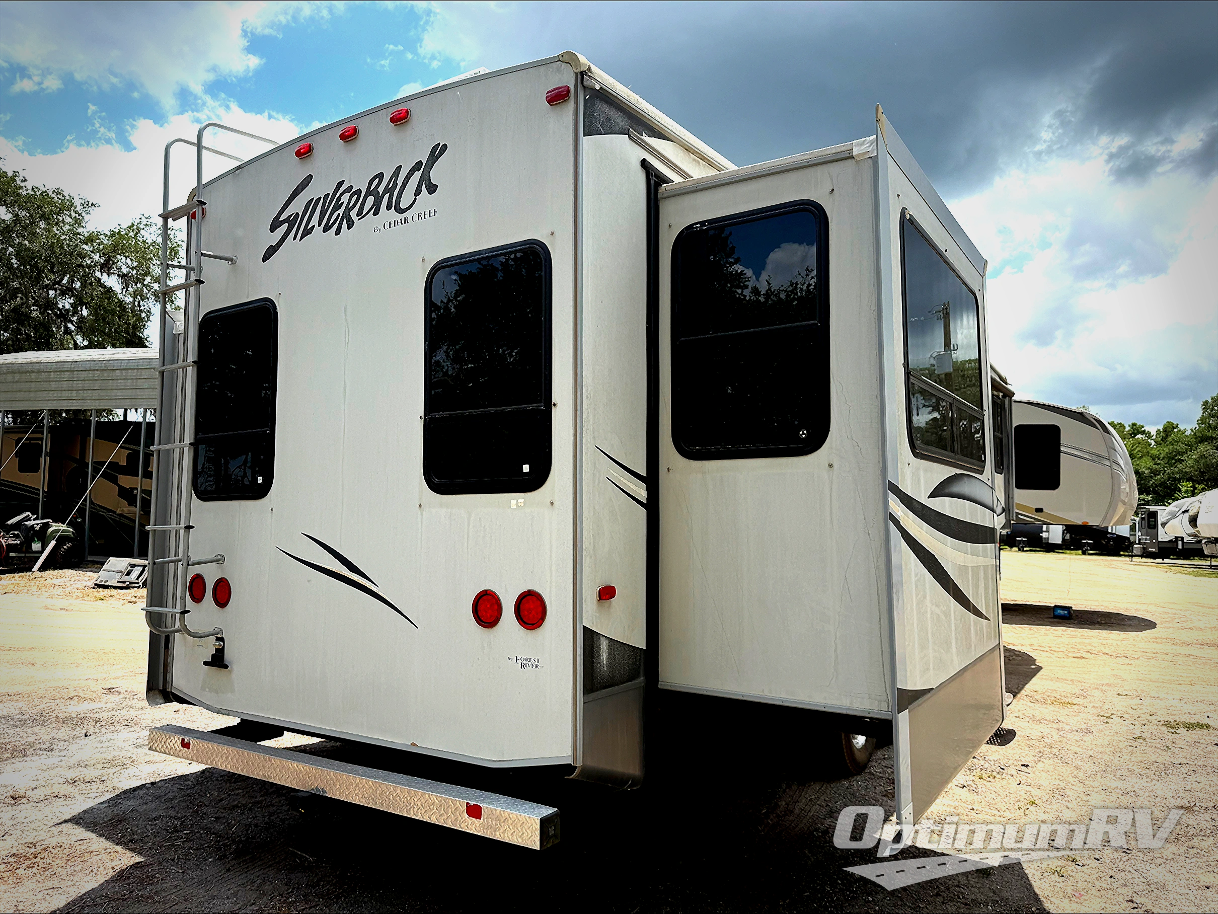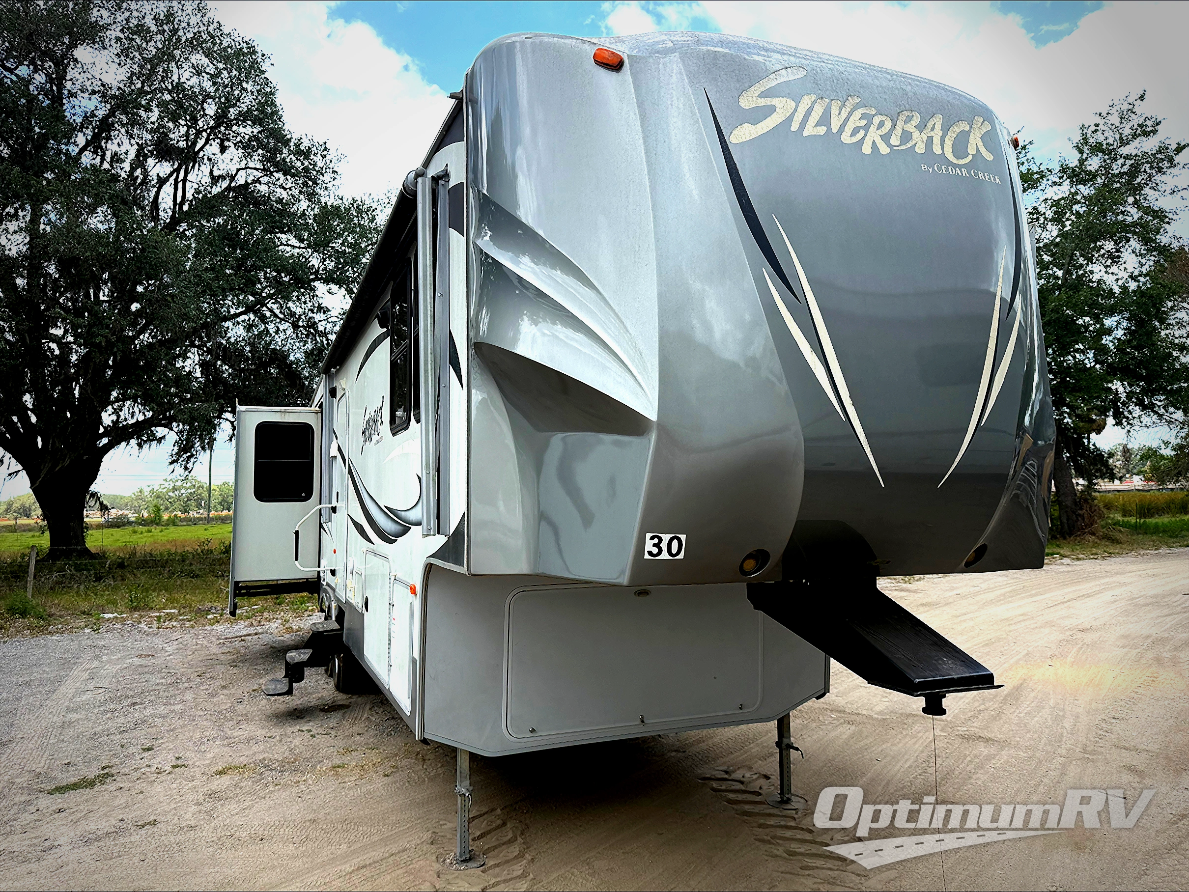 Triple Slide Cedar Creek Silverback Fifth Wheel, Rear Lounge Chairs w/Overhead Cab. & Table, Desk/Fireplace/TV & Overhead Cab. Slide, Sofa & Free Standing Dinette Slide w/Overhead Cab., 3 Burner Range, Micro., Dbl. Kitchen Sink, Counter w/Bar Stools, Refrig., Pantry, Closet, Step Up Bath/Bedroom, Front Queen Bed, Dbl. Shelves, Dresser w/TV Above, Wall Wardrobe & Much More. Available Options May Include: King Bed.