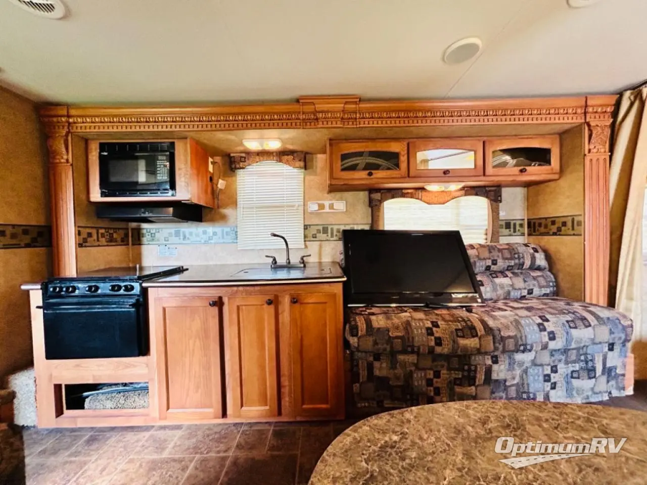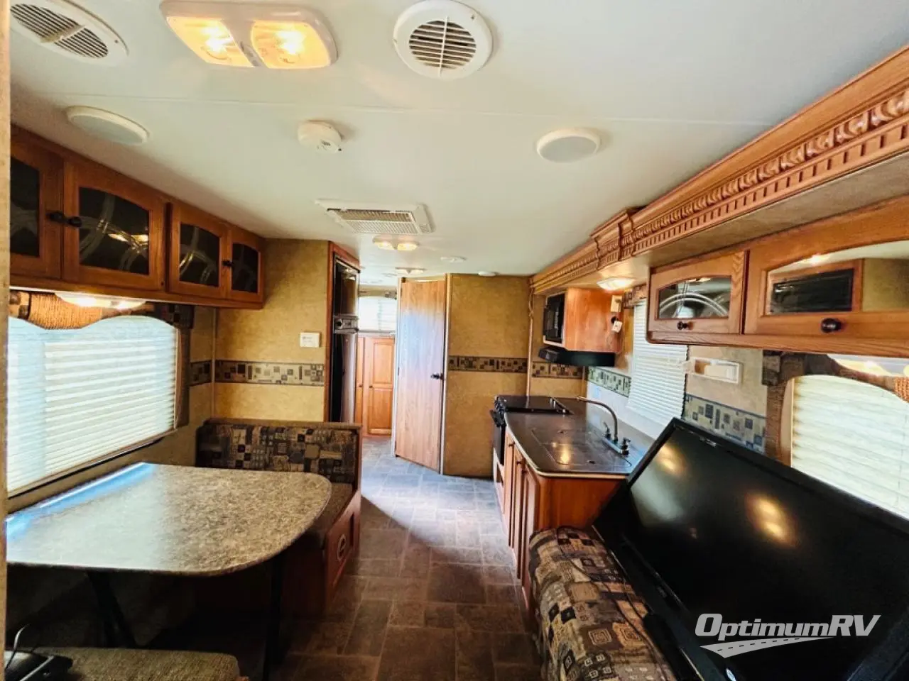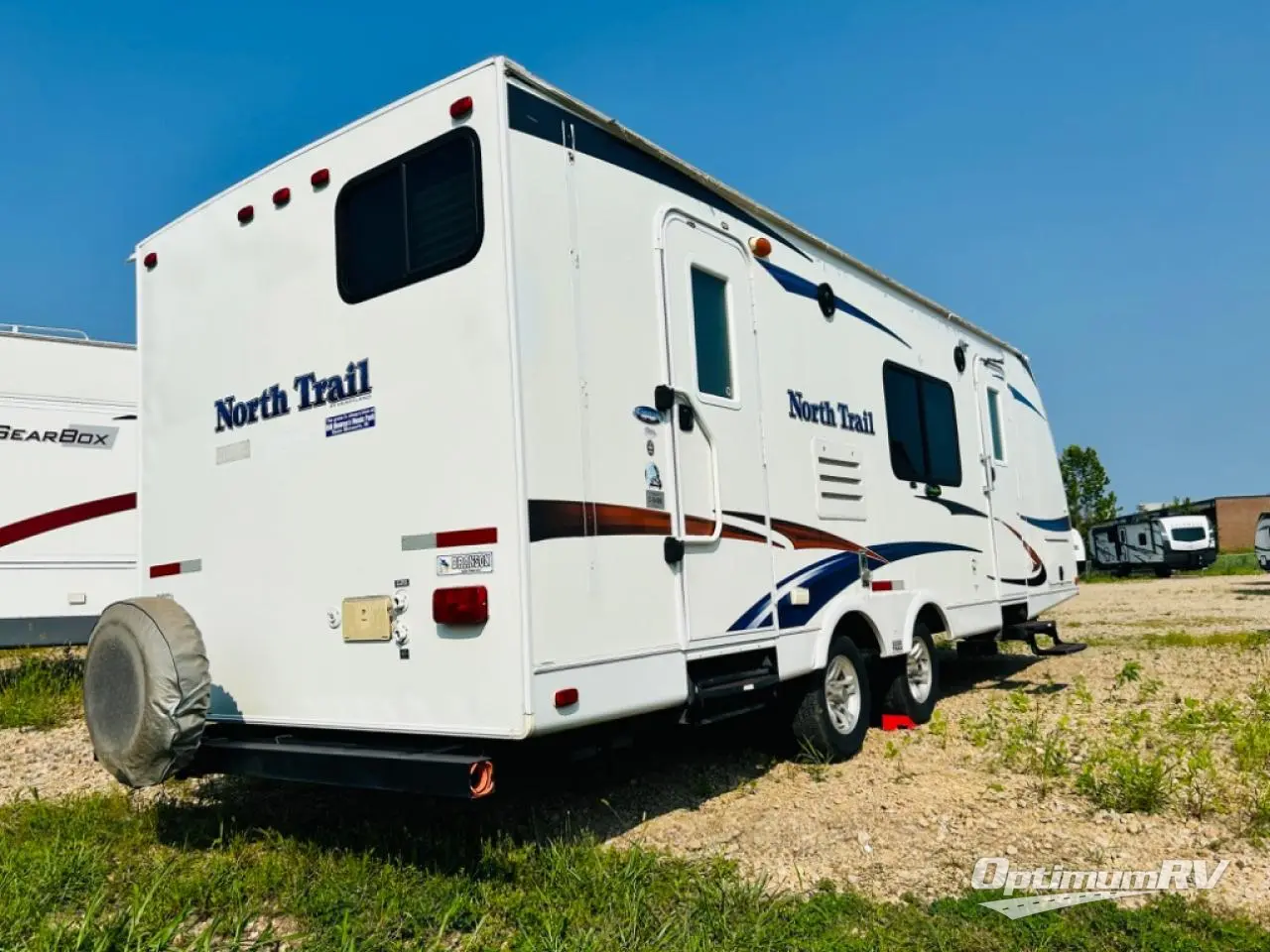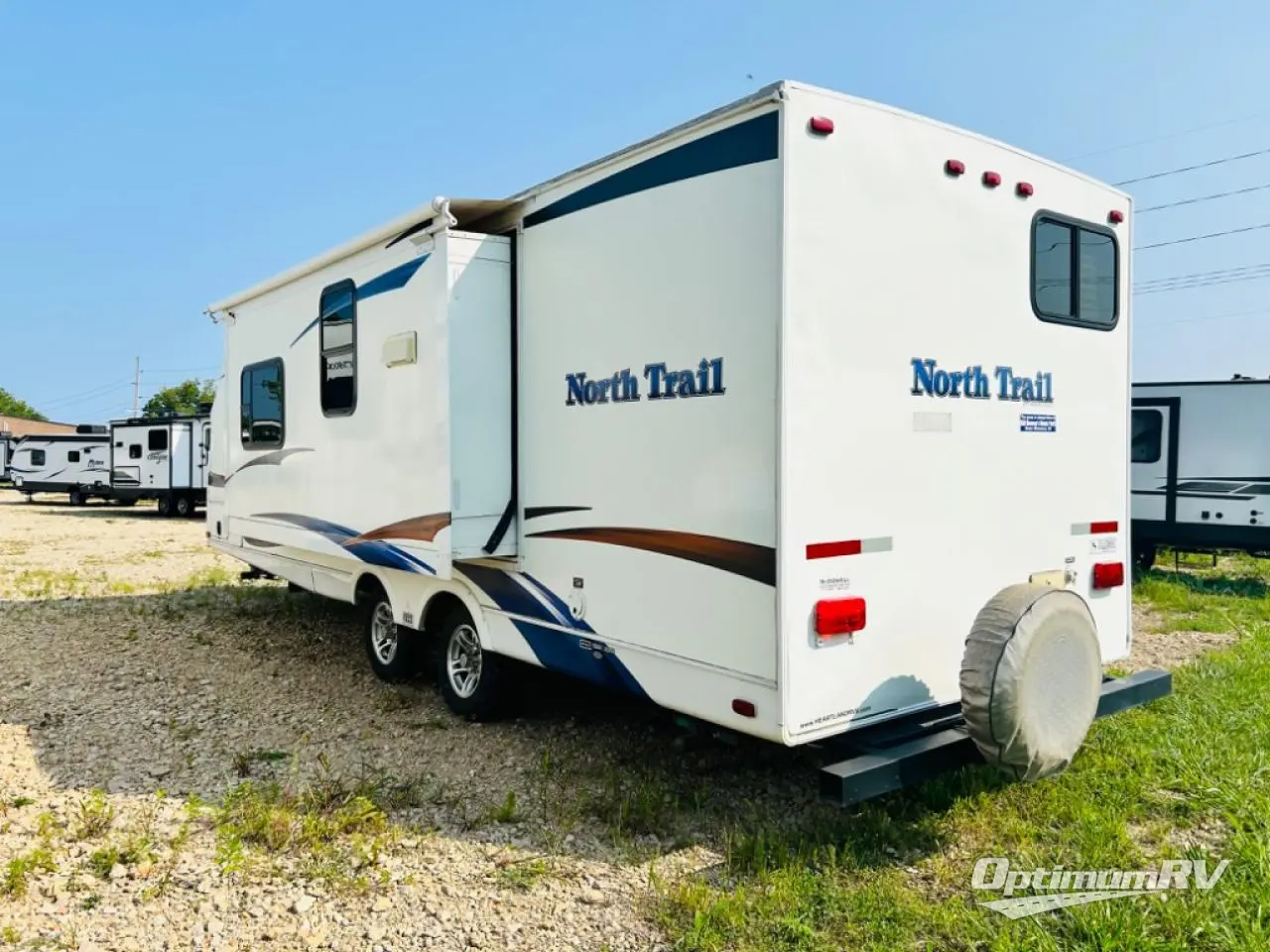 Heartland North Trail Travel Trailer w/Rear Corner Bath Including Angle Shower, Toilet & Sink w/Overhead, Wardrobe, Pantry, Refrigerator, Booth Dinette, Slideout 3 Burner Range/Dbl. Kitchen Sink & Sofa w/Overhead Above Sofa and Stove, Front Queen Bed w/Nightstands Below Shirt Wardrobes, Private Bedroom Entry and Much More!