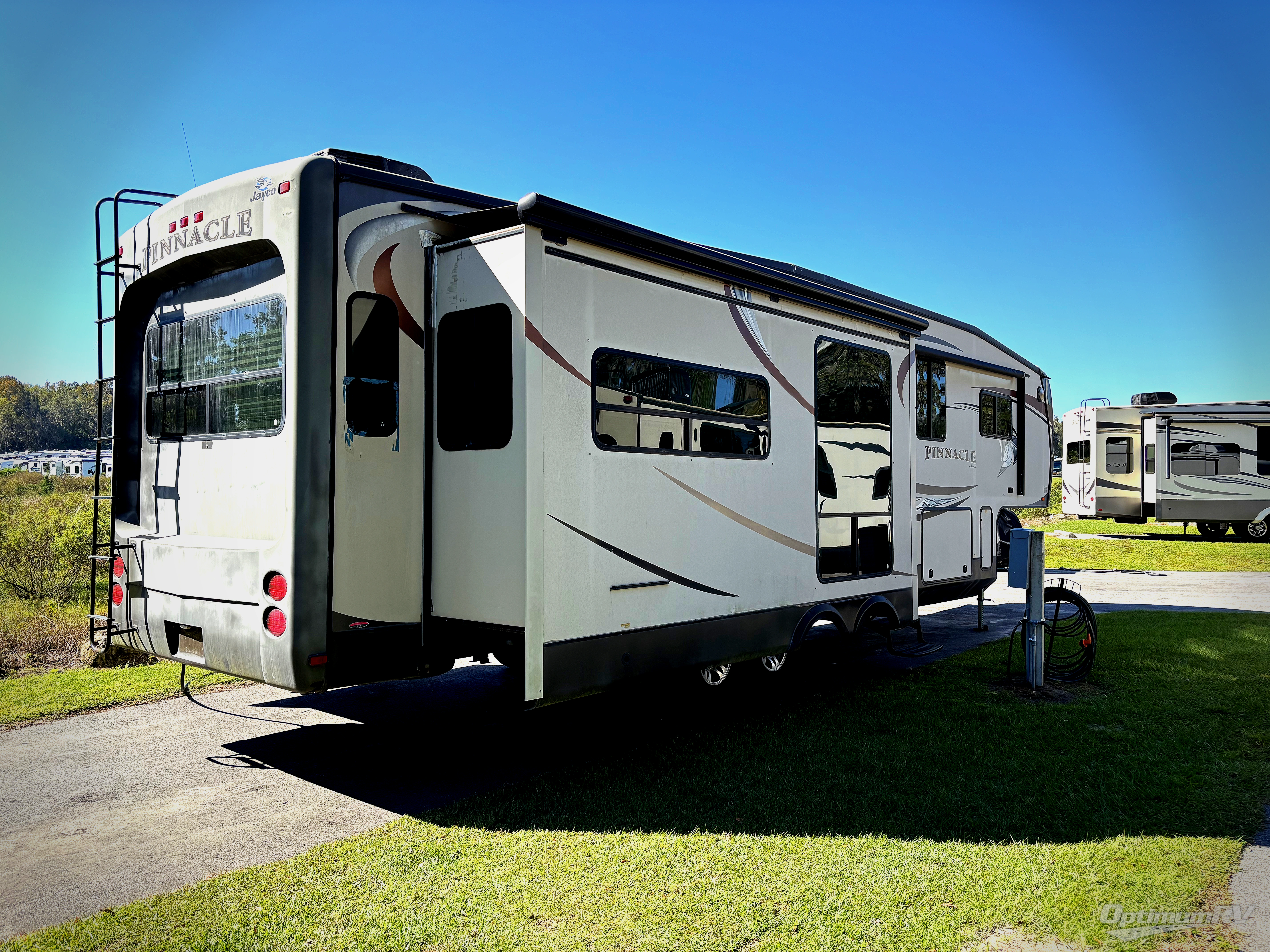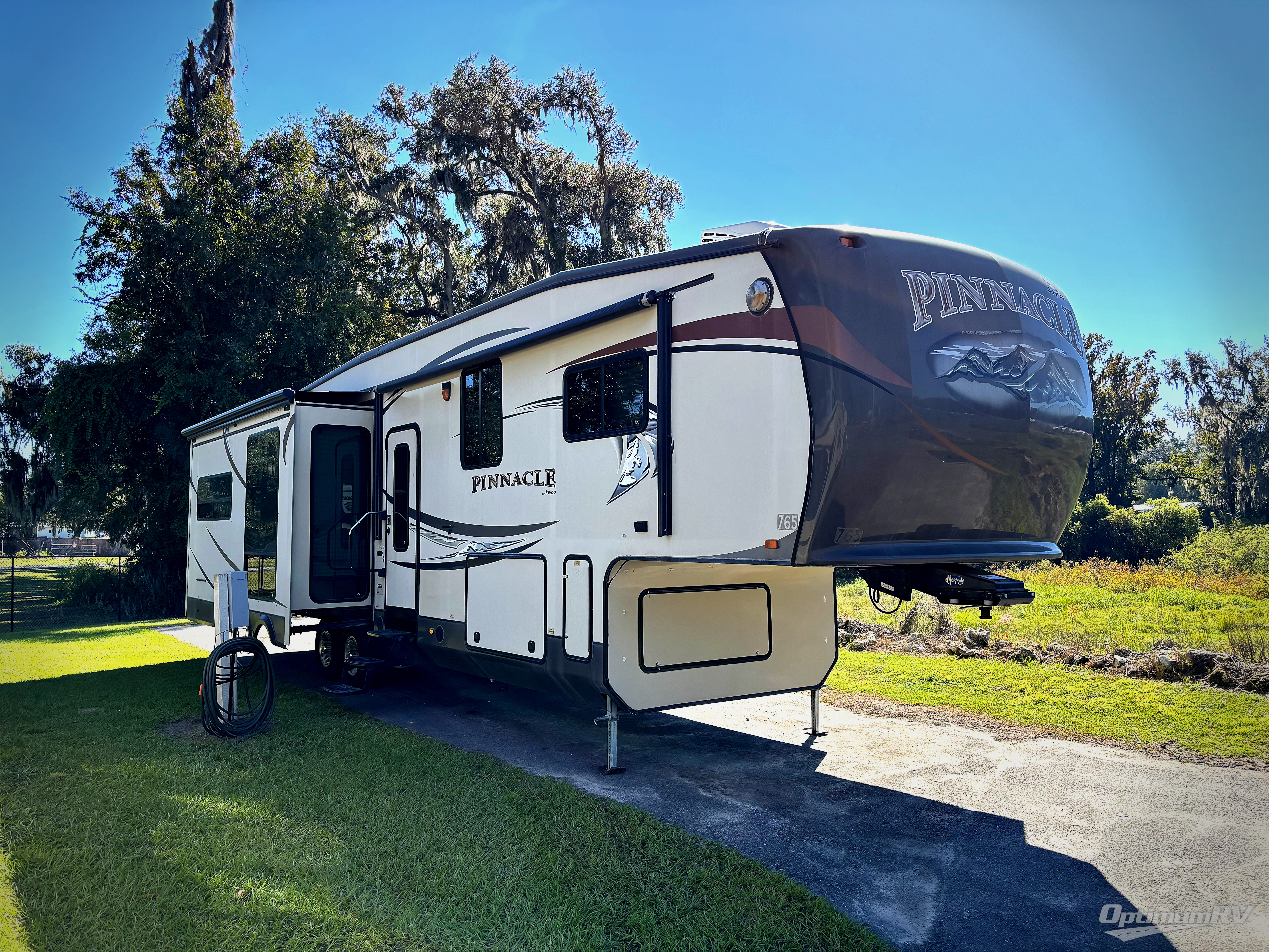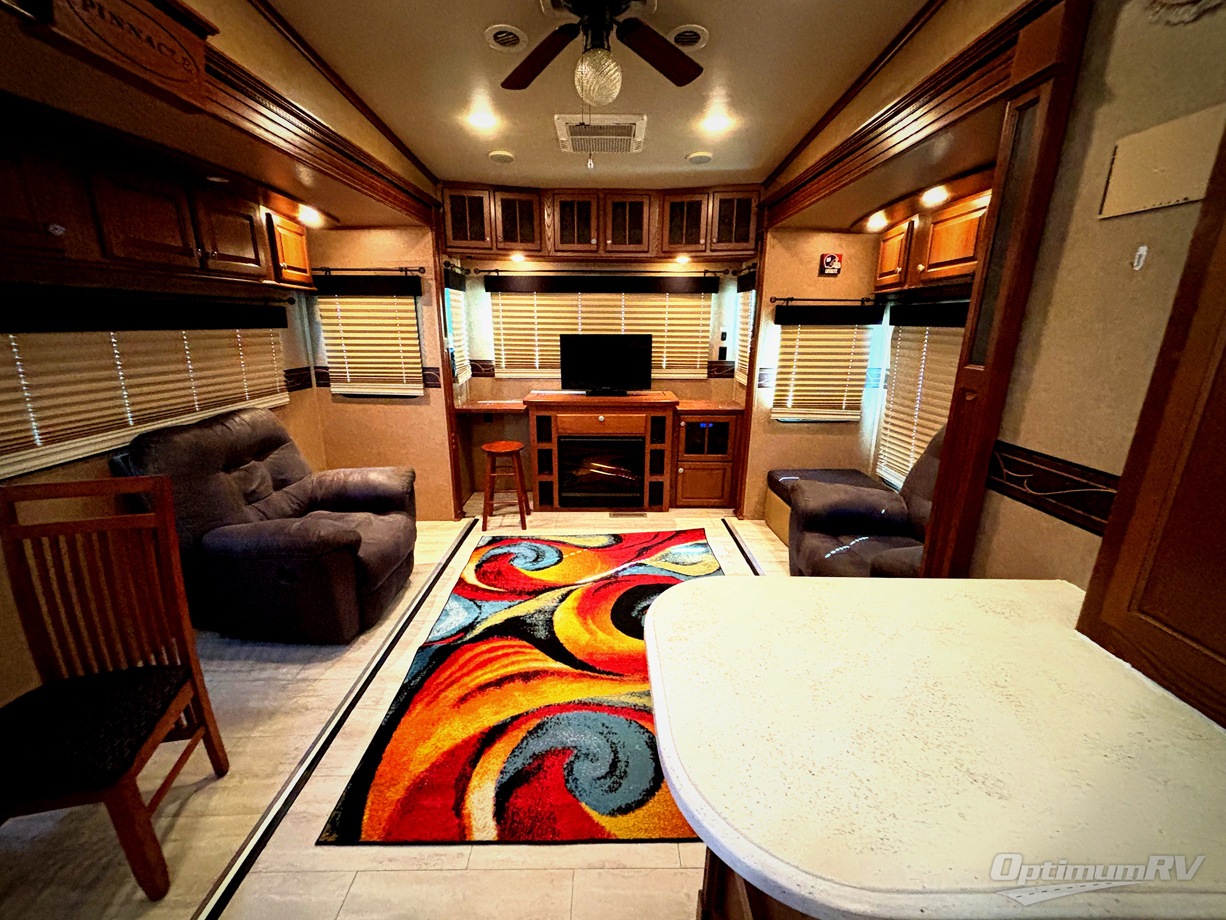 Quad Slide Pinnacle Fifth Wheel, Rear Entertainment Center, 2-Lounge Chairs w/End Table, Hide-A-Bed Sofa/Free Standing Table & Chairs Slideout, Counter w/Bar Stools, Refrigerator/Pantry/3-Burner Range/Microwave Slideout, Double Kitchen Sink, Step Up To Bed/Bath, Corner Shower, Lav., Med. Cab., Toilet, Linen, King Bed w/Shelves Slideout, Chest, Storage, Washer/Dryer Prep, Overhead Cabinets Throughout, 16' Awning & Much More. Available Options May Include: Fireplace, 12 cu. ft. Refrig.