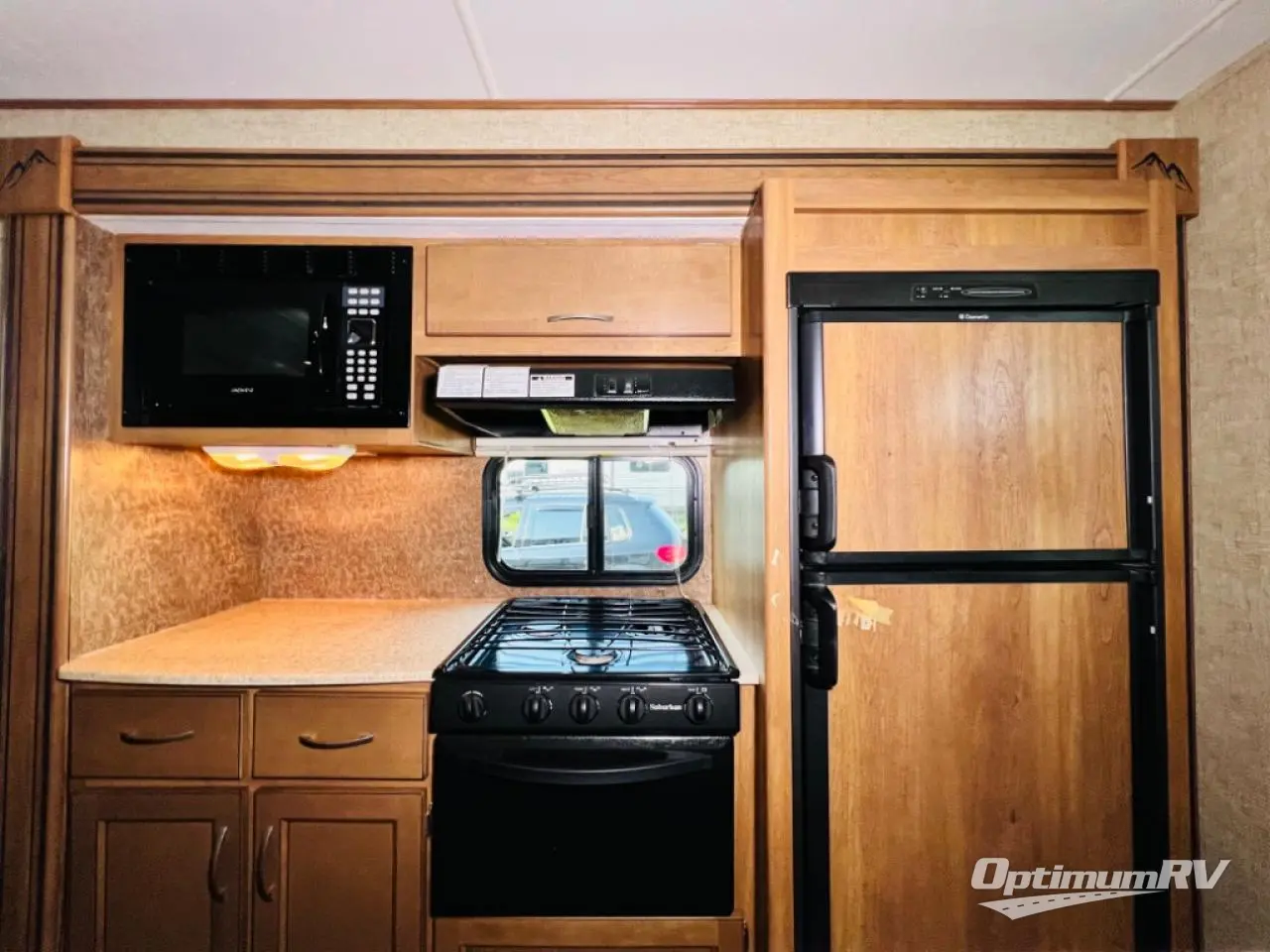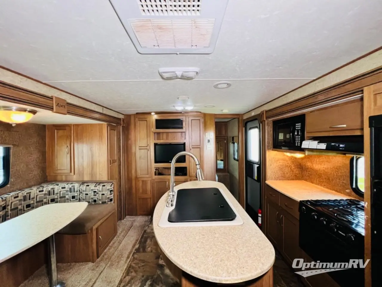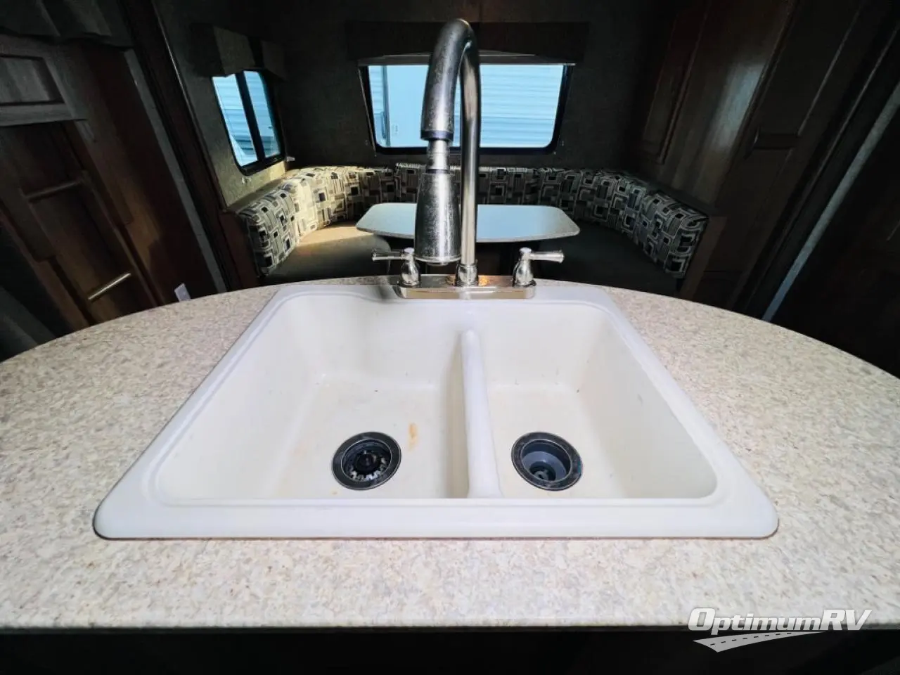On the opposite side of the trailer there is a second slide featuring a three burner range, microwave, and refrigerator. The kitchen island provides added counter space and a double kitchen sink making cleanup a cinch.