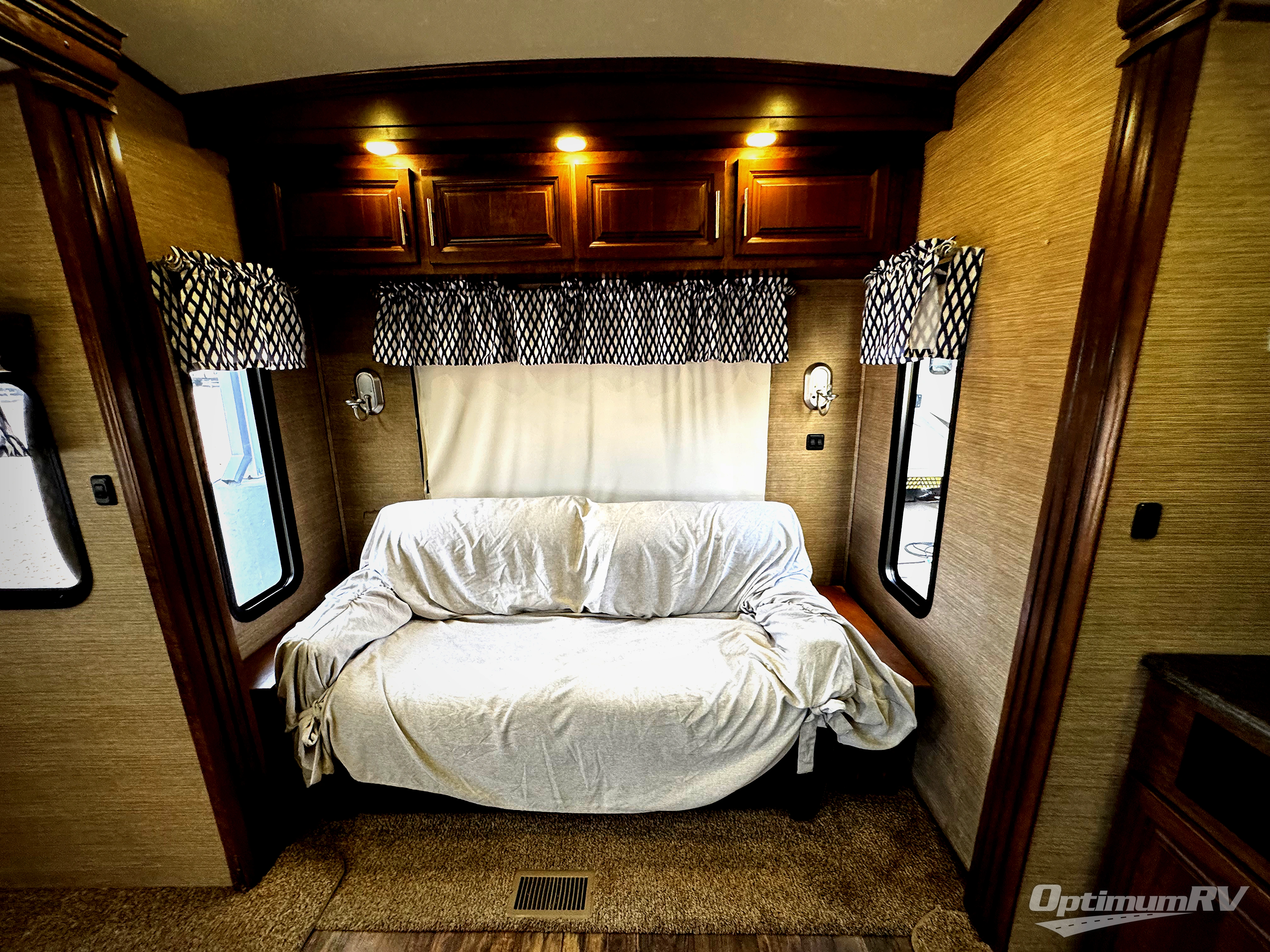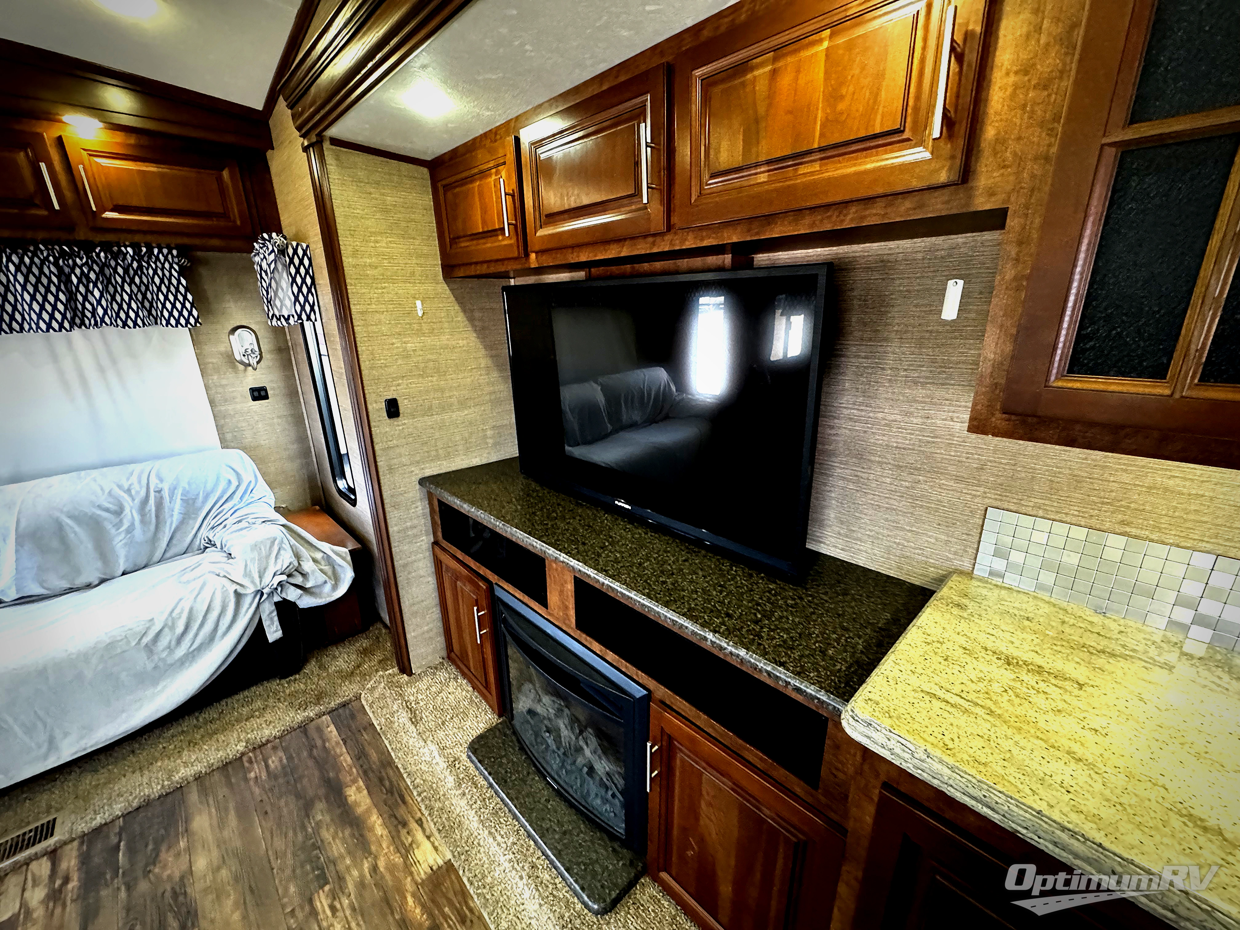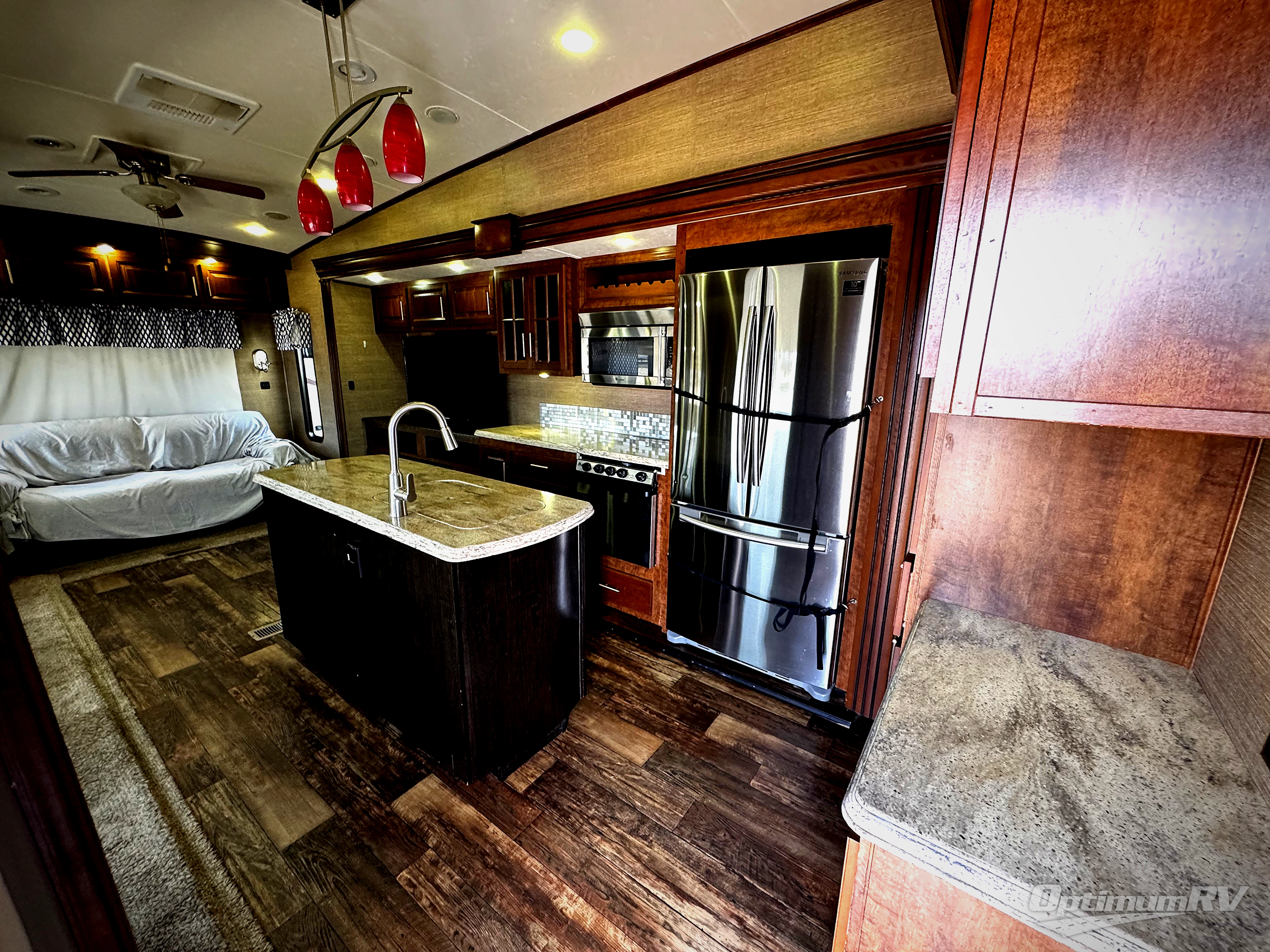 In the very rear of the unit there is a sofa with end tables and overhead storage the entire width of the fifth wheel. There is an entertainment center in the slide opposite the door side slide and also features the kitchen amenities as well. You will find a pantry, refrigerator, 3 burner range with overhead microwave, plus counter space with storage above it.