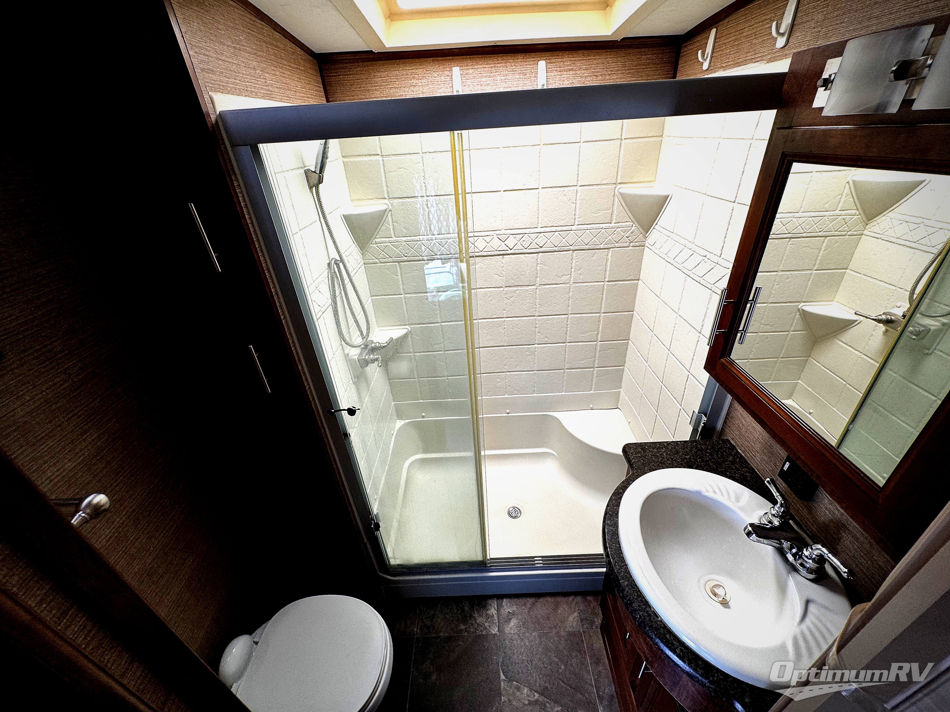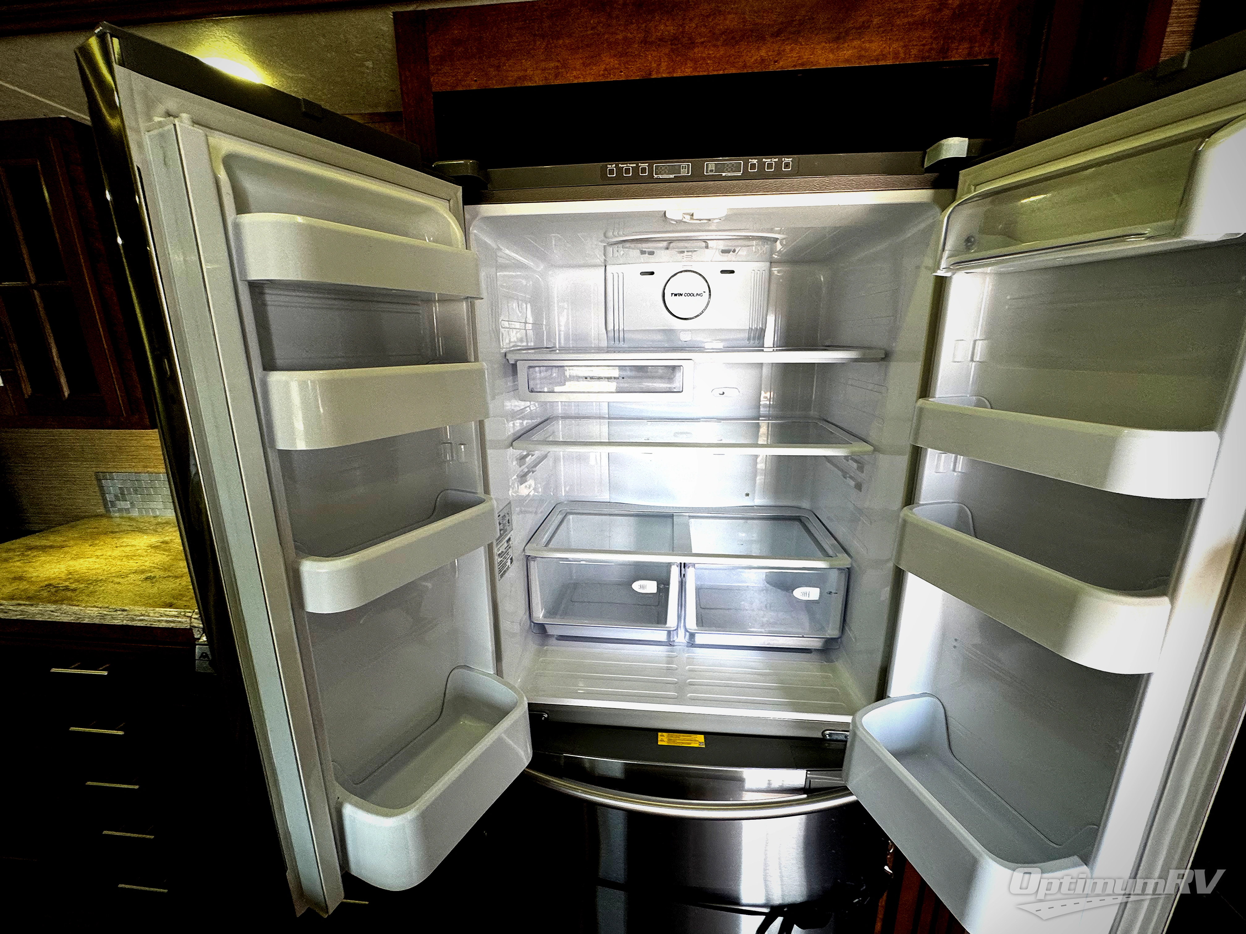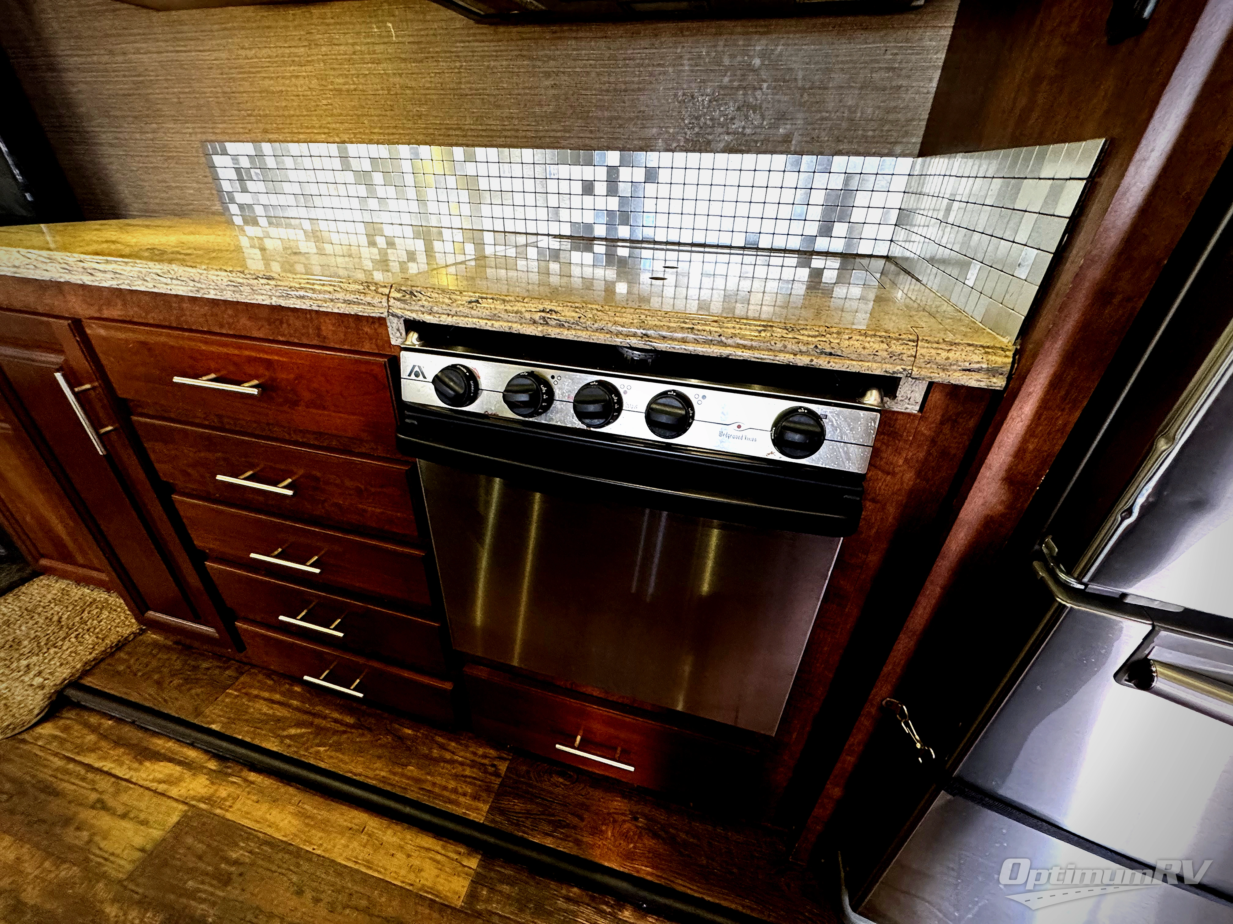 In the very rear of the unit there is a sofa with end tables and overhead storage the entire width of the fifth wheel. There is an entertainment center in the slide opposite the door side slide and also features the kitchen amenities as well. You will find a pantry, refrigerator, 3 burner range with overhead microwave, plus counter space with storage above it.