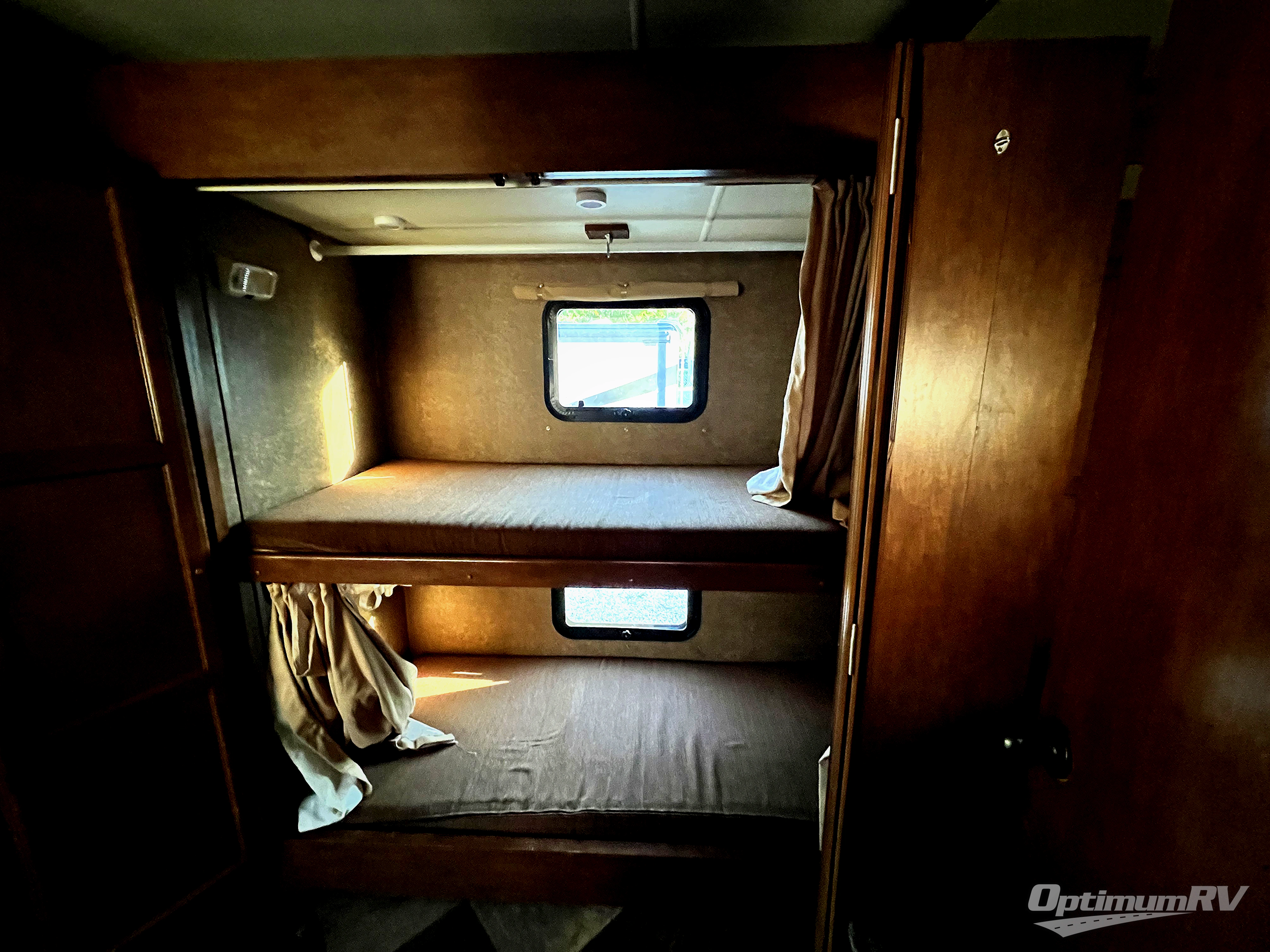A half bath featuring a toilet, sink, and linen cabinet are just off the living area across from a set of bunk beds in the hall. The bunks along with the master bedroom wardrobe slide out provide a bit more interior space. You can also add 13" TV w/DVD player for each of the bunks if you like.