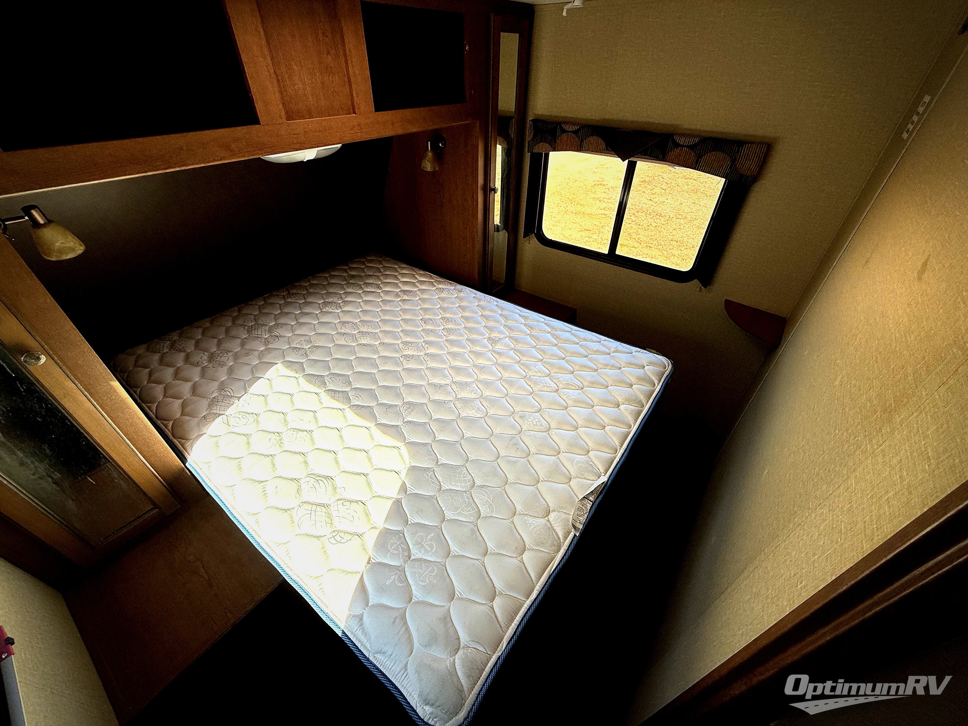 The front private bedroom includes a lift-up queen bed, a wardrobe at each side and overhead cabinets.
