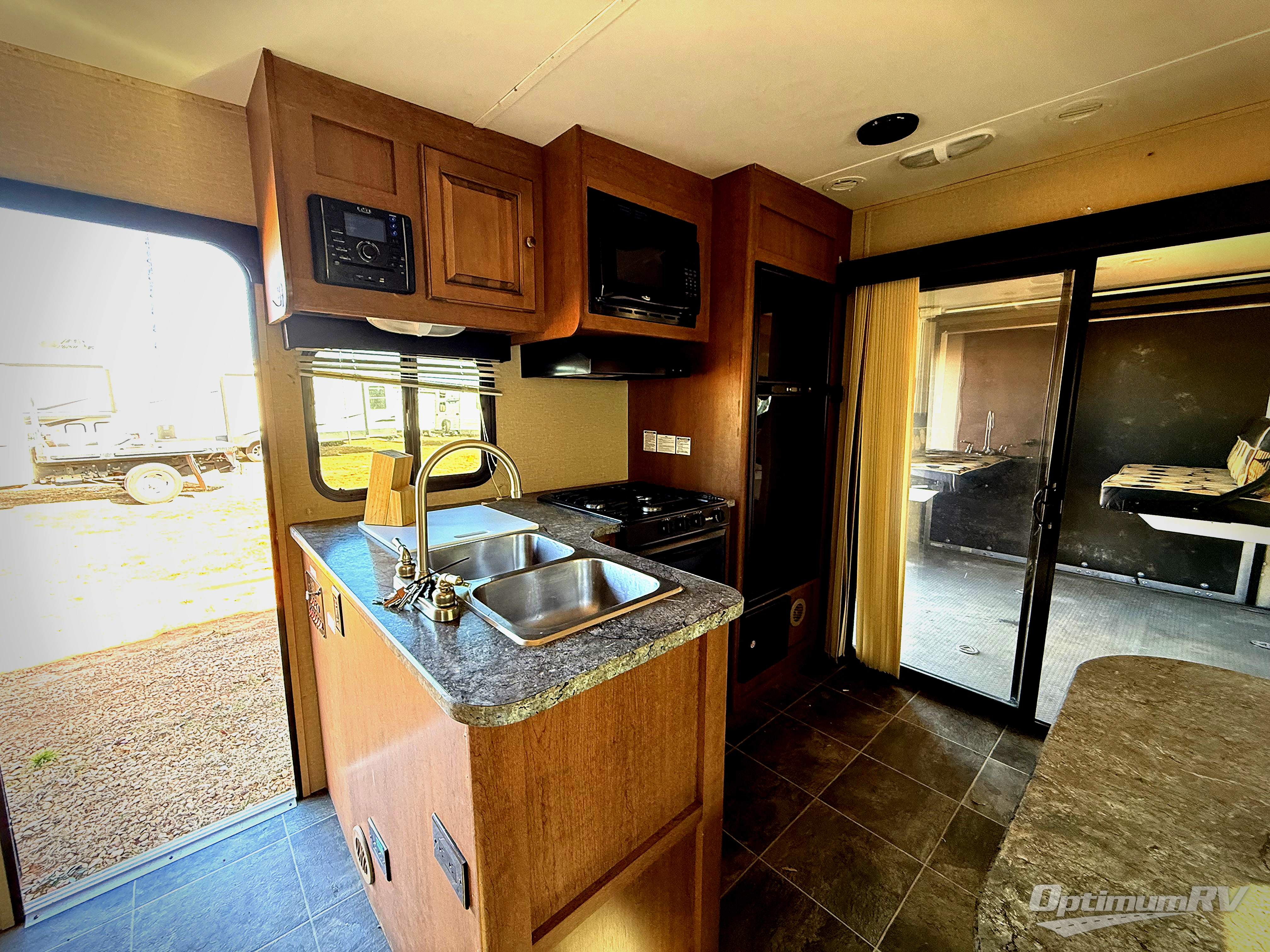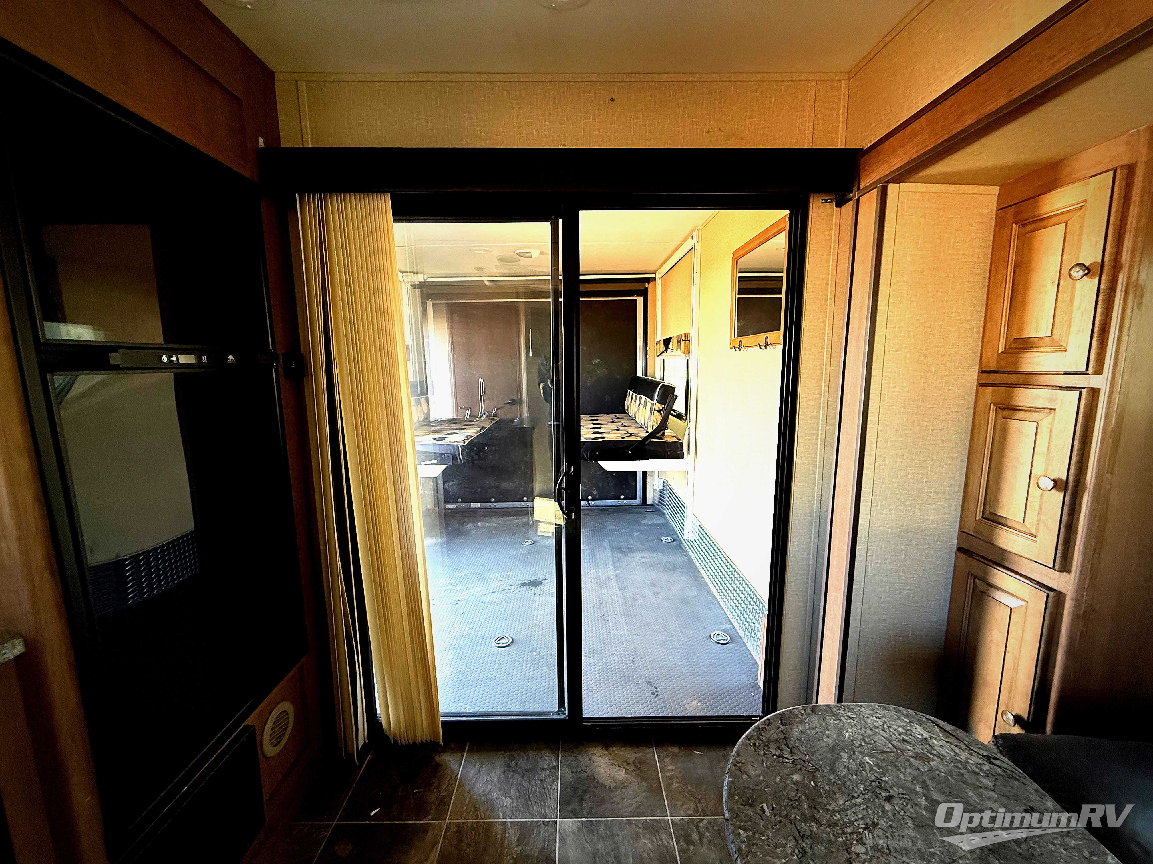 Moving into the living area through sliding patio doors, the road side holds a slide out with a reclining sofa and a pantry. There is a table in front of the sofa.