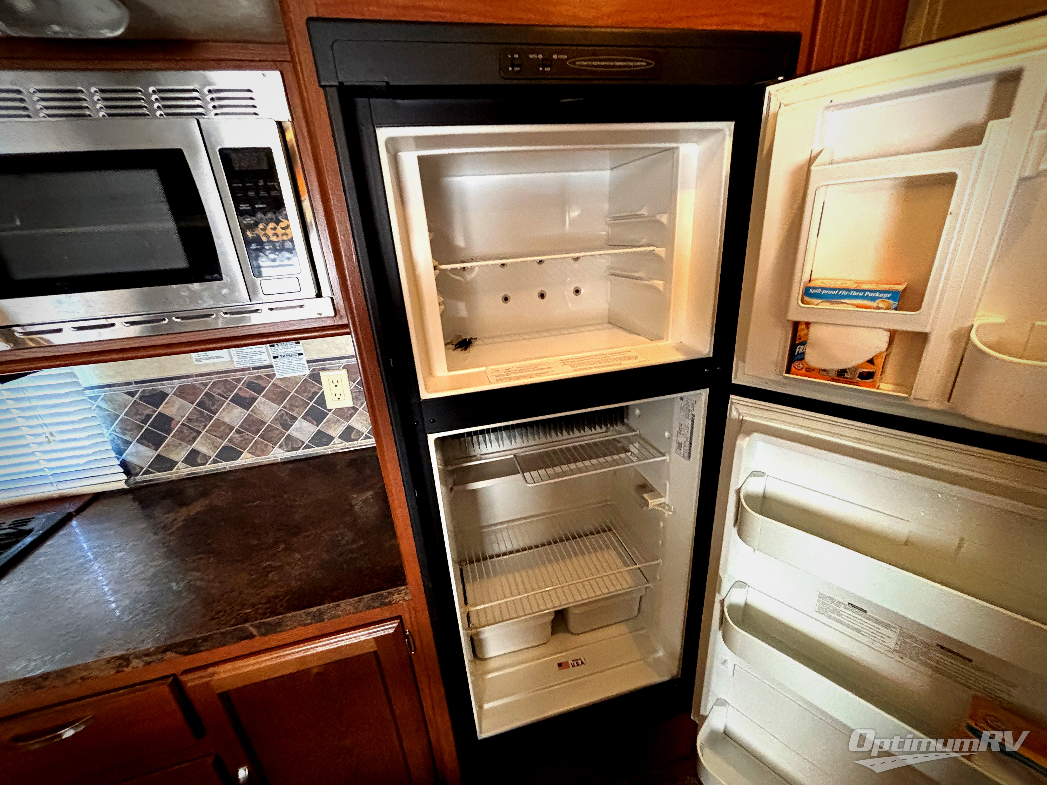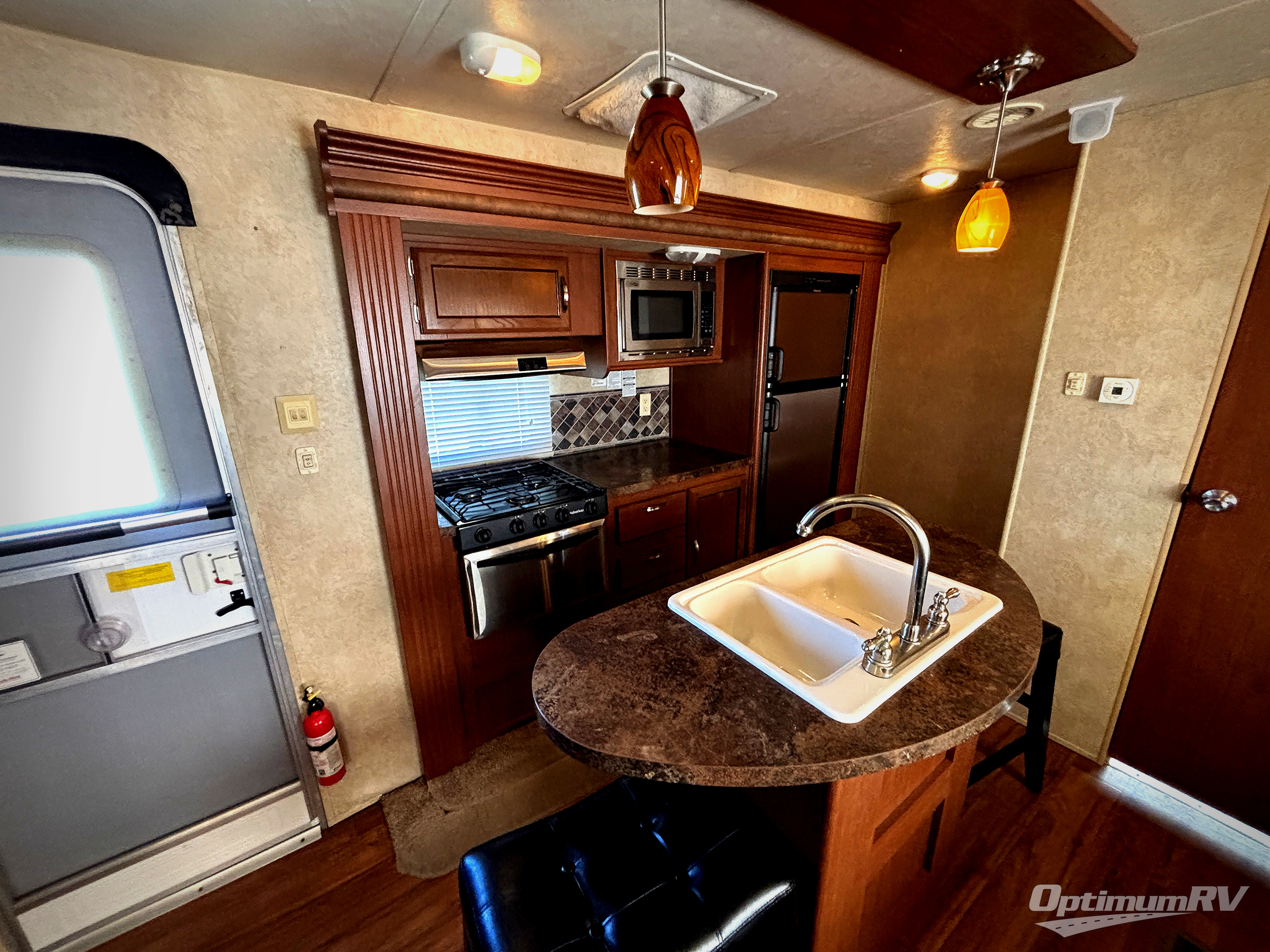 To the left of the entrance there is a slide with a three burner range, microwave, and refrigerator. The kitchen island has a double kitchen sink as well as extra counter space. On the opposite side of the trailer you will find a slide with a dinette and a sofa. To the right of the entrance there is a large pantry and an entertainment center.