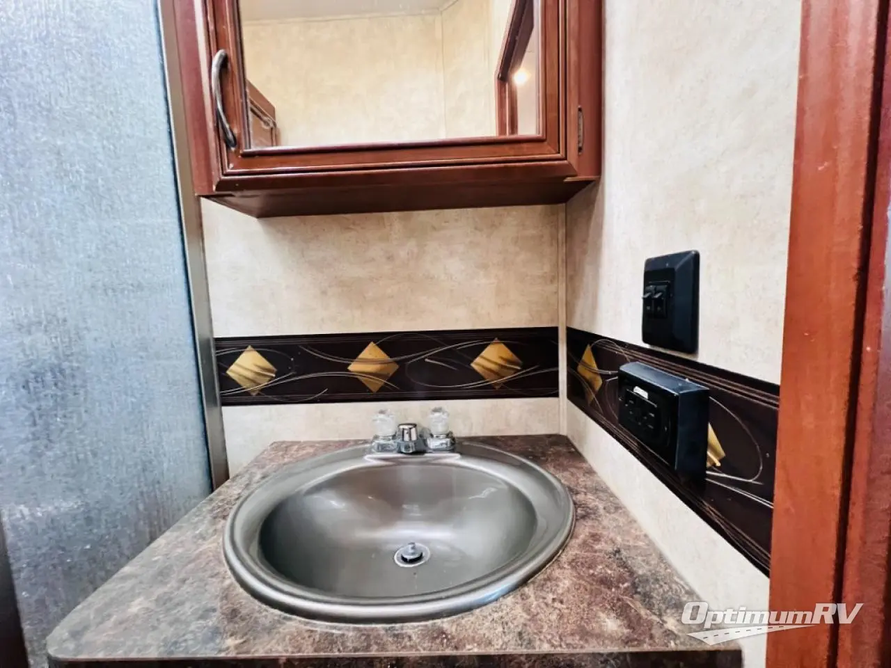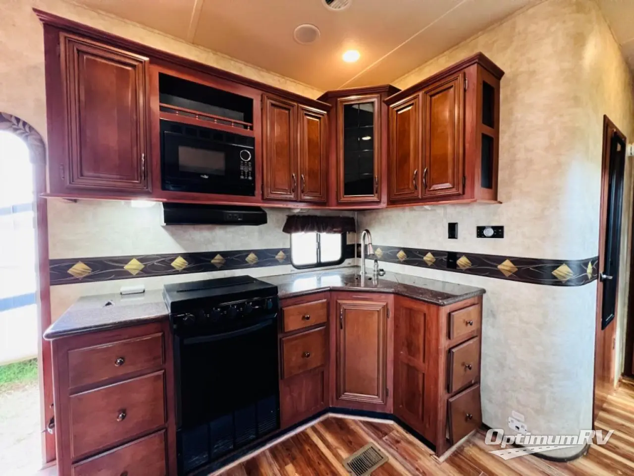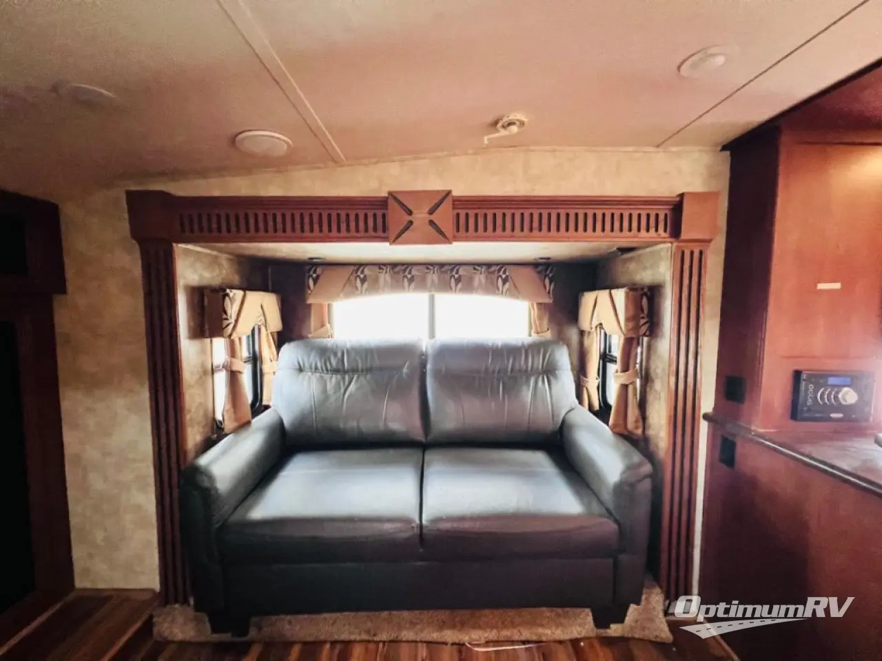 Stepping inside the fifth wheel, you will be in the living and kitchen areas. To the left is a refrigerator, three burner range, microwave, and double kitchen sink. The opposite side has a slide with a booth dinette and a hide-a-bed sofa. You will also enjoy the entertainment center, which can be easily viewed from anywhere in the kitchen and living areas.
