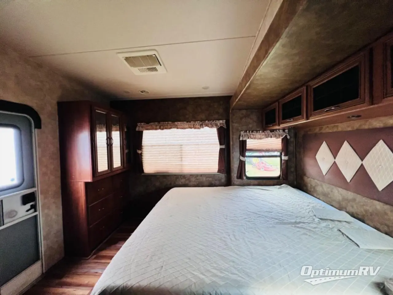 The bedroom offers a bed slide and a full wall wardrobe which is also prepped for a washer and dryer. Just above the dresser is a tv hook-up.