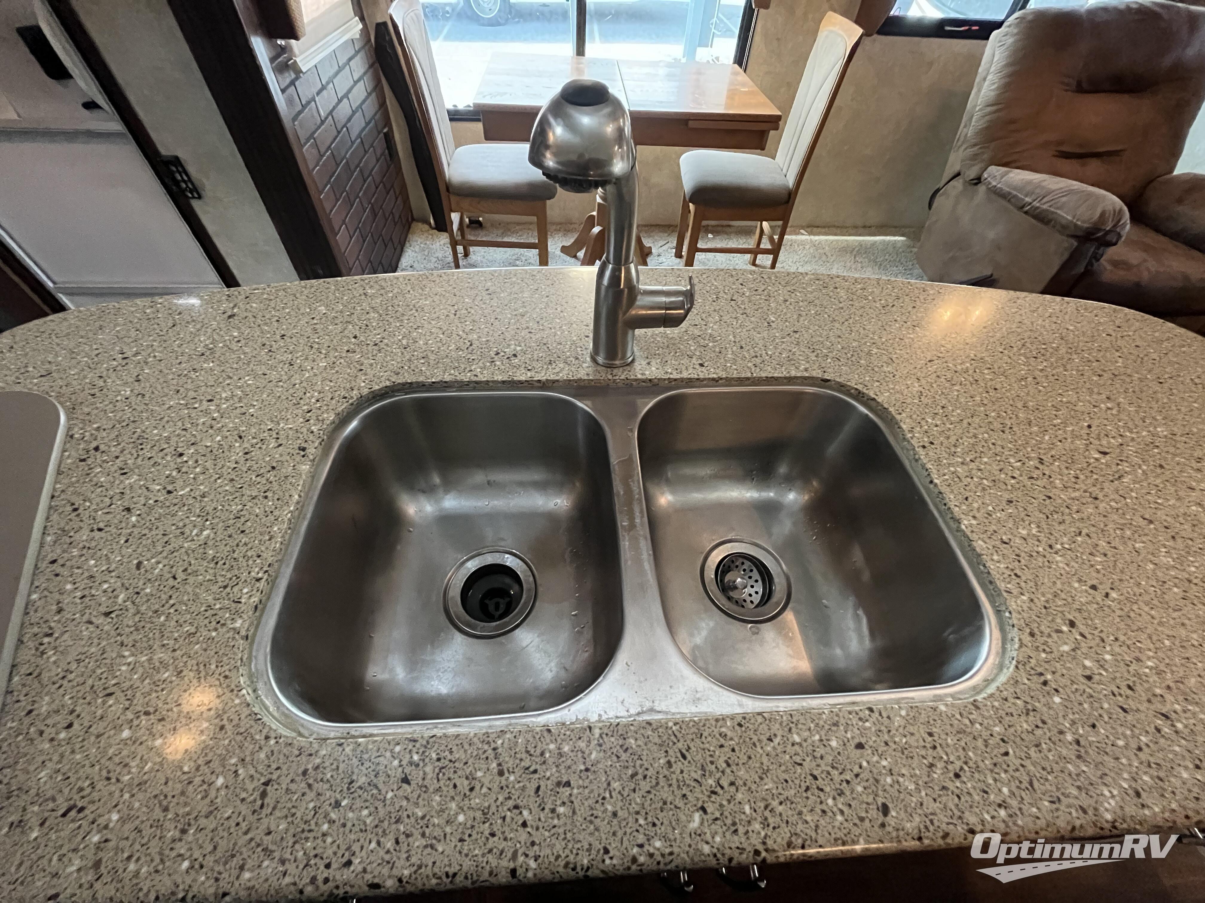 The side opposite the door features an entertainment center with 40" LCD TV, plus an optional fireplace can be added if you like. There are also kitchen appliances in this entertainment center slide which includes a pantry, counter area, three burner range, and refrigerator. The handy island is off center and is the location for the double kitchen sink.