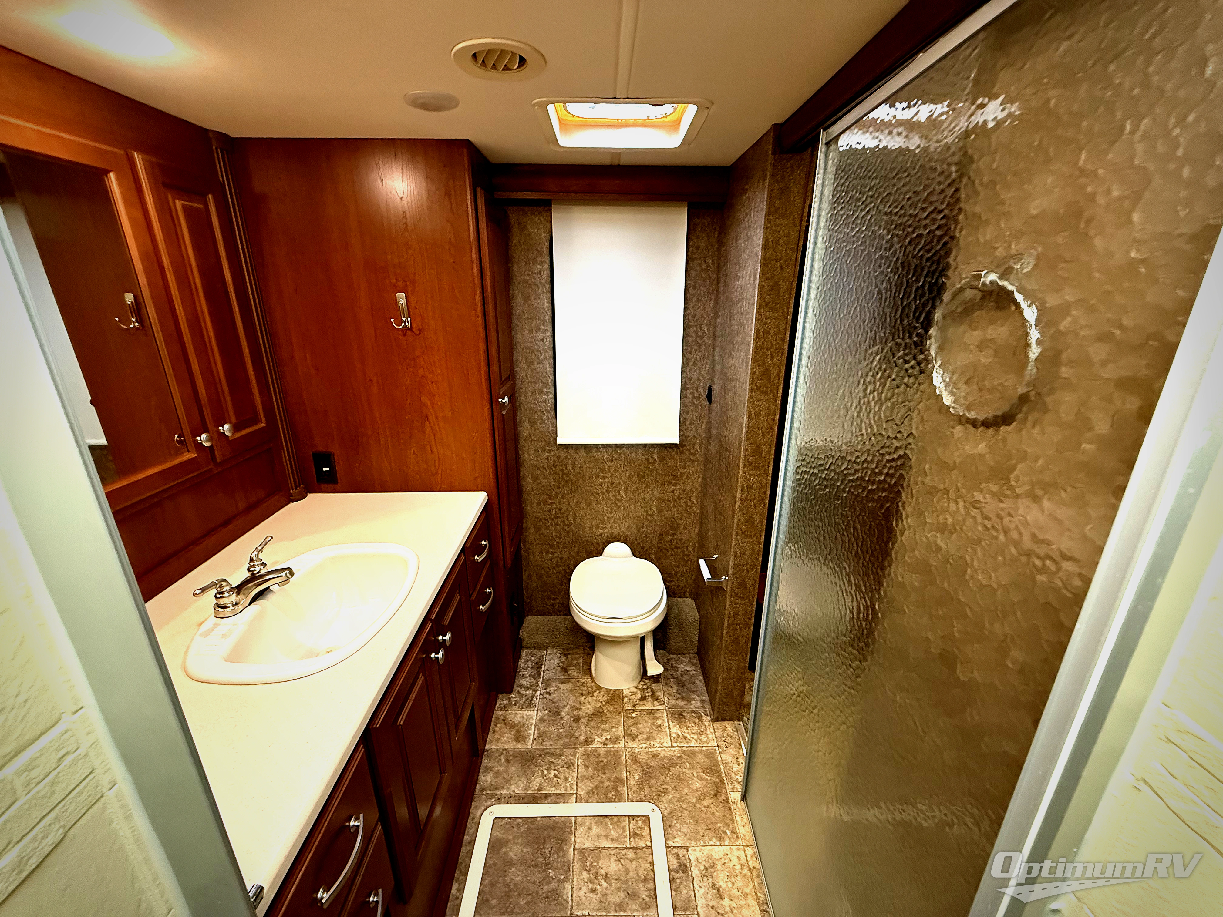 The rear bathroom includes a toilet, linen storage, large vanity, sink, more linen storage and a 32" x 32" shower.