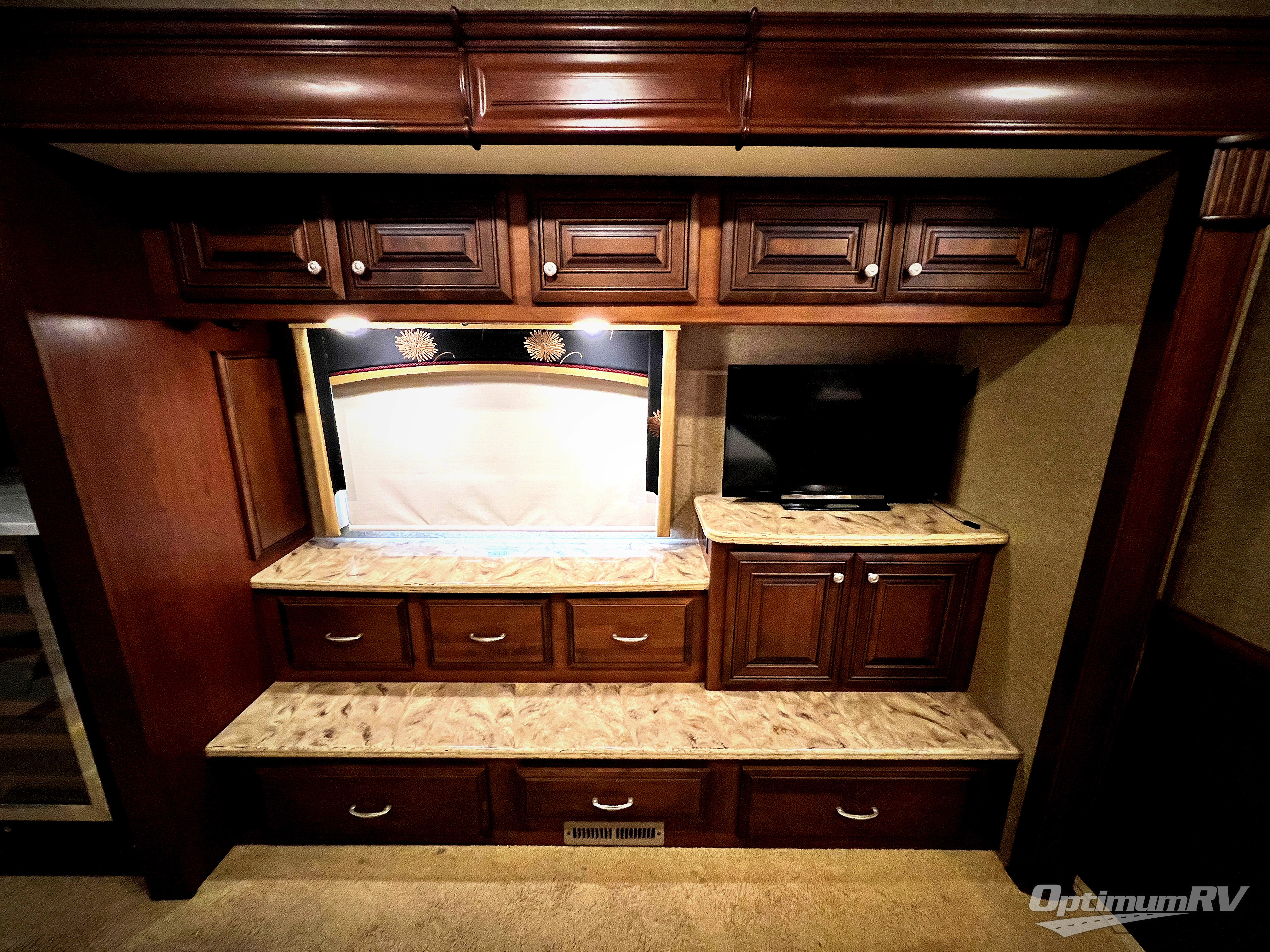 Continue toward the rear where you will find a bedroom and master bath. The king bed slide includes nightstands, the bathroom toilet and vanity, plus overhead storage. On the opposite side of the room still part of the full wall slide there is a chest of drawers in the bedroom, and a 32' HDTV.