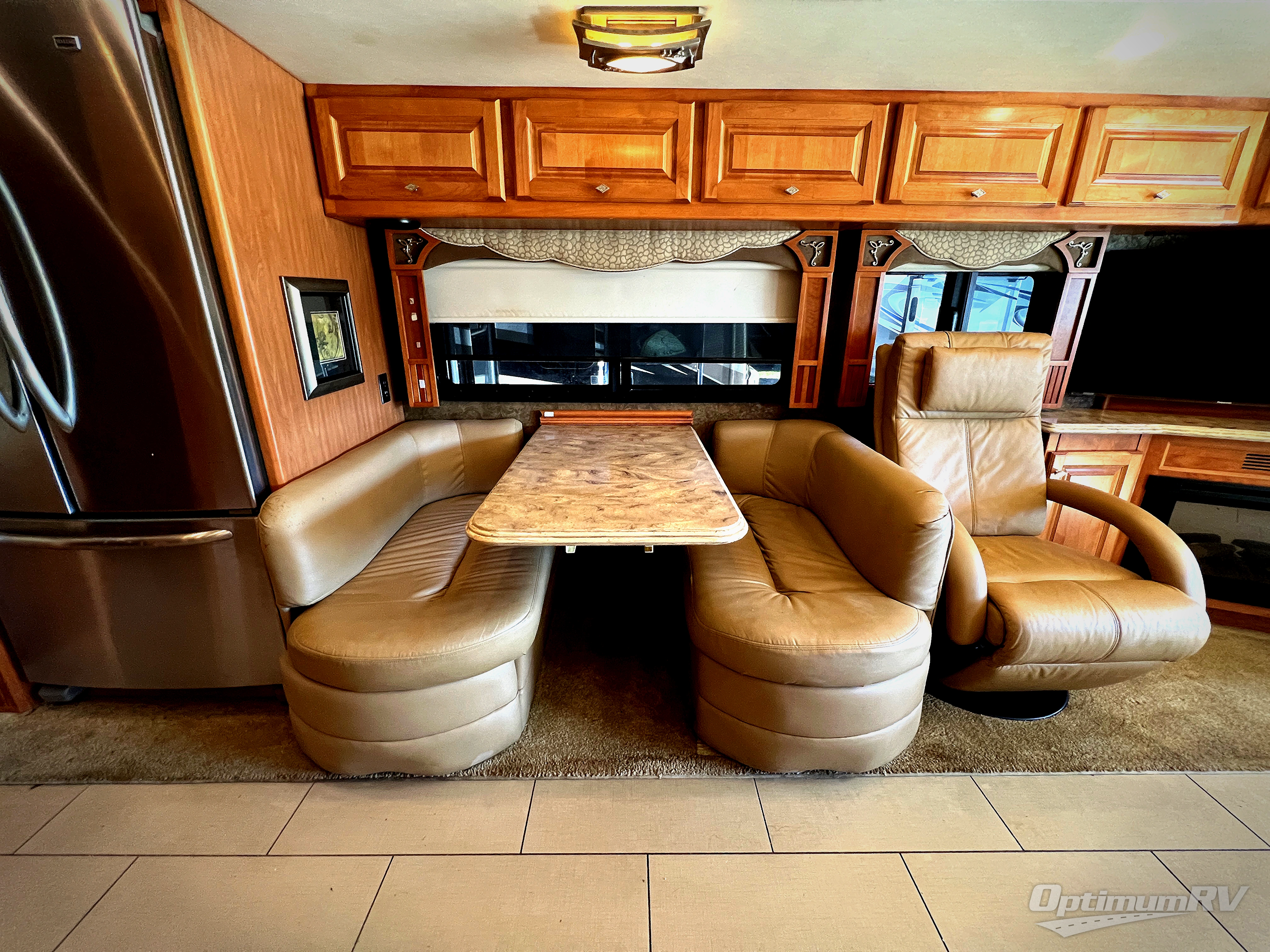 The road side slide out holds a sofa bed, booth dinette, overhead cabinets and a residential refrigerator. You may choose a u-shaped dinette, a dinette with computer workstation and/or an entertainment center with on leather lift recliner and flip table.