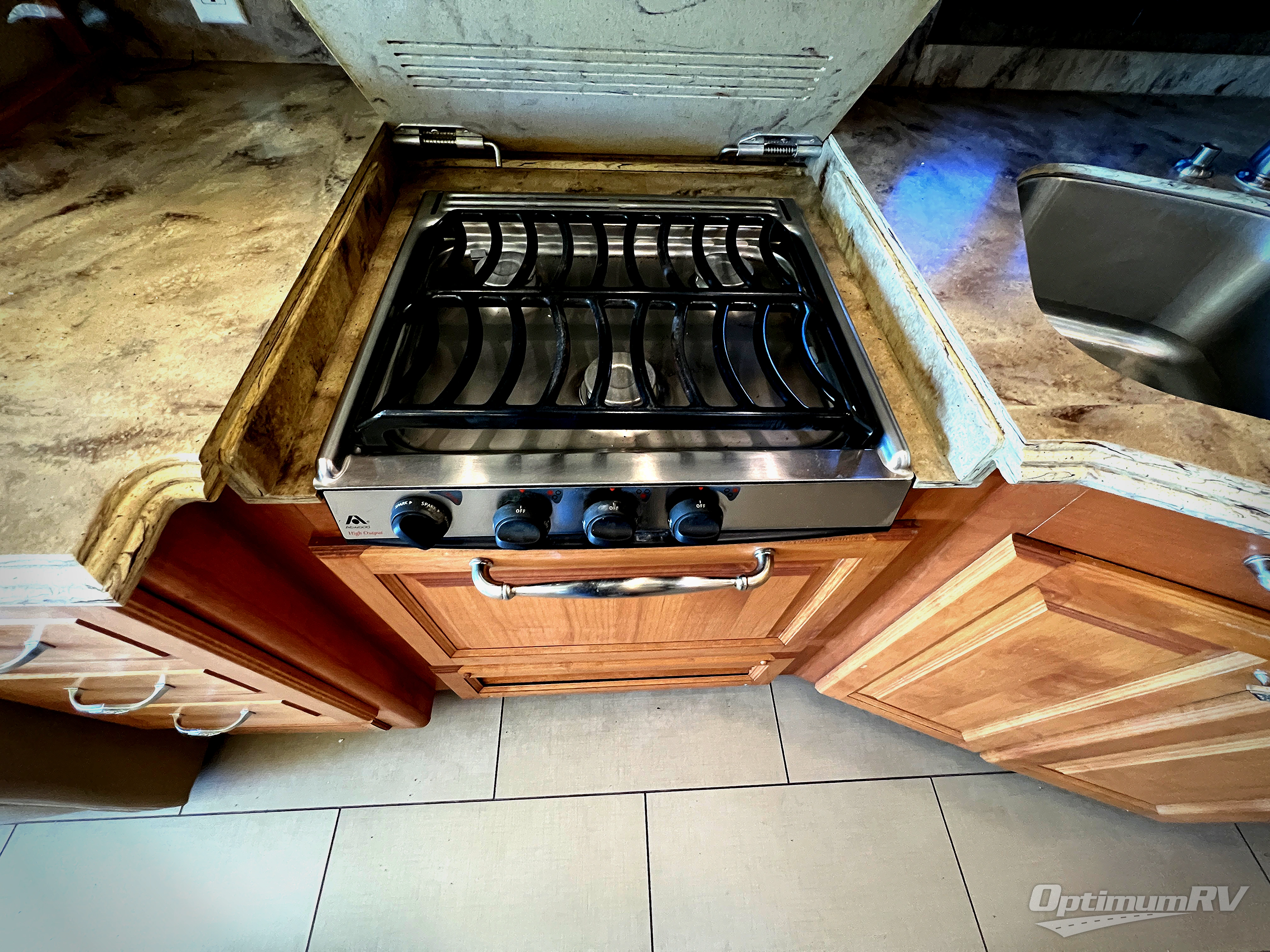 In the living area, two slides opposite each other really open up the floor space. The curb side slide holds an angled double kitchen sink, a range, an overhead convection microwave, overhead cabinets and a sofa bed. You may choose two leather lift recliners in place of the sofa bed or an exterior TV.