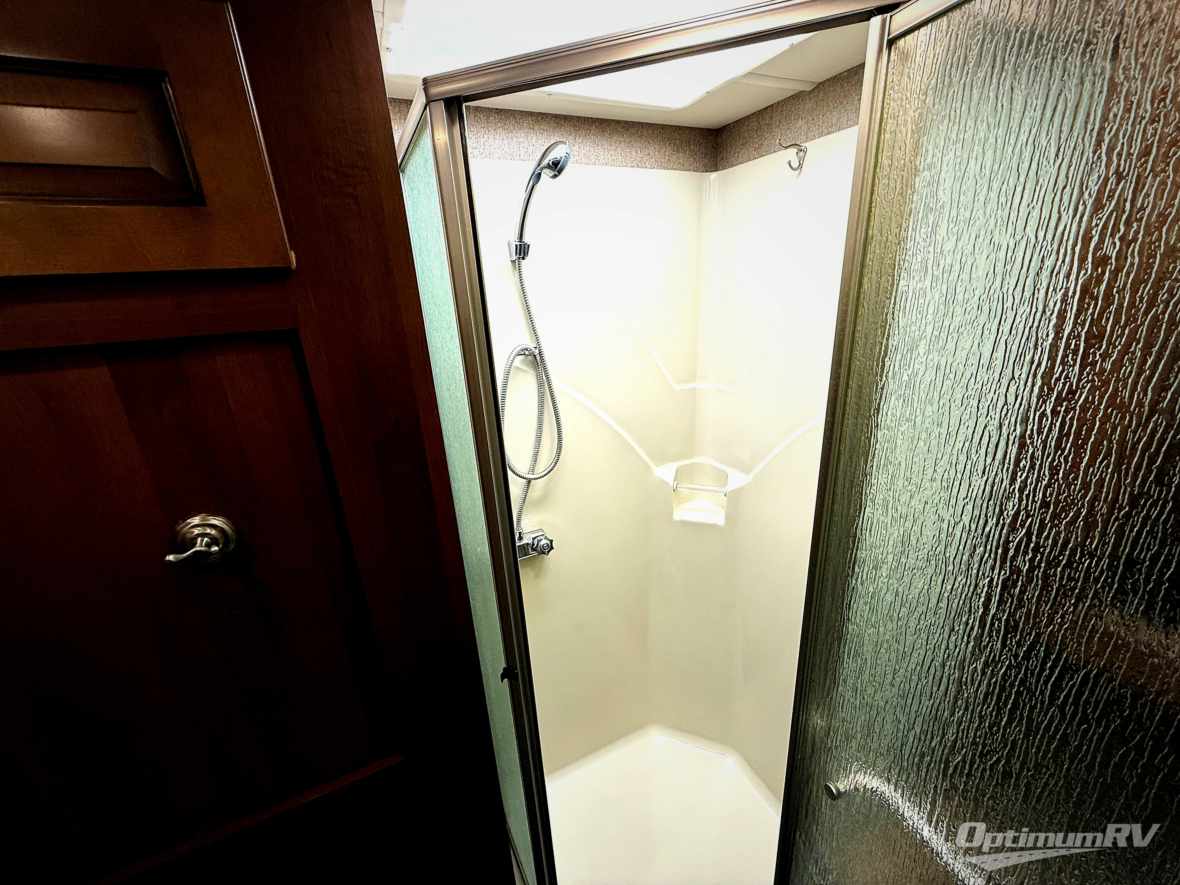 The side aisle bathroom is on the left as you continue toward the back of the motor home. In the bathroom, you will find a toilet, sink, medicine cabinet, and corner angle shower. The bedroom offers a nightstand, queen bed, wardrobe, and a wardrobe with dresser slide.