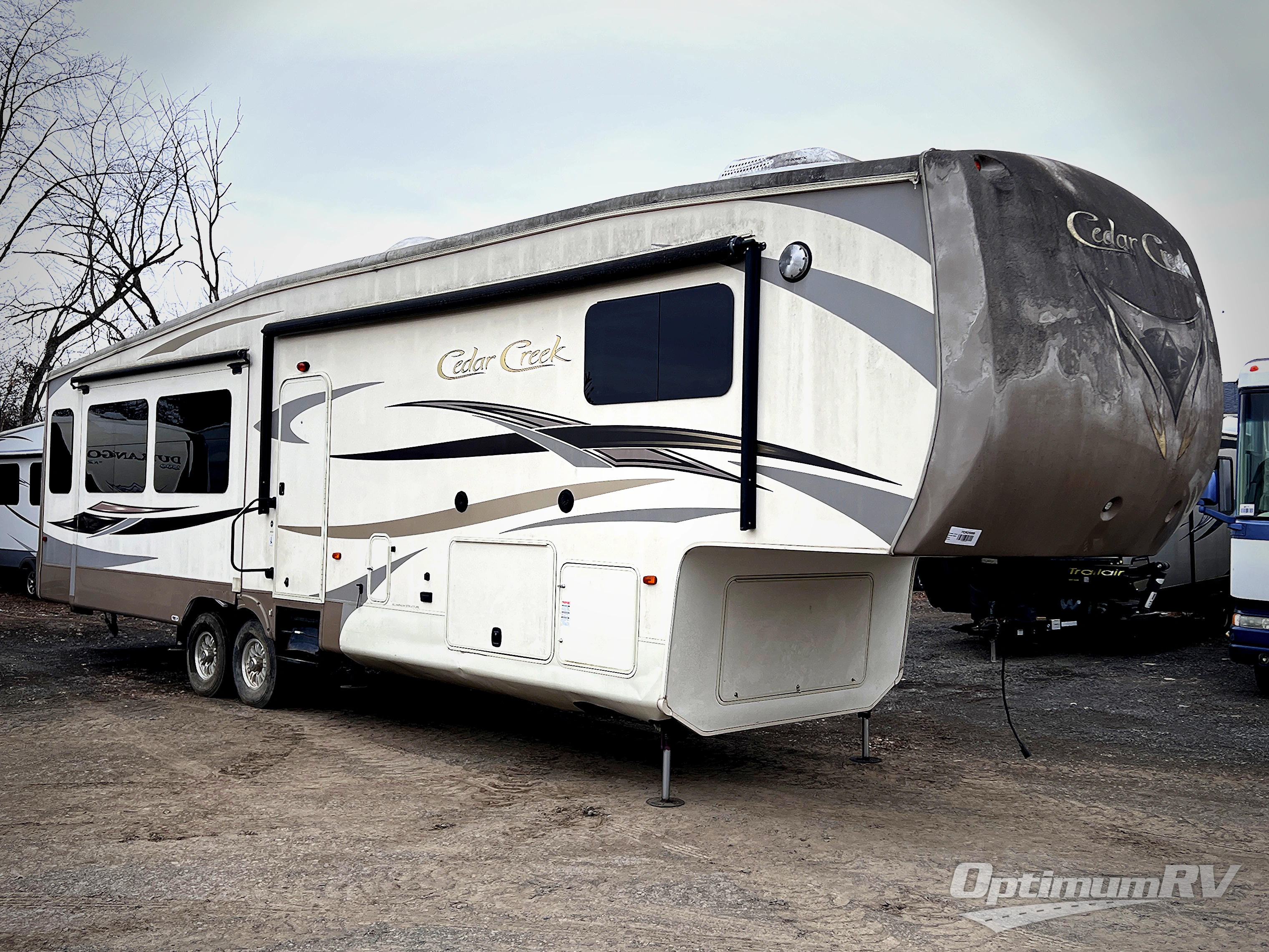 The Cedar Creek 38CK fifth wheel by Forest River offers triple slides and a rear living area.
