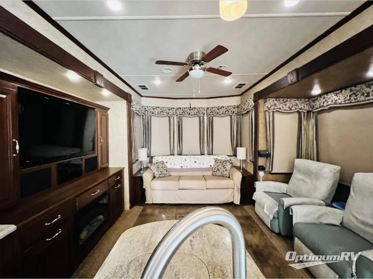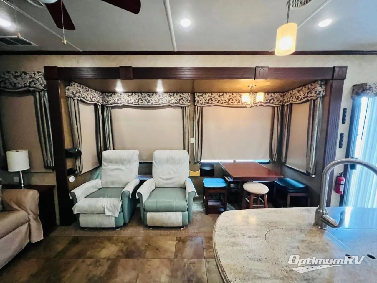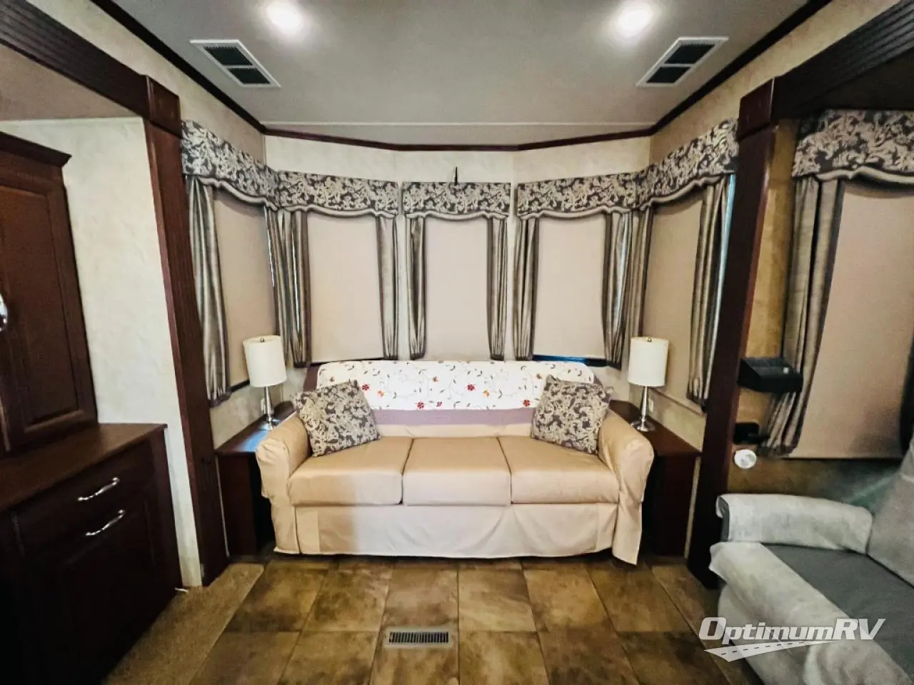 As you enter the 40CCK Cedar Creek Cottage destination trailer by Forest River you will be wowed by the space that the triple slide outs provide this destination trailer.