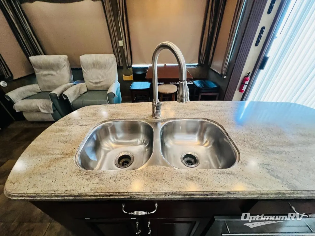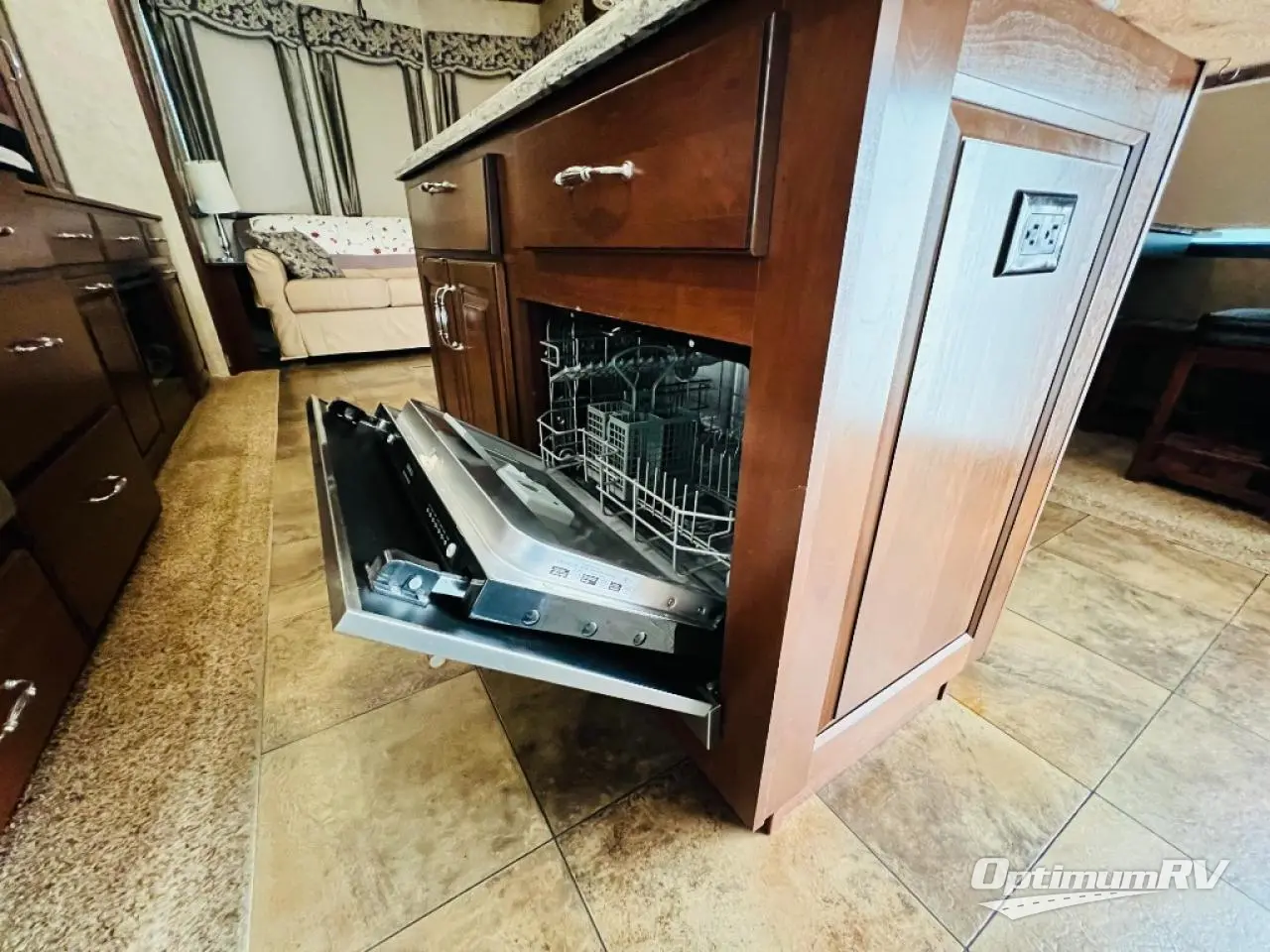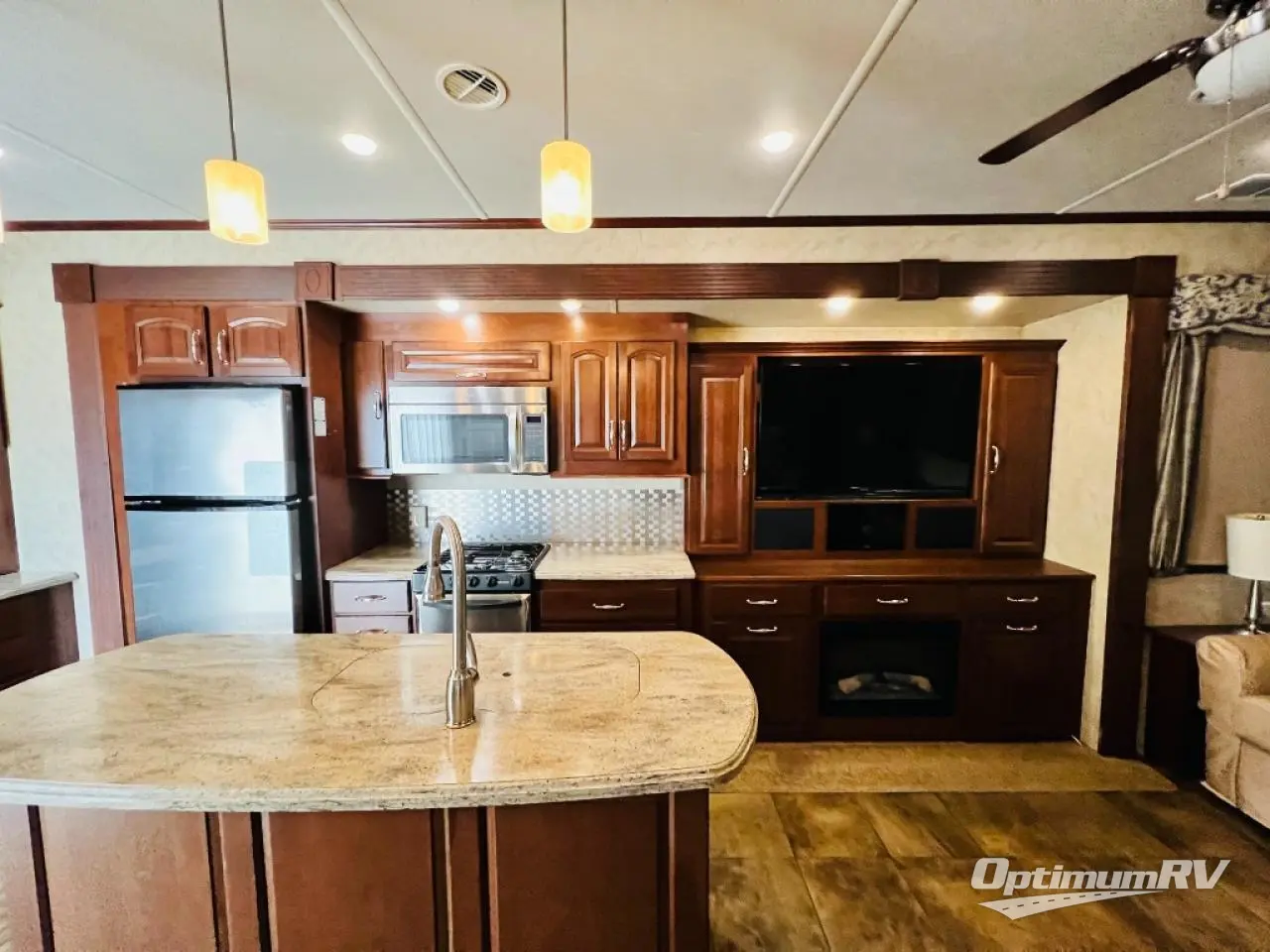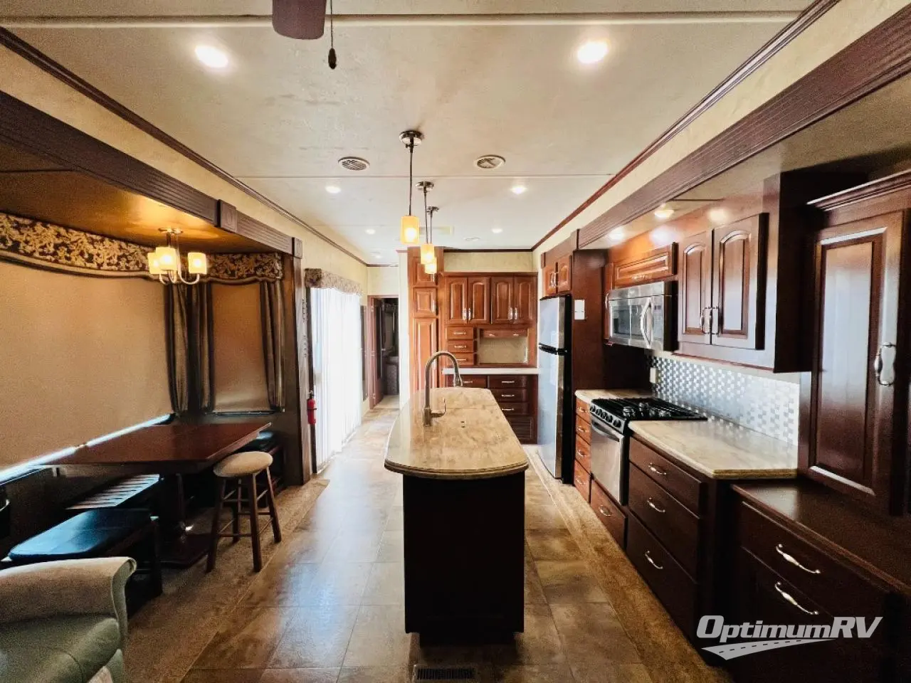 Inside the front main entrance to the right is the kitchen and living area. The kitchen and living area offer two slides which provide much space. The first slide has a free-standing table and chairs and two lounge chairs. In the front of the trailer, there is a sofa with end tables. The second slide offers a refrigerator, pantry, three burner range, microwave, pantry with dressers, and plenty of overhead space. There is also a kitchen island with a double sink.