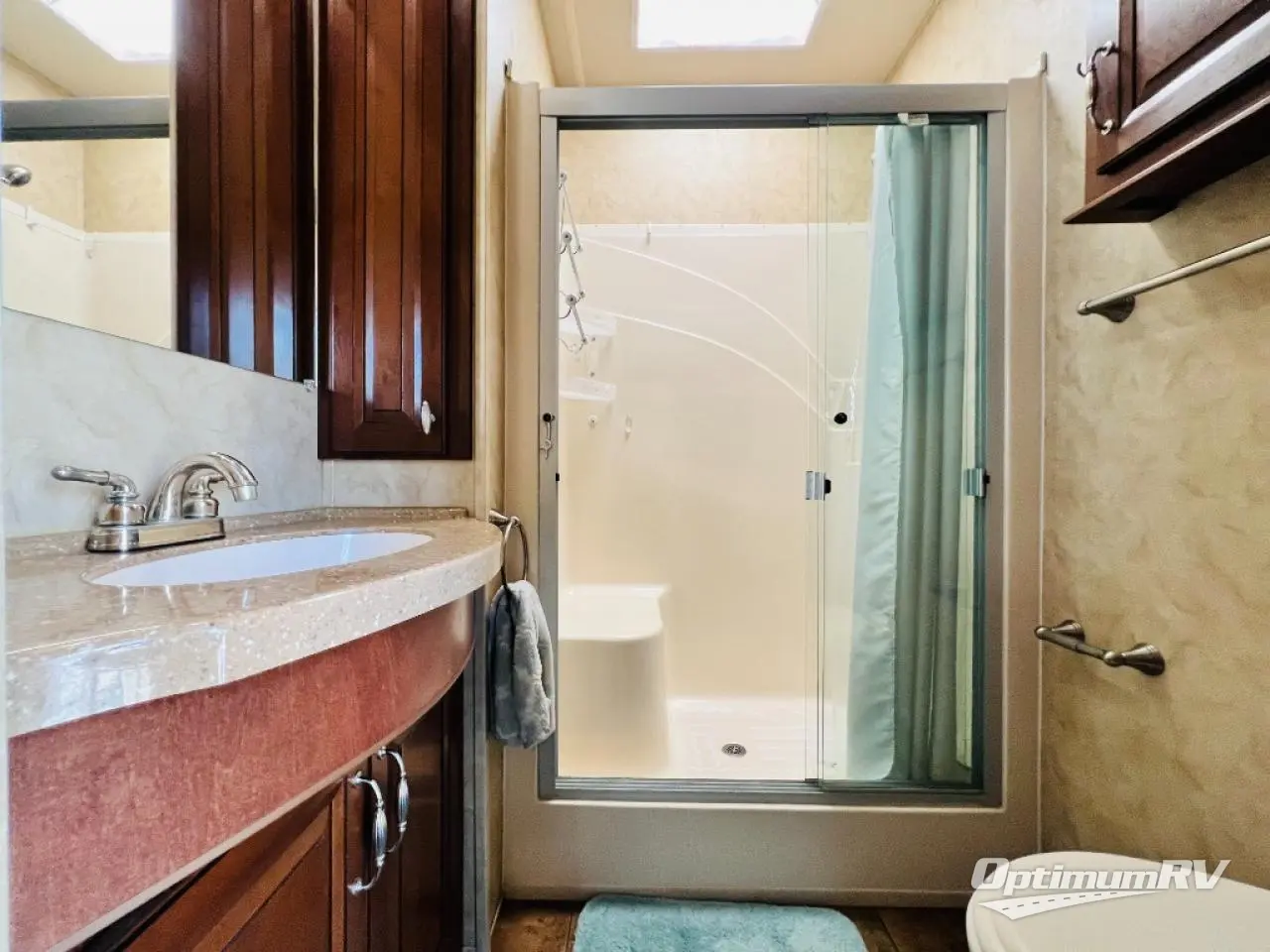 The bathroom has a sink, medicine cabinet, shower with seat, and toilet.