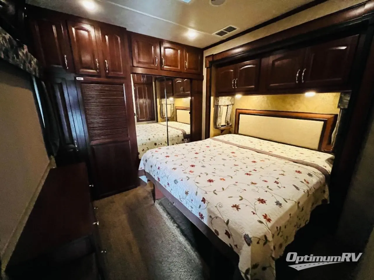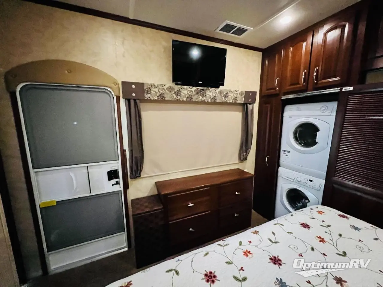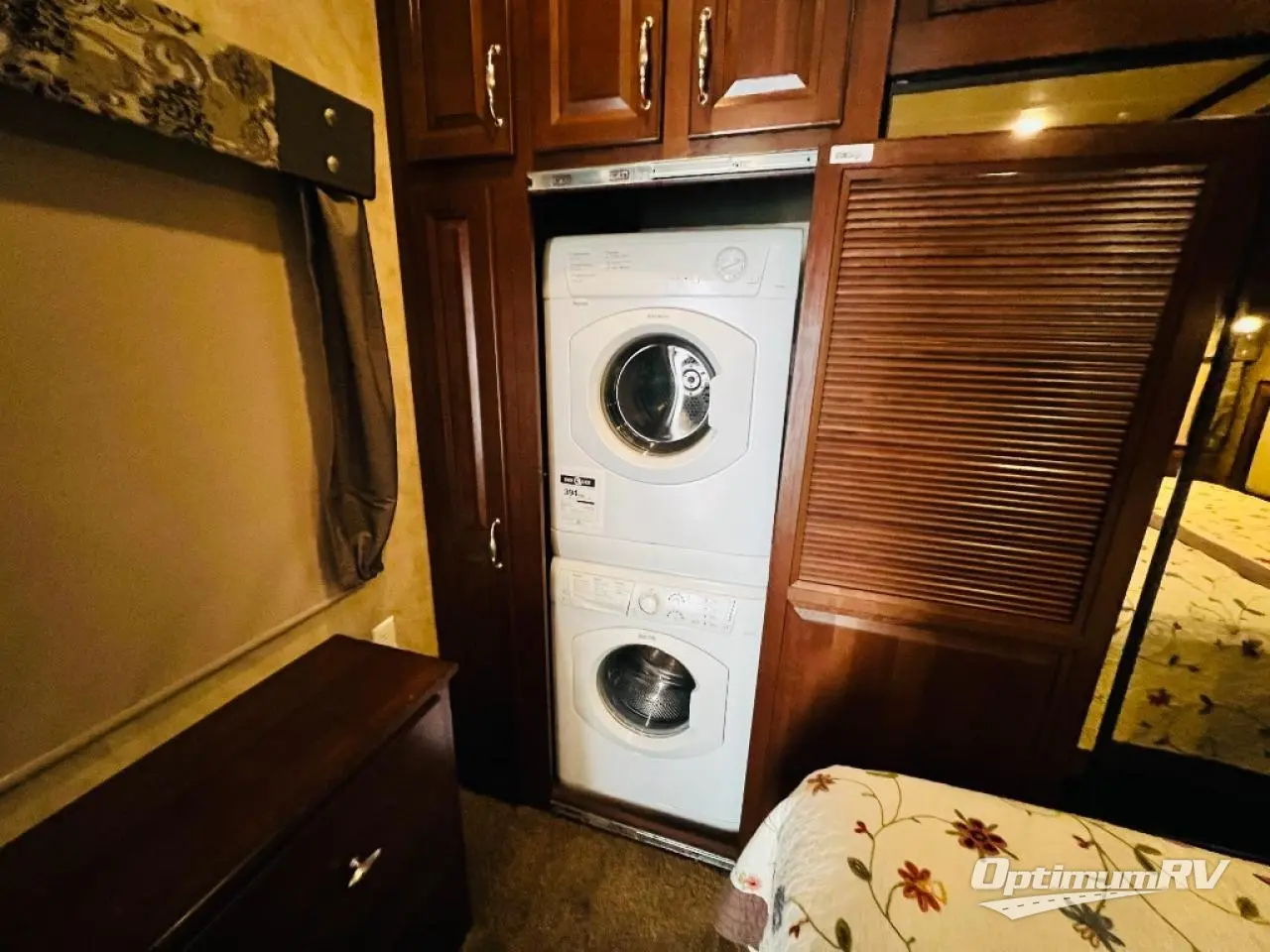 The rear bedroom offers a queen bed slide, a wardrobe, washer and dryer prepped, and drawers. You will also find a dresser opposite the bed for additional storage. There is a convenient second entry door into the bedroom.