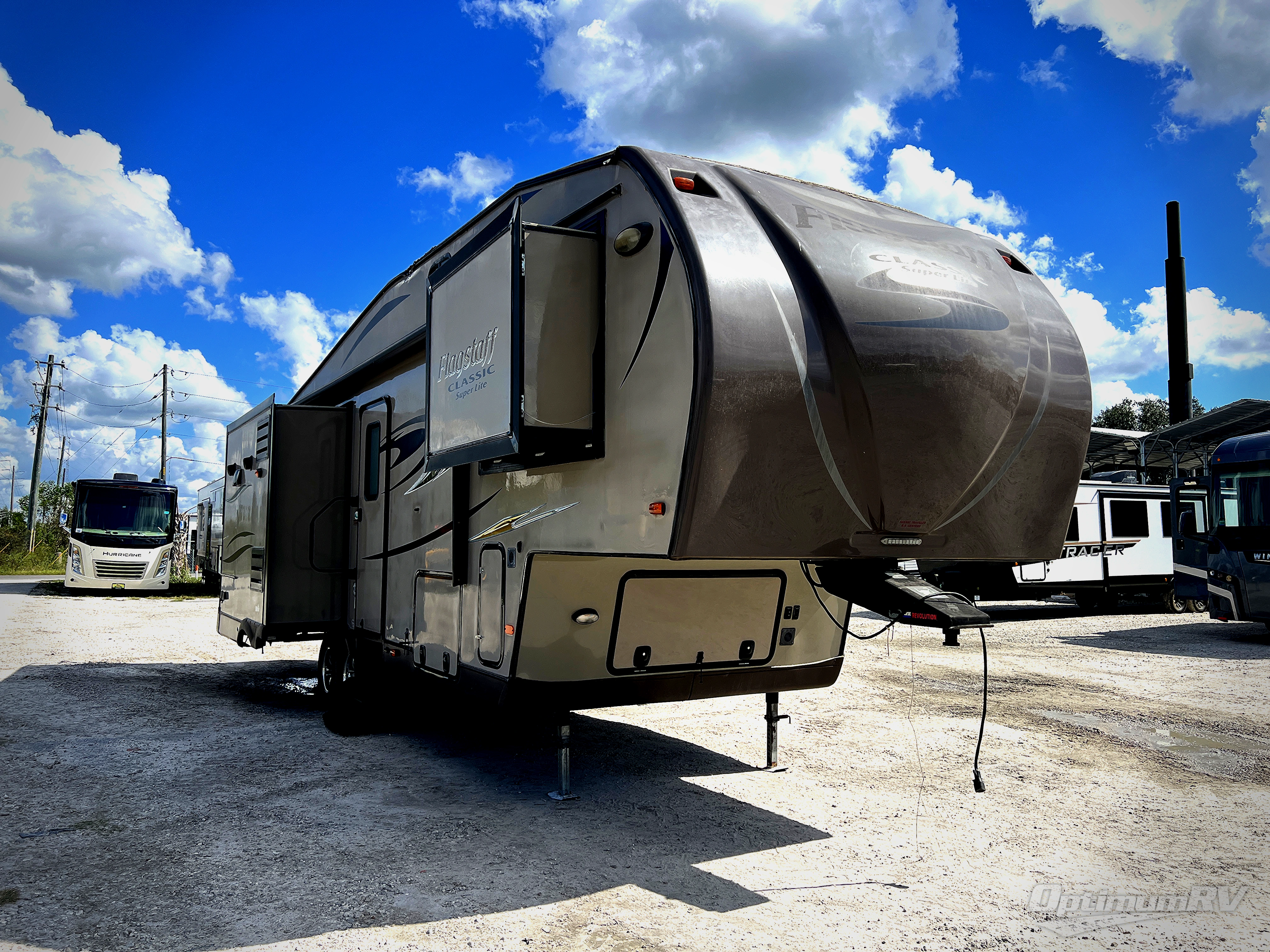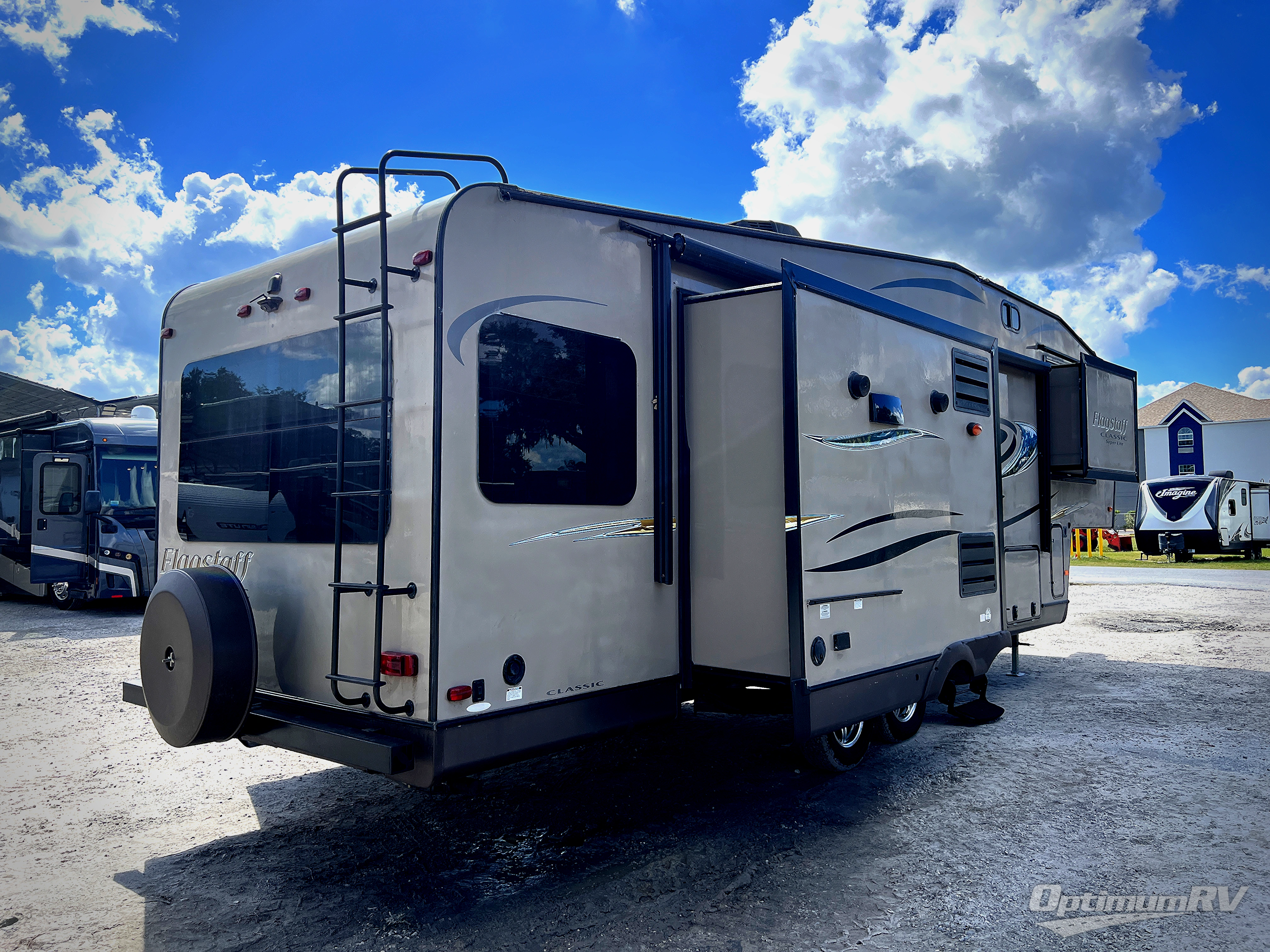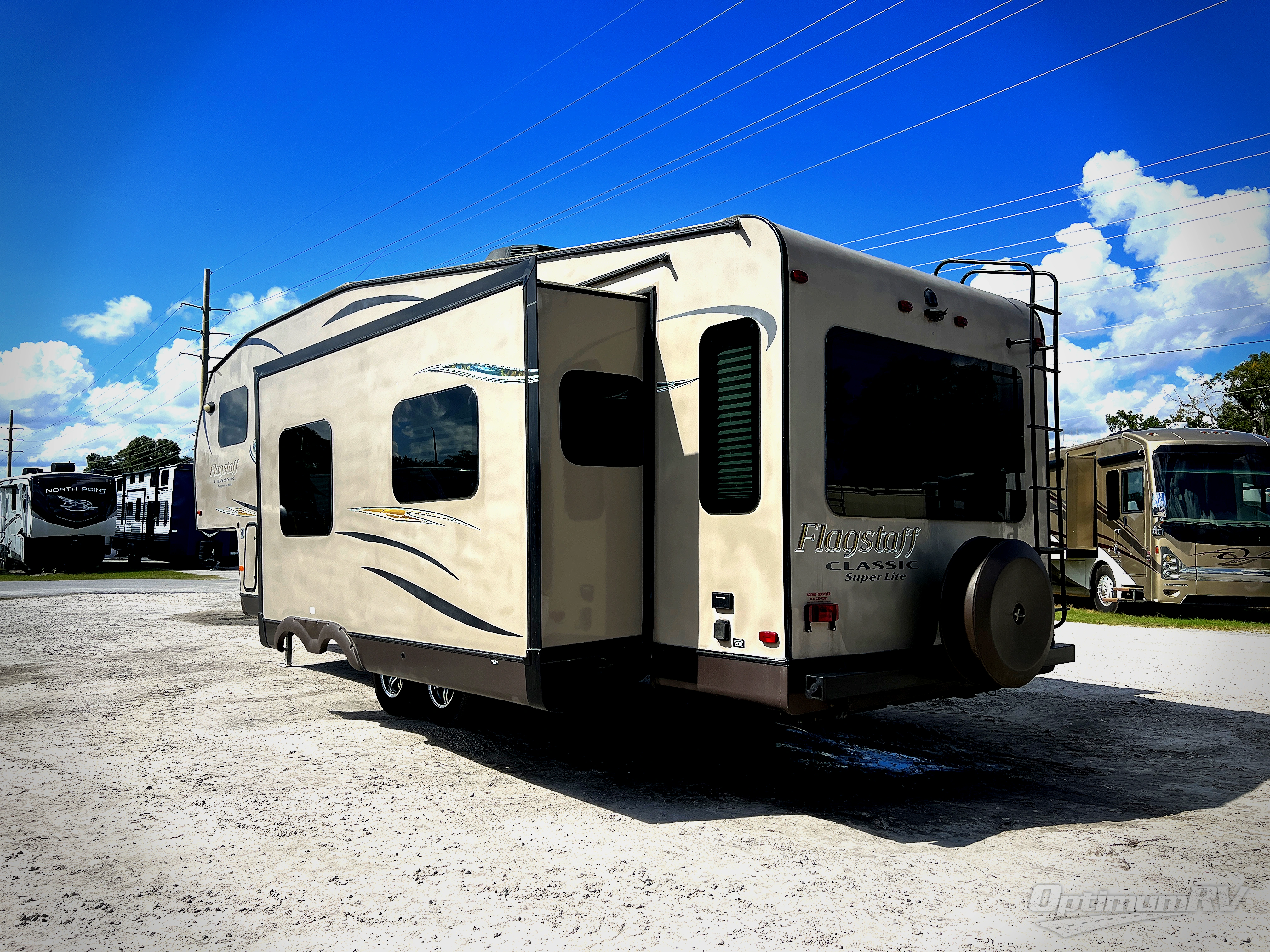 The Flagstaff Classic Super Lite 8528IKWS fifth wheel by Forest River offers triple slides and a kitchen island.