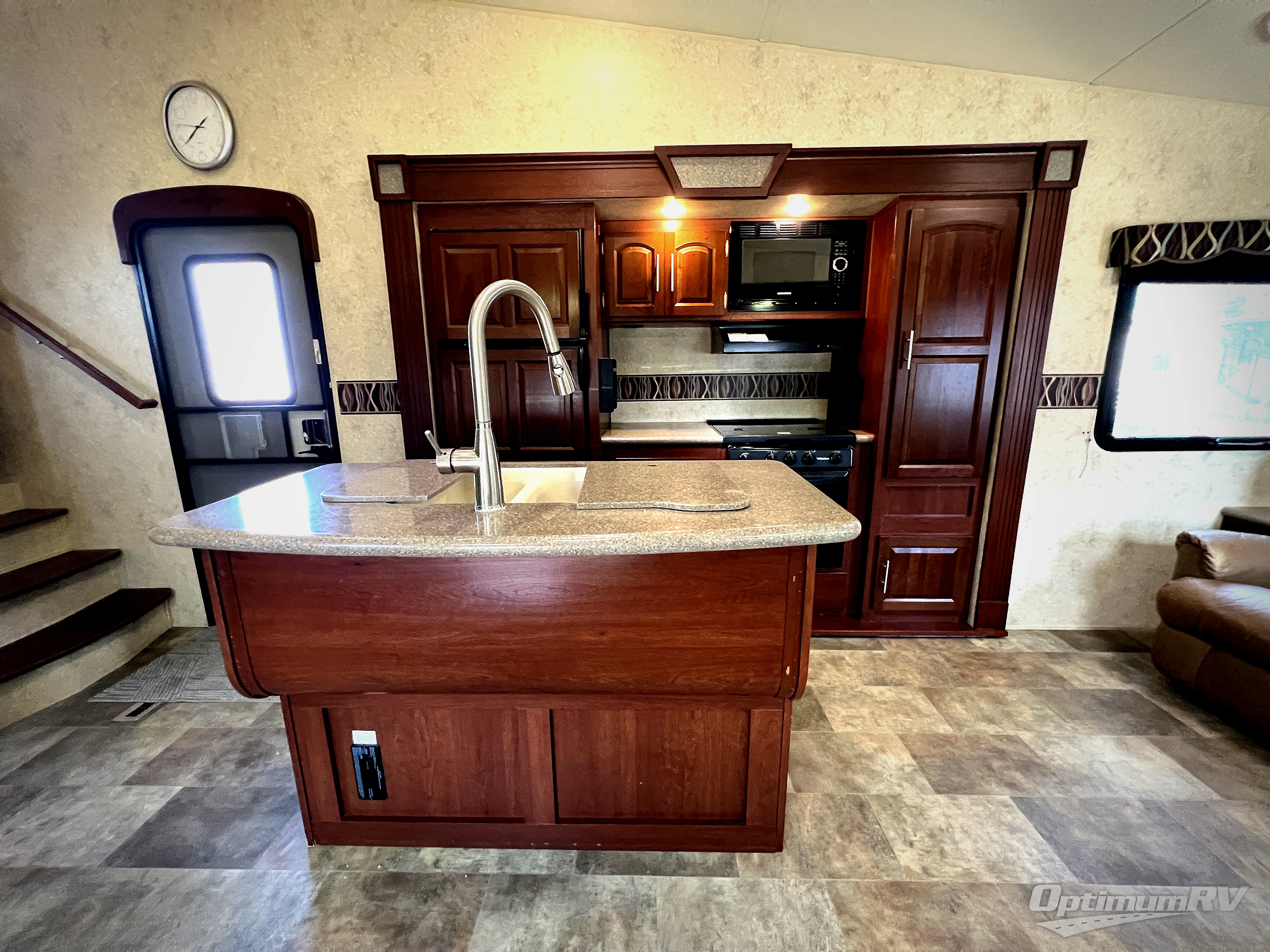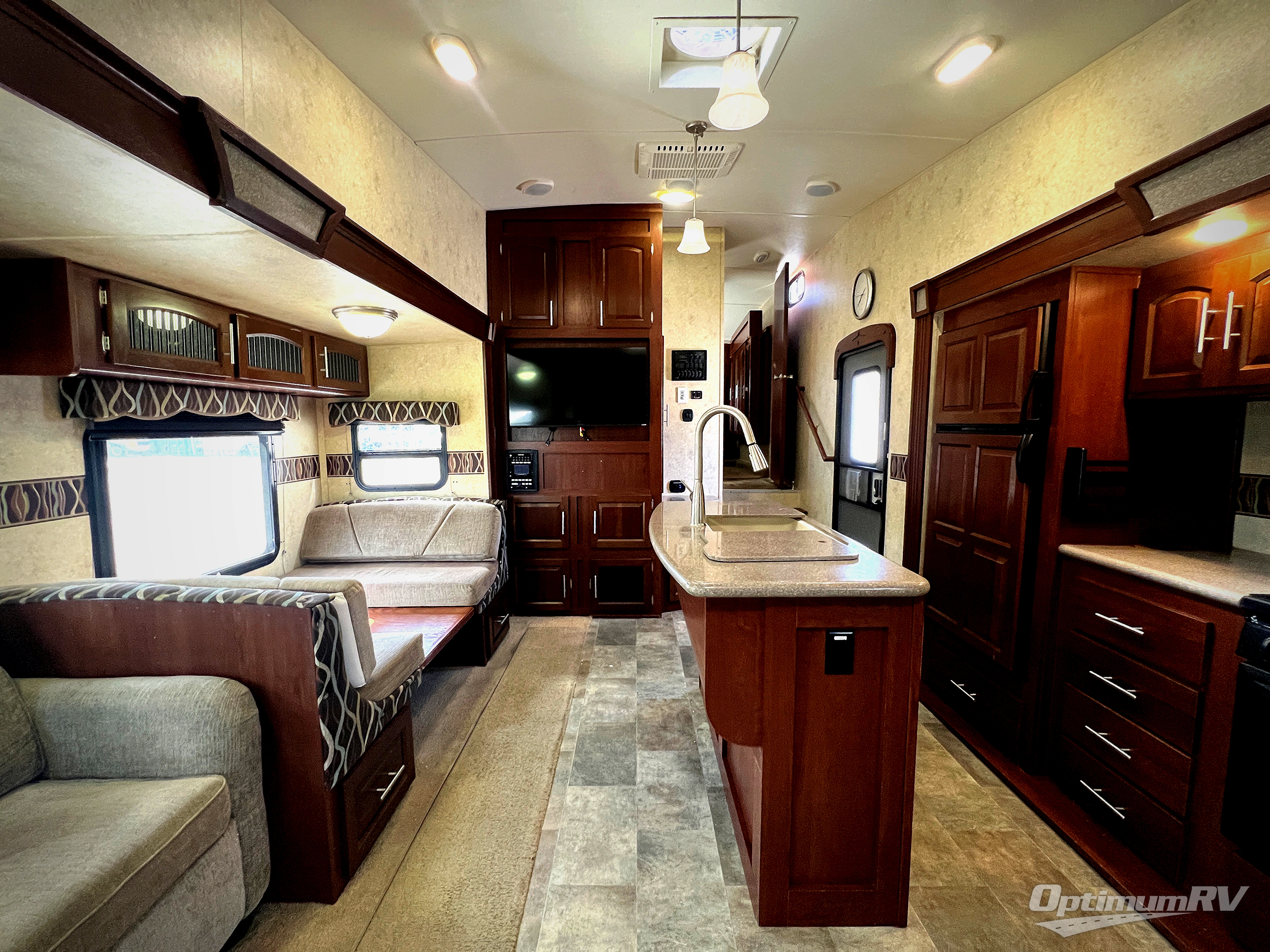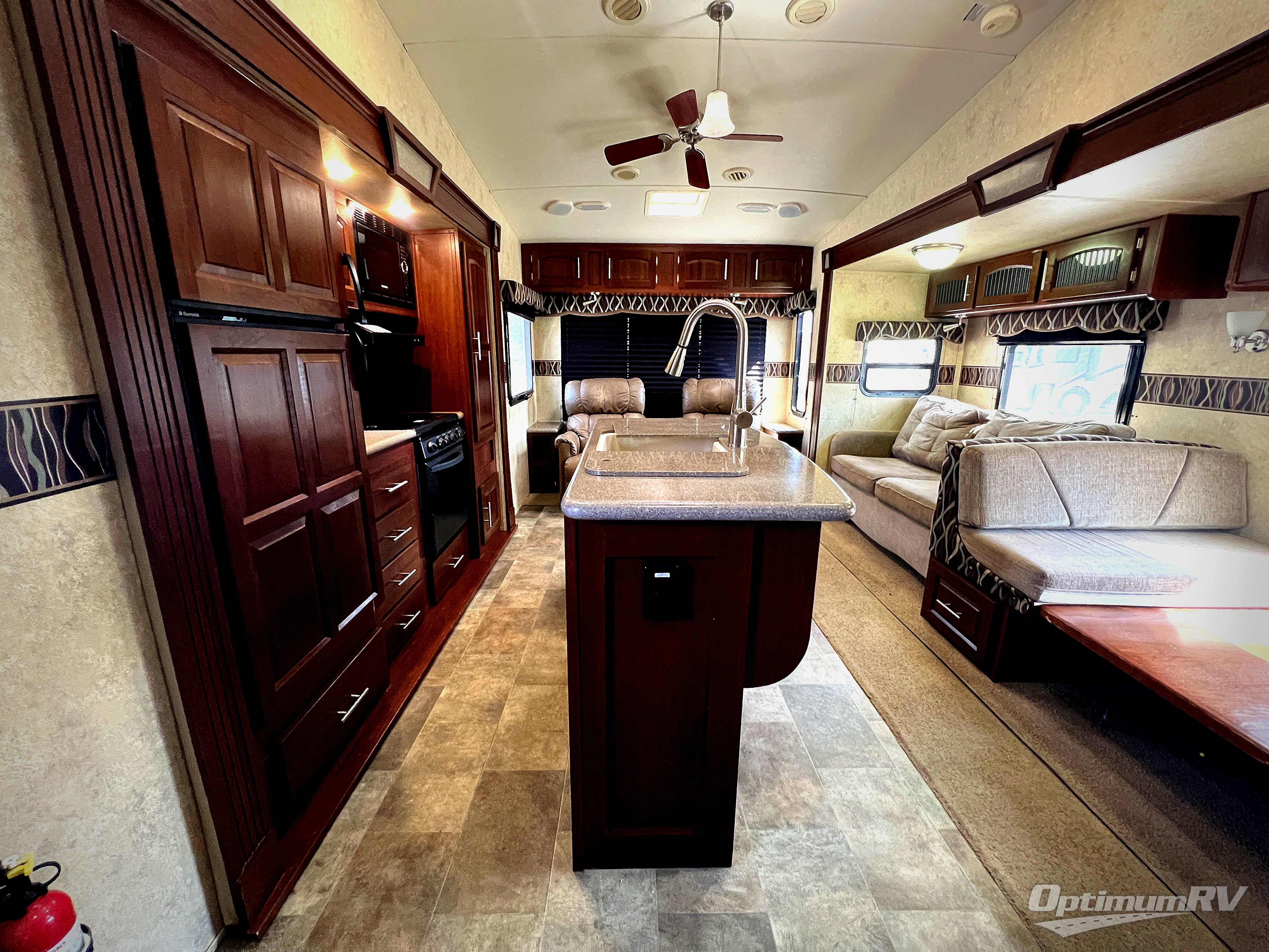 As you enter the fifth wheel, to the left there is a slide with a corner entertainment center, an optional fireplace below the entertainment center and a free-standing dinette. Along the rear wall you will find two chairs and three end tables. The other slide has a hide-a-bed sofa, refrigerator, and three burner range. You will also find a large pantry and microwave. The kitchen island provides extra counter space as well as a large sink.