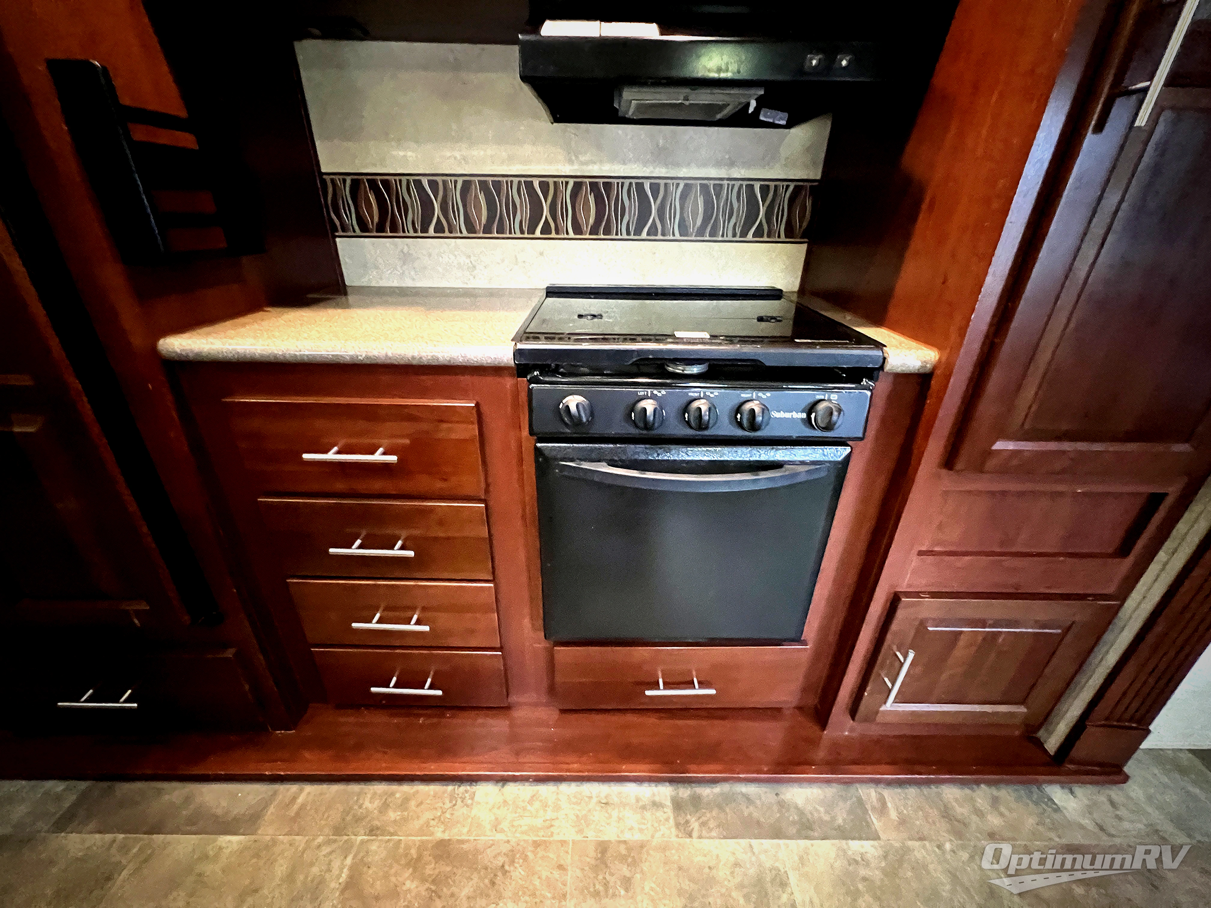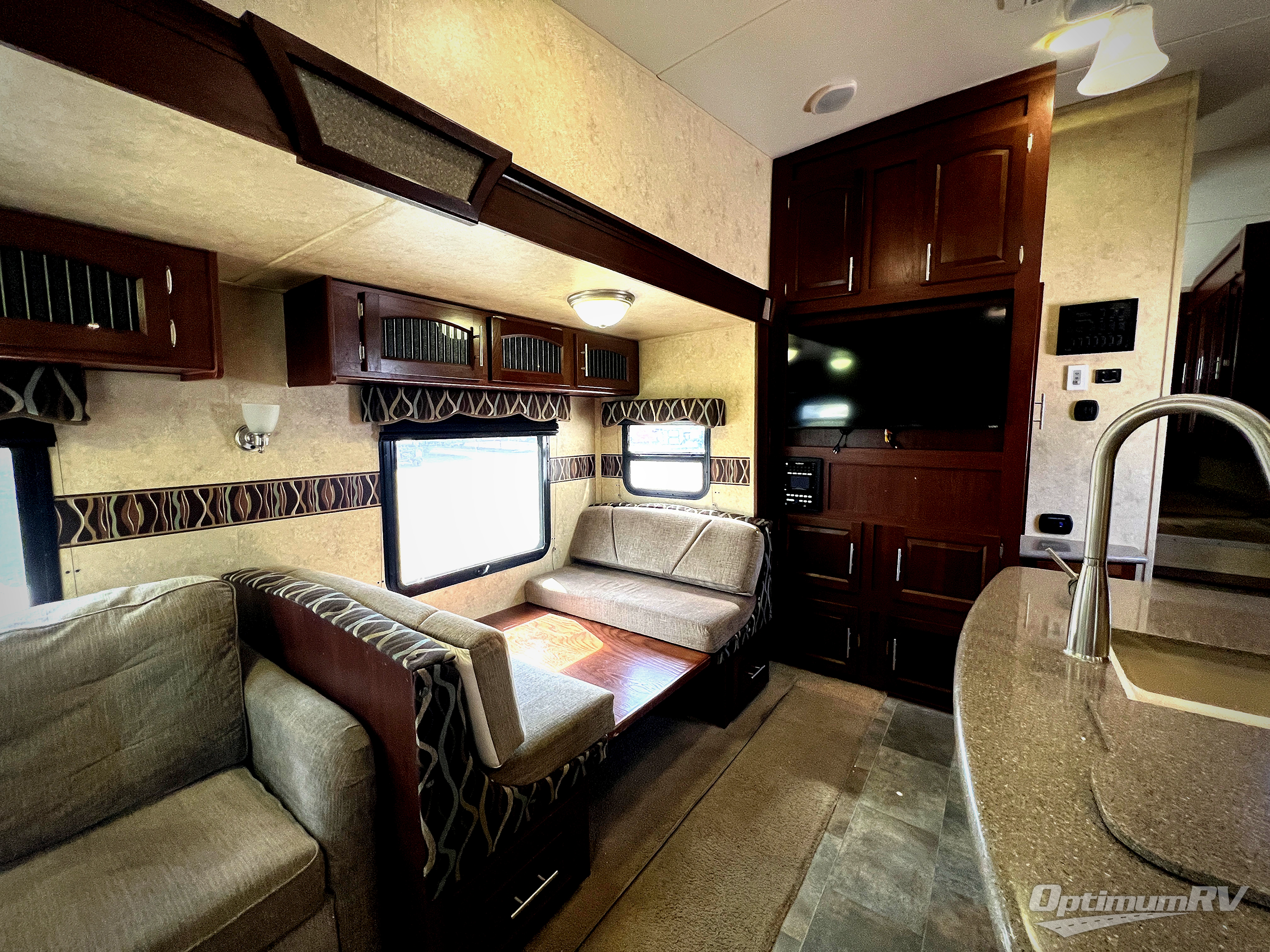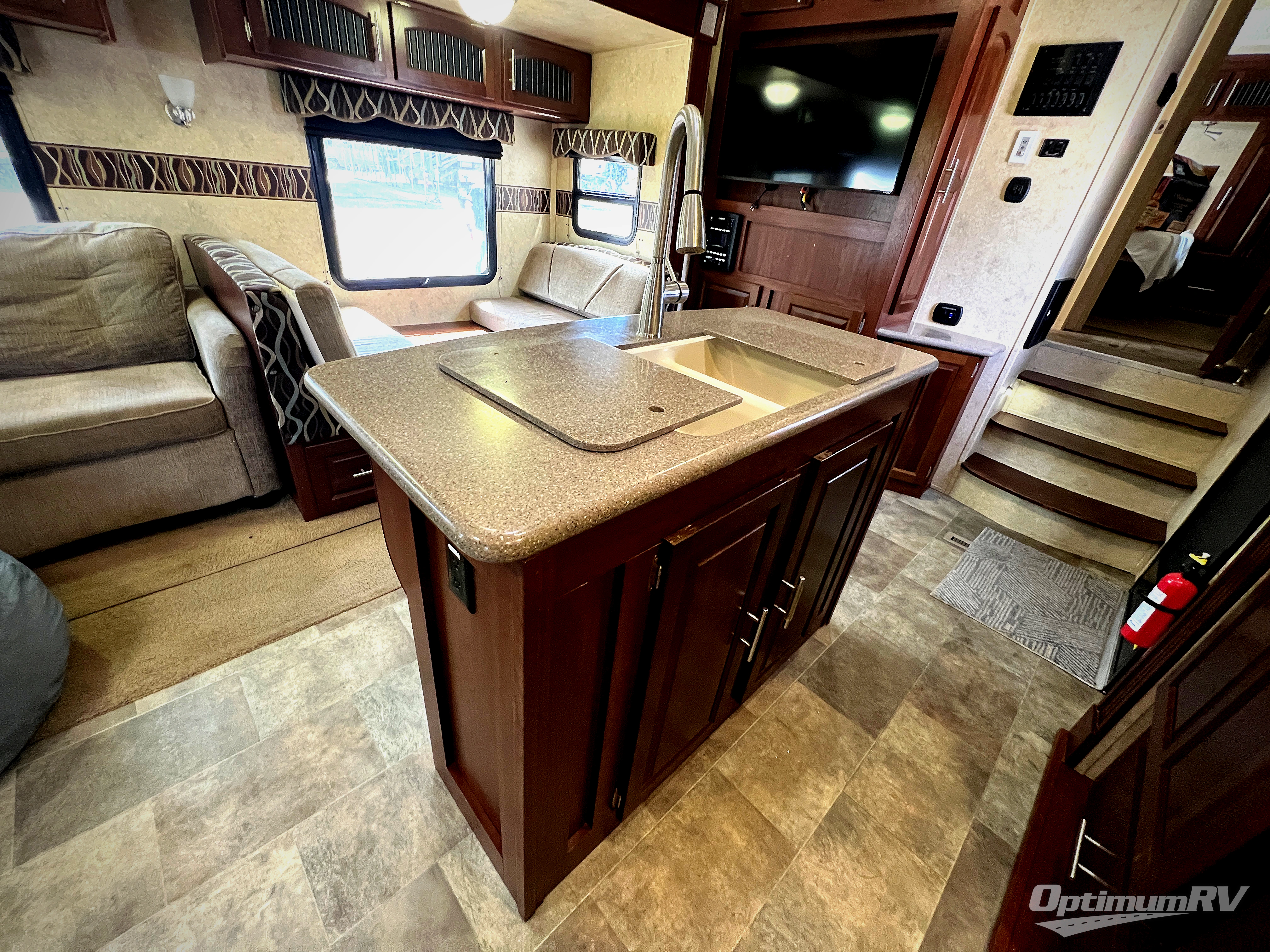 As you enter the fifth wheel, to the left there is a slide with a corner entertainment center, an optional fireplace below the entertainment center and a free-standing dinette. Along the rear wall you will find two chairs and three end tables. The other slide has a hide-a-bed sofa, refrigerator, and three burner range. You will also find a large pantry and microwave. The kitchen island provides extra counter space as well as a large sink.