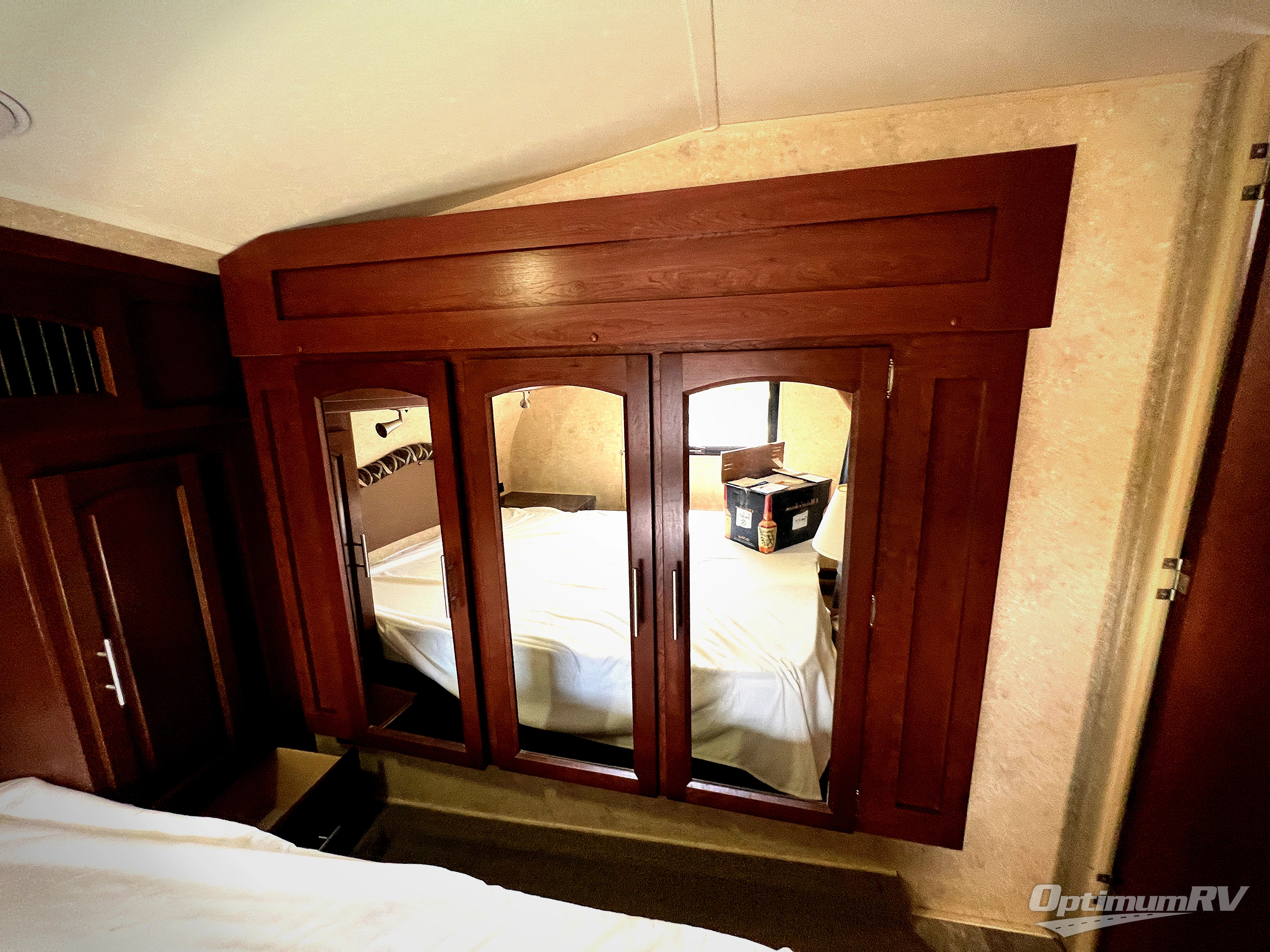 The front bedroom has a queen bed, nightstand, shirt closet, and wardrobe slide. In the corner, there is even an optional TV.