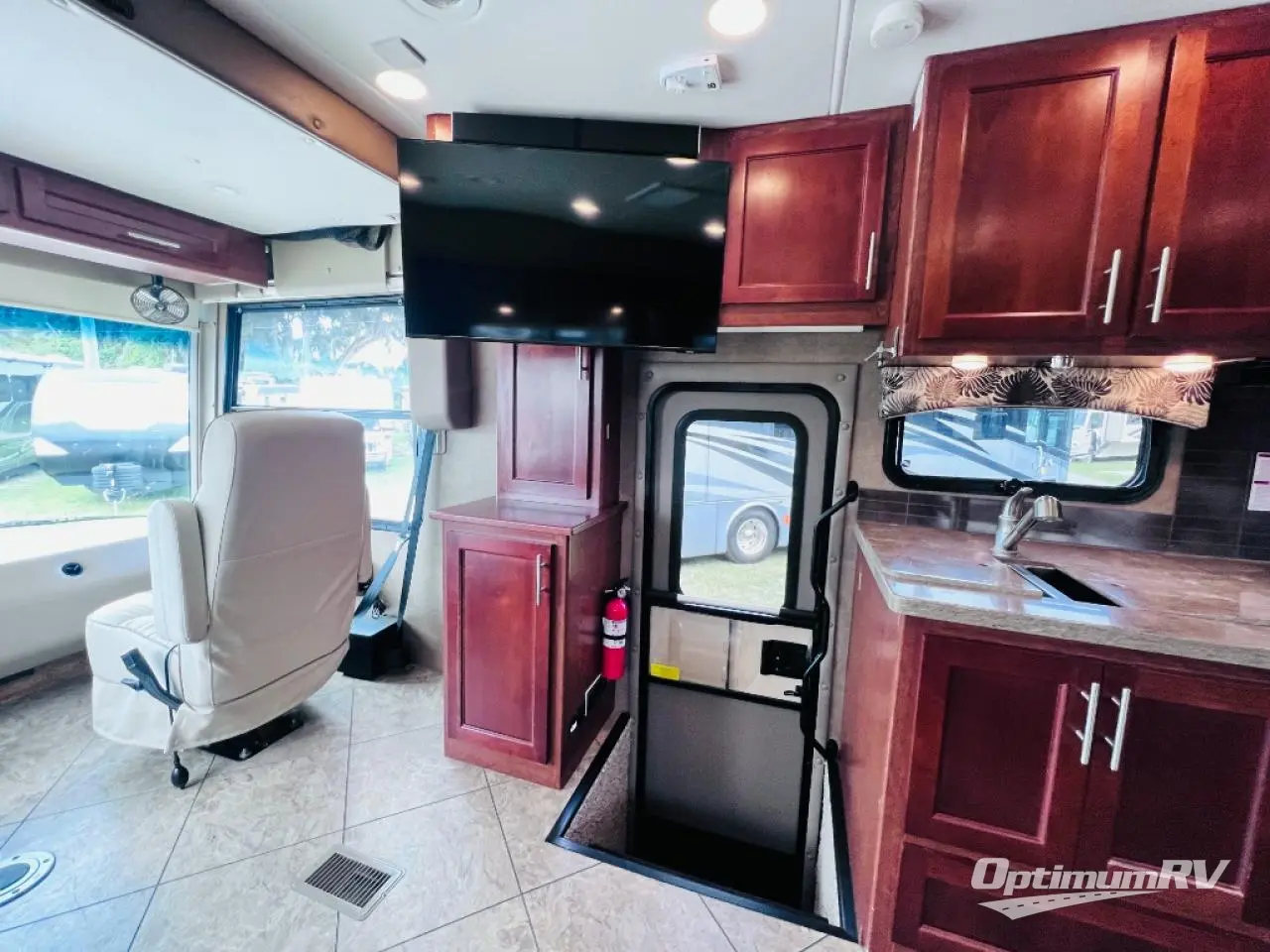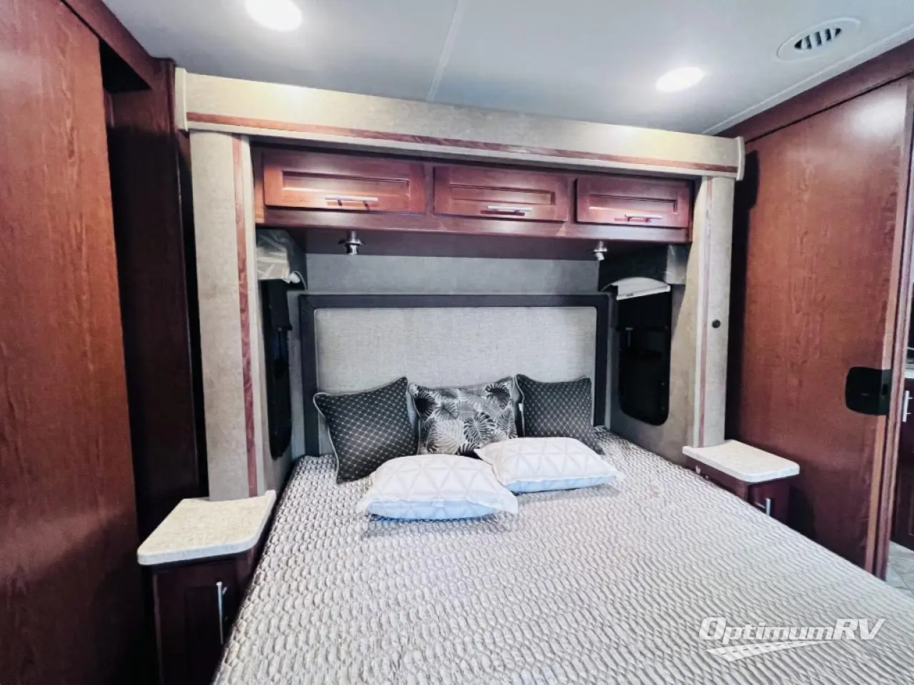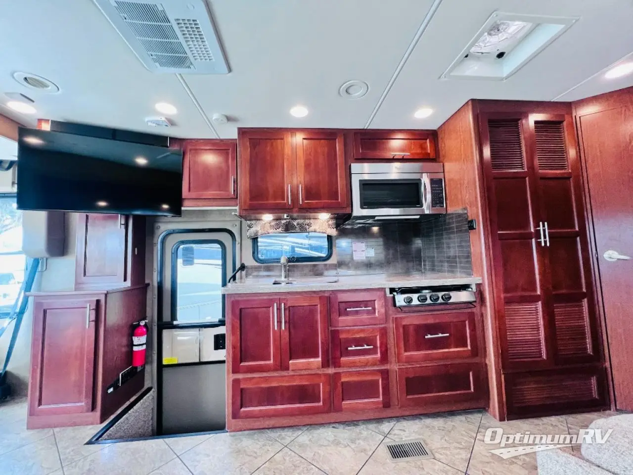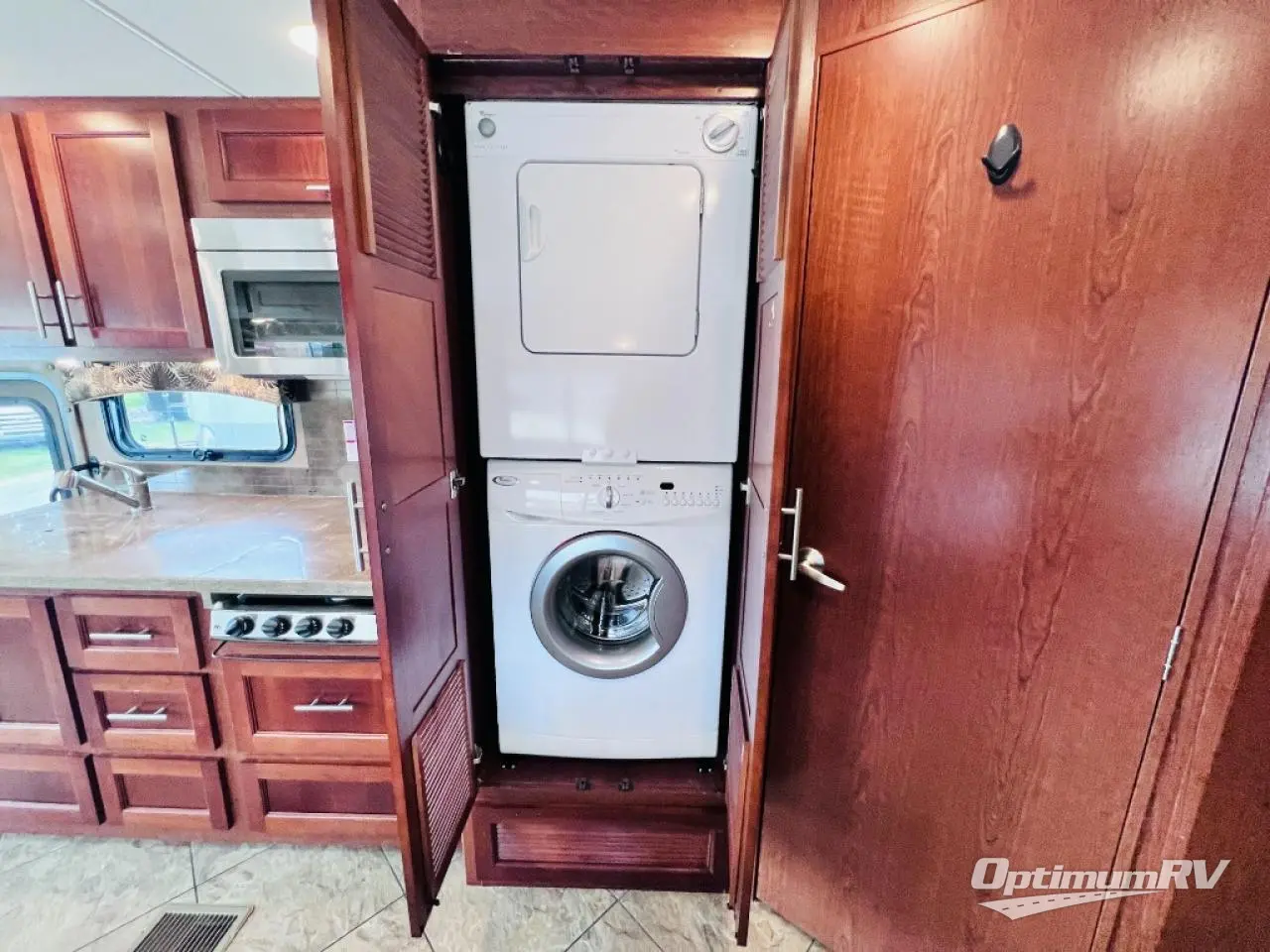 As you enter the motor home, the passenger side has a 32" LED TV, double kitchen sink, three burner range, microwave, and is washer and dryer prepped. The driver's side of the motor home offers a full wall slide with a sofa, booth dinette, refrigerator, pantry with adjustable shelves, closet, two shirt wardrobes, a chest of drawers, and a LED TV in the bedroom.