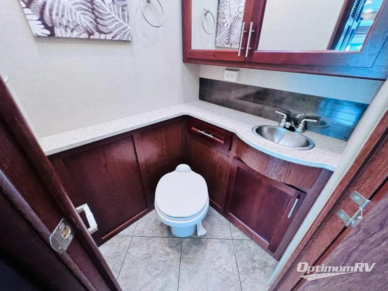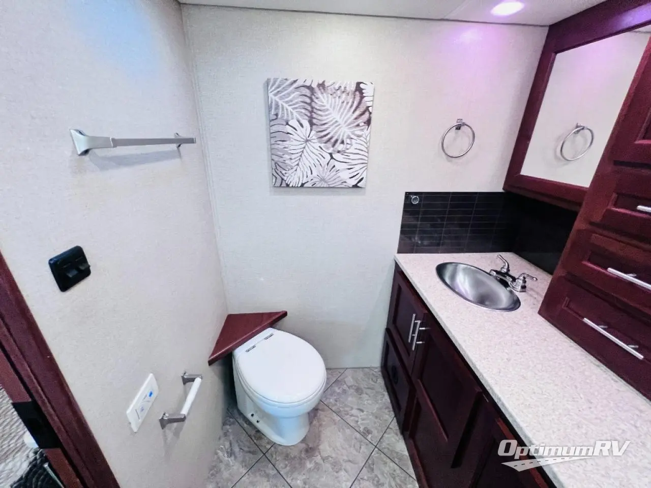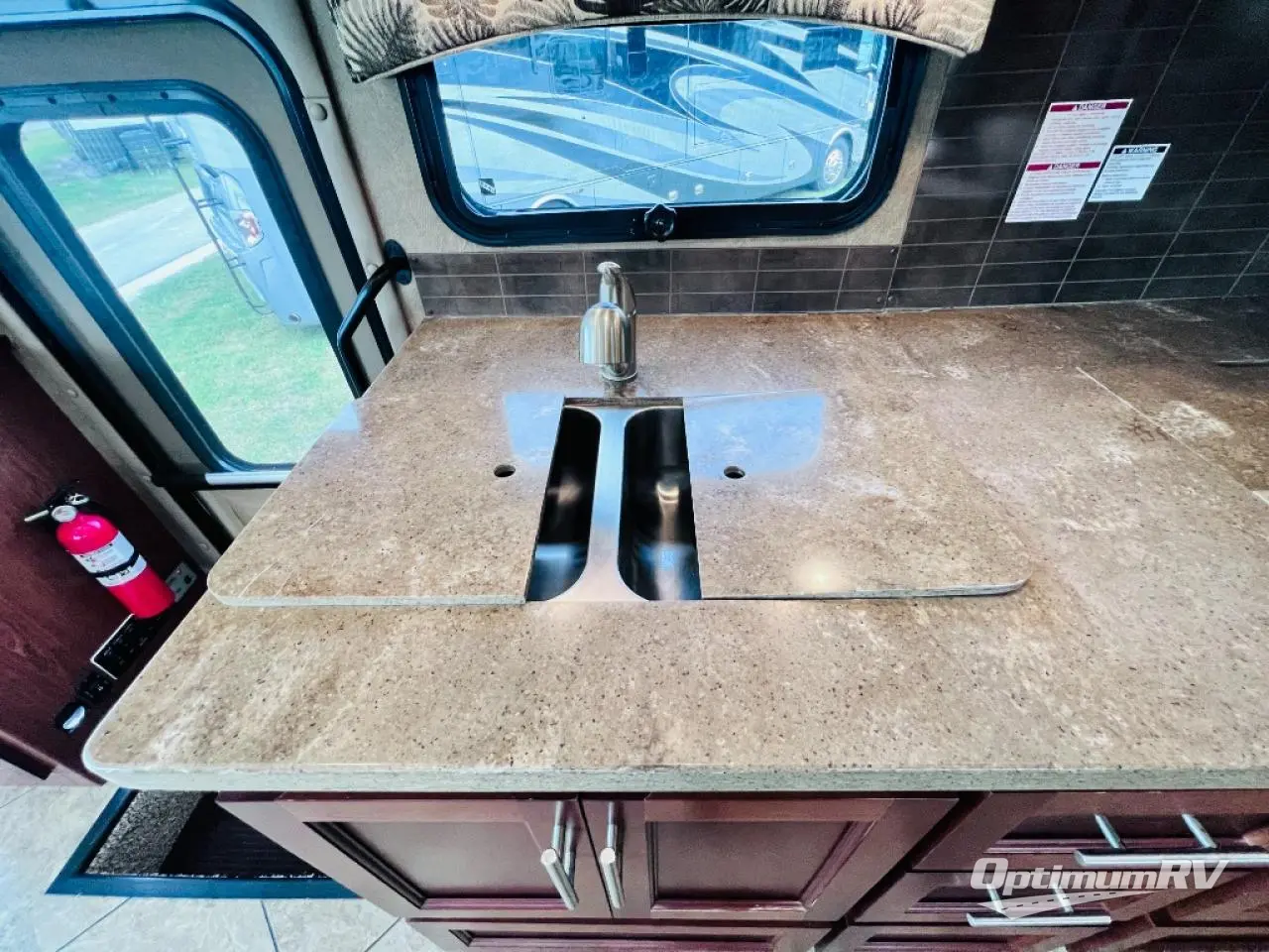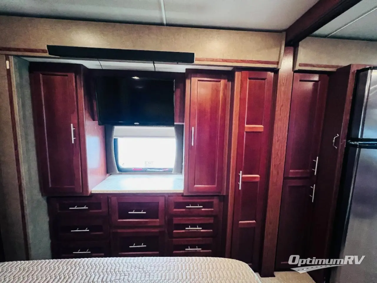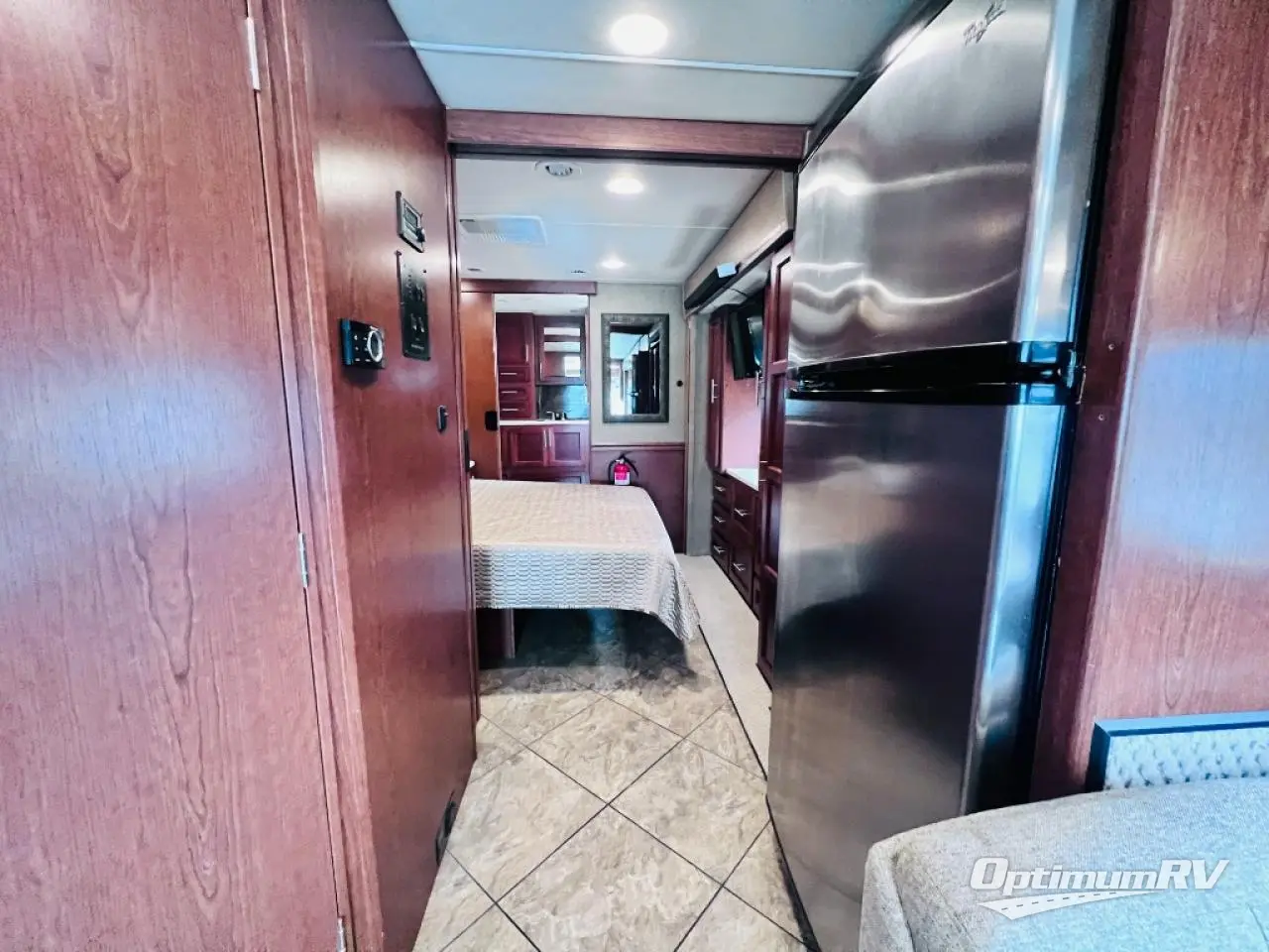 As you enter the motor home, the passenger side has a 32" LED TV, double kitchen sink, three burner range, microwave, and is washer and dryer prepped. The driver's side of the motor home offers a full wall slide with a sofa, booth dinette, refrigerator, pantry with adjustable shelves, closet, two shirt wardrobes, a chest of drawers, and a LED TV in the bedroom.